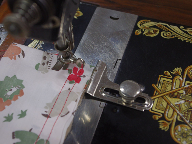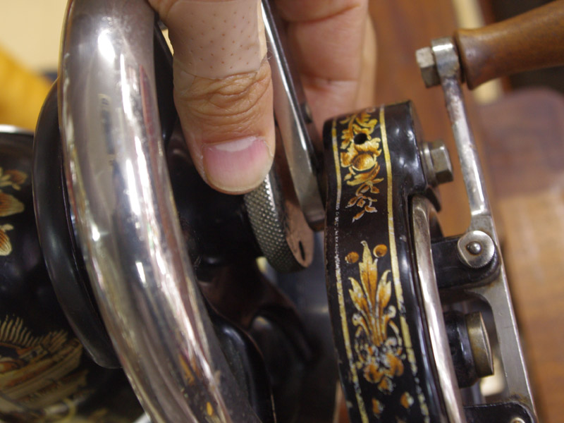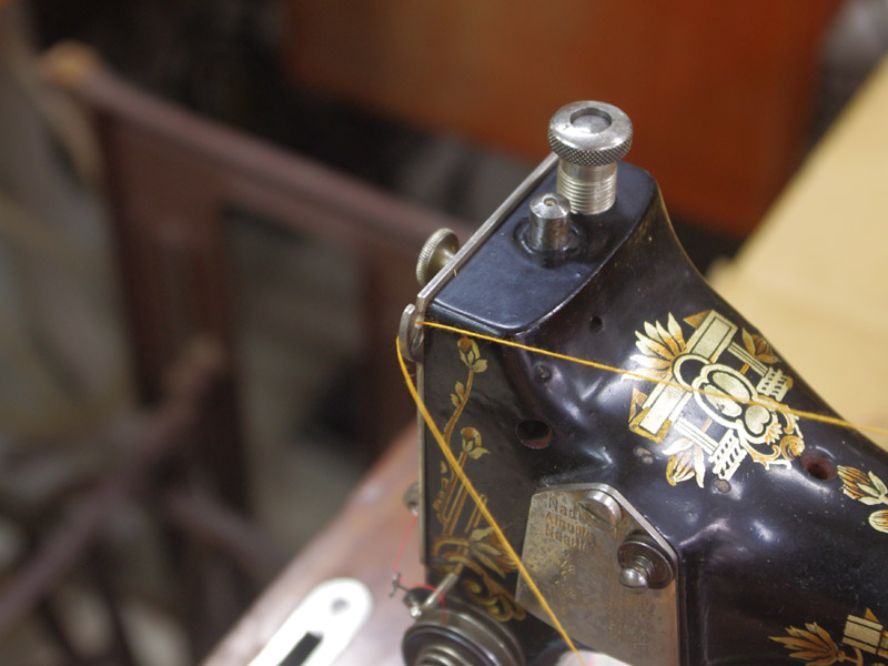 20.あとは他のミシンと同じく押えを上げて、針を1回上下させて下糸を引き出し、生地を押えの下に置いて押えを下げて、ハンドルを回すだけです。