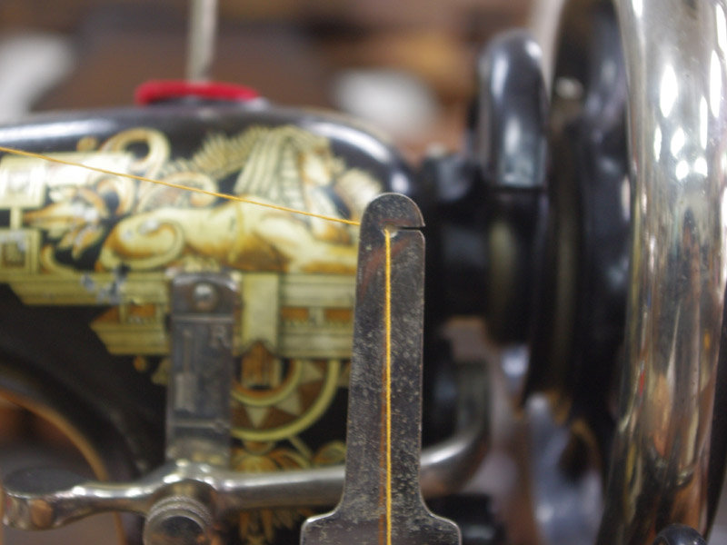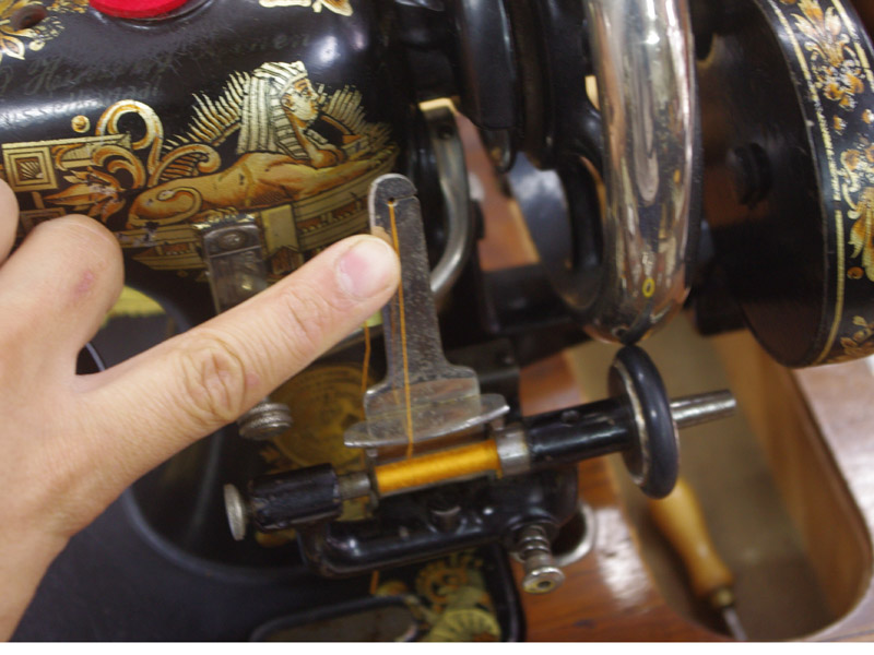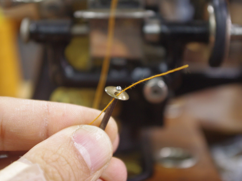 11.糸が円弧状の縁を滑るようにして左右に振られ、ボビンに均等に糸が巻かれていきます。