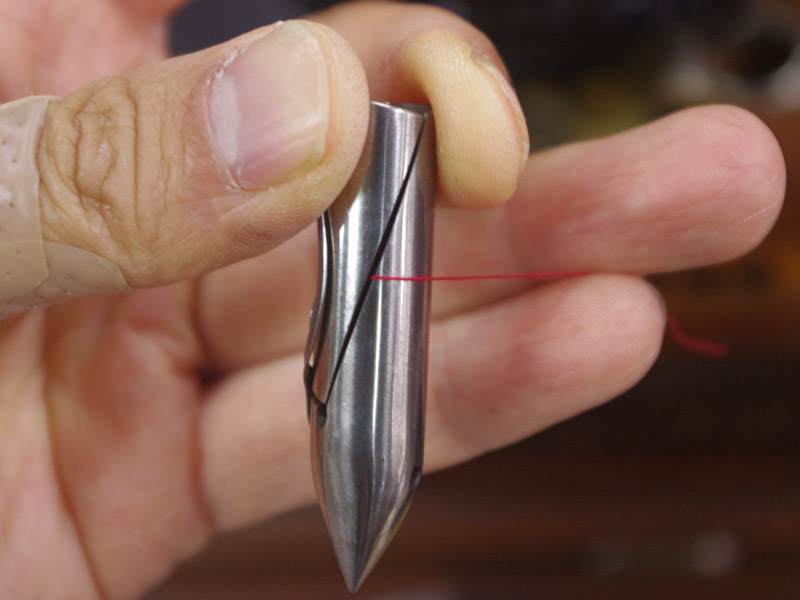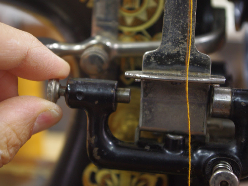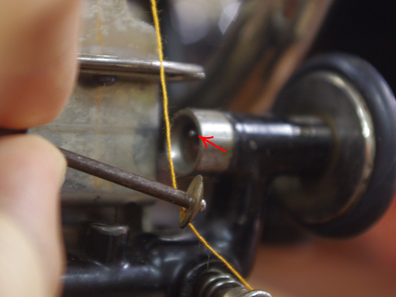 2.下糸巻きの金具の溝に掛けます。※1を省略して糸巻きから直接こちらでも良いです。