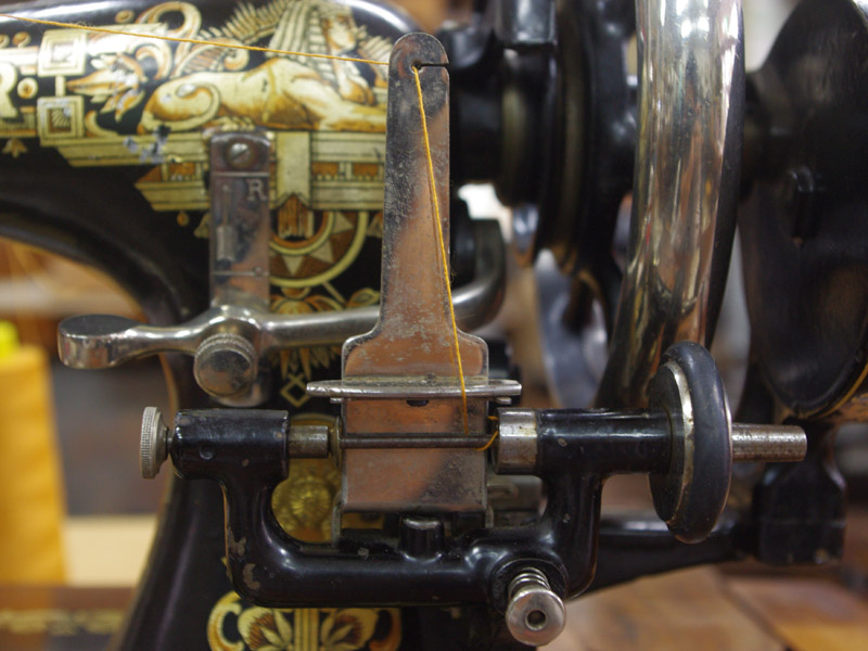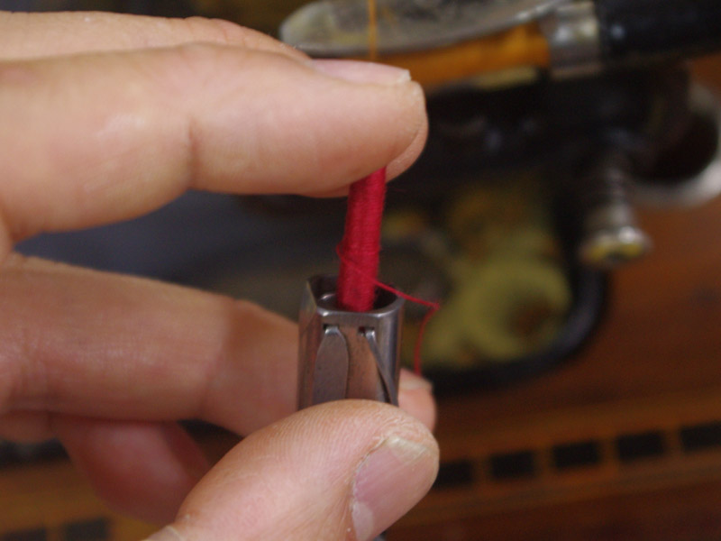 19.最終的に糸が写真のようになっていれば準備はOKです。糸の端を10センチほど出しておき、再びシャトルをミシンに戻してください。