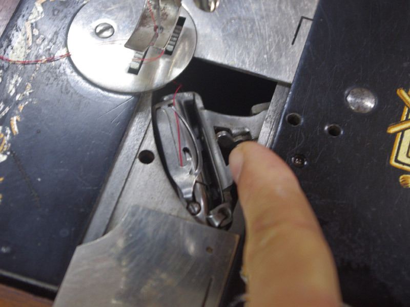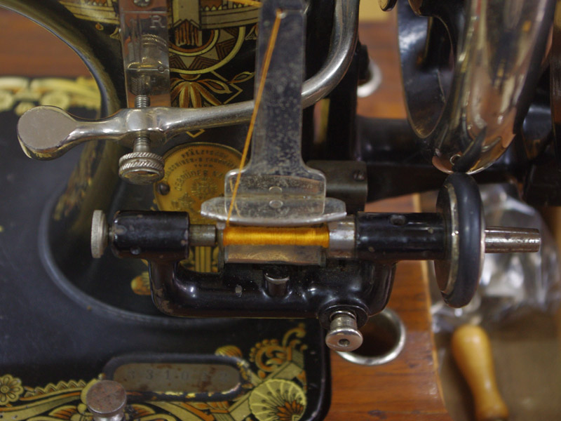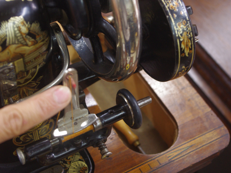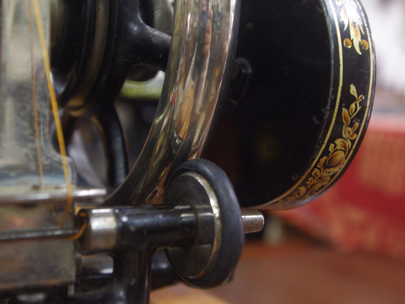 13.カチッと音がした後に指を戻すと、ゴム輪がはずみ車から離れます。あとはボビンを取り外して糸を切って下糸巻きは完了です。