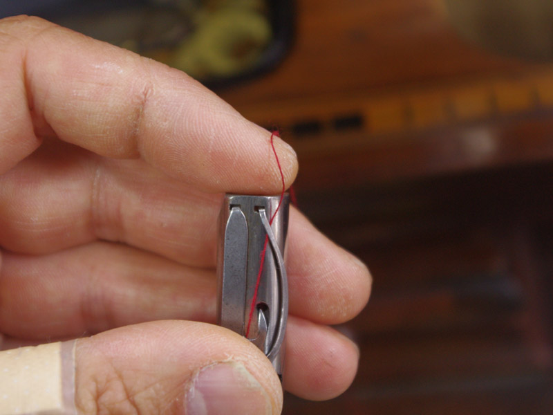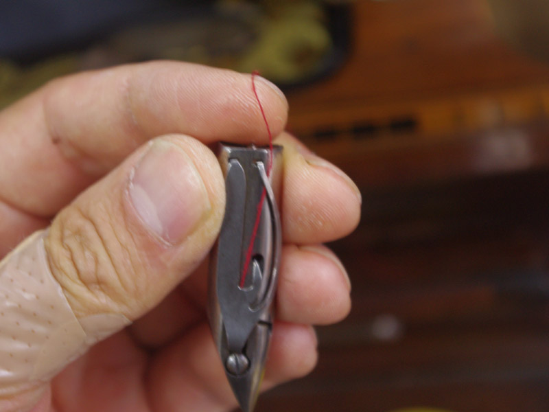 18.シャトルの穴の方へ糸を引っ張ります。このときボビンが回転しないように少し指で穴を押しておくとしやすいです。