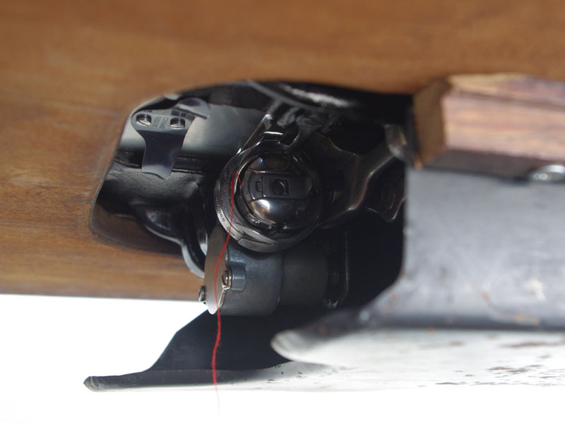 ミシン本体は分解して古い汚れをクリーニングしました。さすがに機械だけあって汚れが蓄積していましたが、きれいになりました。油も十分に差して動作も軽くなっております。ボビンケースは正面から入れるタイプで、ミシン針も穴が前後になるように取り付けます。現代の家庭用ミシンと同じですね。