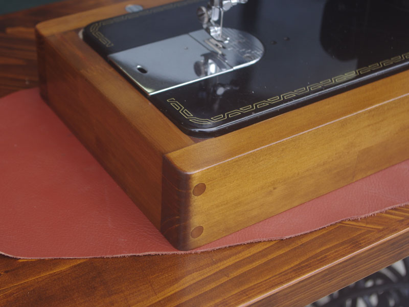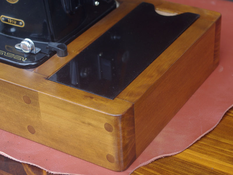 木製ベースは当店にて製作いたしました。厚めの無垢集成材を使用しておりますので重いミシンを置いても安定して使用できるかと思います。使用した塗料は天然のシェラックニス。アンティーク家具に使用されていた塗料で、時間が経つとあじわいが出てきたり、ホルムアルデヒドなど化学物質を吸着したりという特徴のある塗料です。