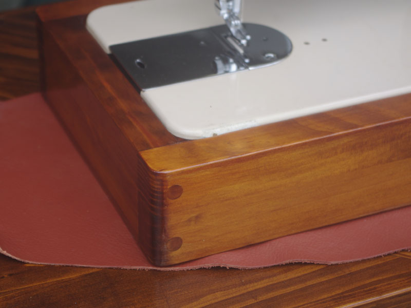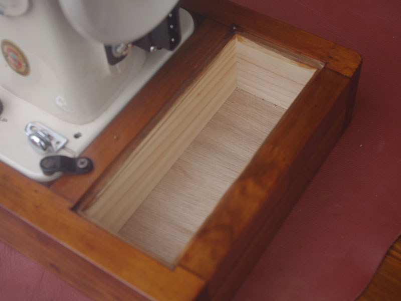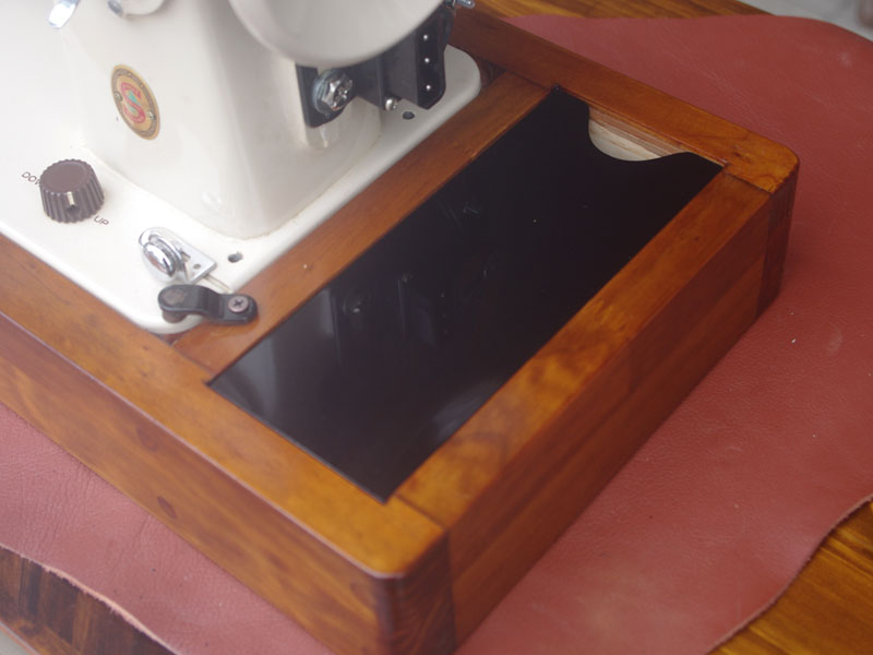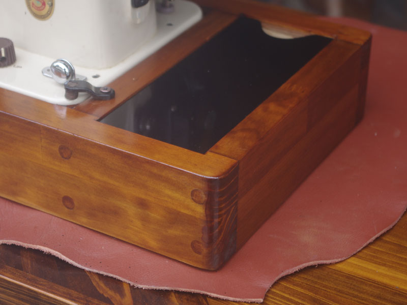 木製ベースは当店にて製作いたしました。厚めの無垢集成材を使用しておりますので重いミシンを置いても安定して使用できるかと思います。使用した塗料は天然のシェラックニス。アンティーク家具に使用されていた塗料で、時間が経つとあじわいが出てきたり、ホルムアルデヒドなど化学物質を吸着したりという特徴のある塗料です。