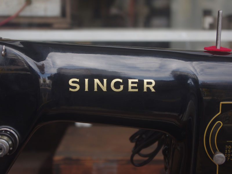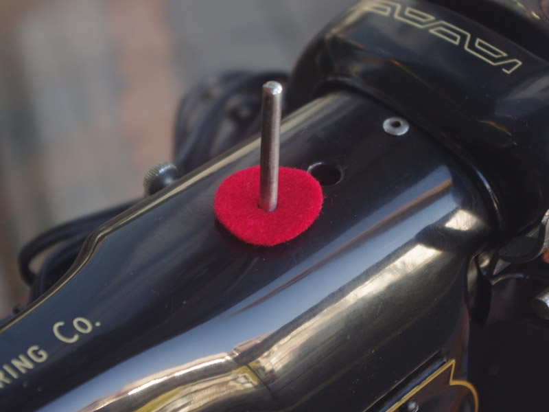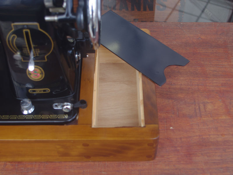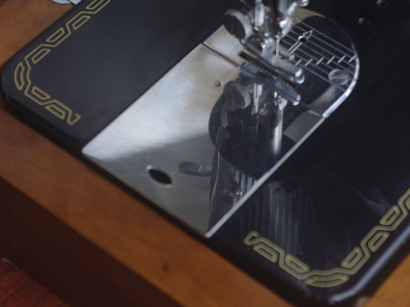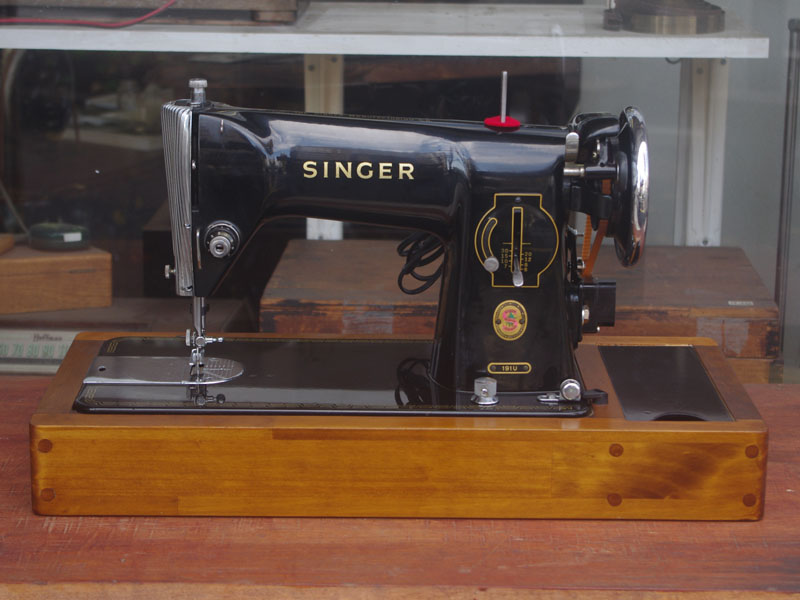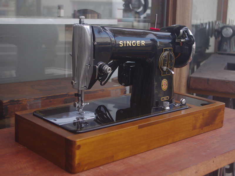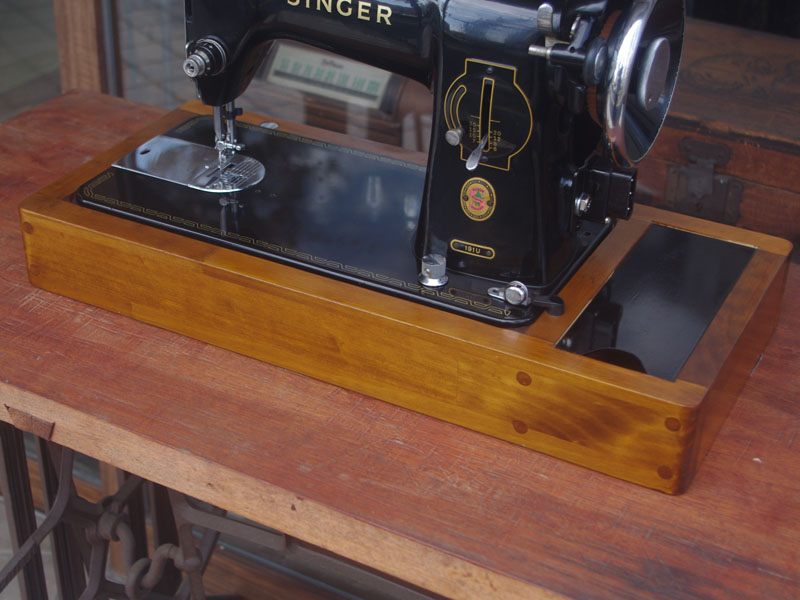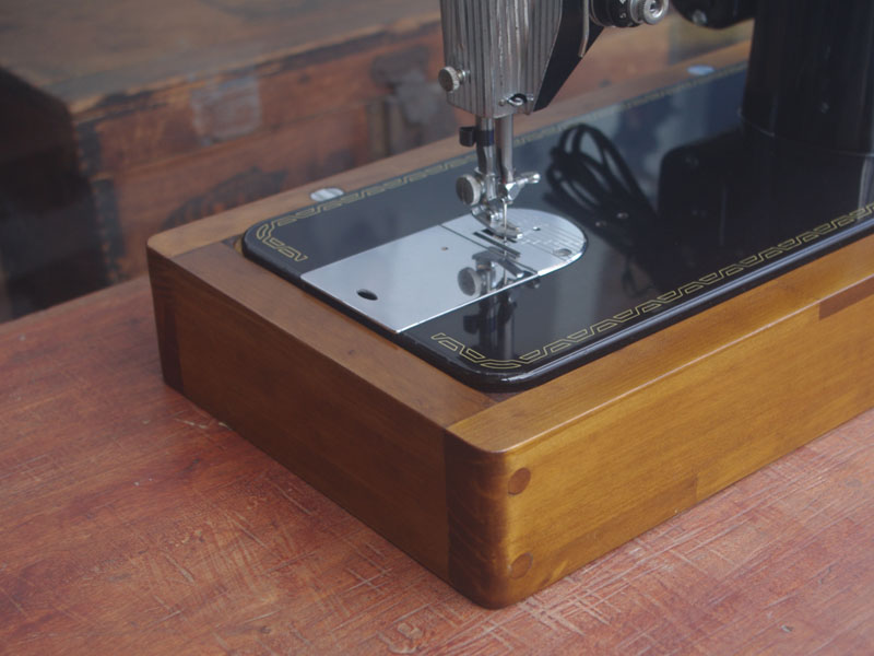 木製ベースは当店にて製作いたしました。厚めの無垢集成材を使用しておりますので重いミシンを置いても安定して使用できるかと思います。使用した塗料は天然のシェラックニス。アンティーク家具に使用されていた塗料で、時間が経つとあじわいが出てきたり、ホルムアルデヒドなど化学物質を吸着したりという特徴のある塗料です。