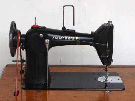 ブラザー製TA1-B18型の職業用足踏みミシンです。ブラザーと言えば昔から知られたミシン製造会社ですね。今や多分野で活躍する大企業ですが、その根っこはミシン製造から始まっています。こちらの職業用ミシンTA1-B18は終戦後間もない頃に製造されたものですがすでに品質は欧米のミシンに比肩していて、日本の安くて品質の高いミシンらが輸出されたことが、例えばシンガーなどの大ミシンメーカーが弱体化した大きな要因になったと言われています。それにブラザーの創業者はミシンを台から落として壊れなかったら市場に出せ、と言ったという逸話も残っていますので、頑丈さも折り紙付きです。現在に至るまで使用できるということがその証明ですね!