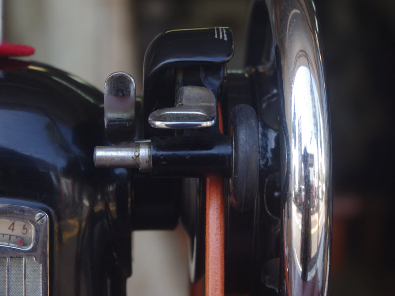 木の部分のコンディションは悪くはありませんでしたが上を向いた面の塗装の劣化は見られました。そこでそれらの面のみ古い塗装を研磨して落とし、傷んだ部分の補修、下地を調整して再塗装いたしました。使用したニスは天然樹脂シェラックニス。熱いカップやアルコール、または花瓶の水などに注意して下さい。脚は分解クリーニングと再塗装および調整をいたしました。文字の部分の色はオリジナルのままです!ベルト車やペダルがスムースに動くように分解しグリースアップ、注油、などをしております。最後にミシン本体とベルトで繋げて動きを確認しております。