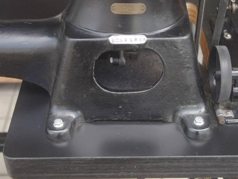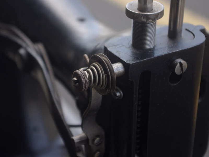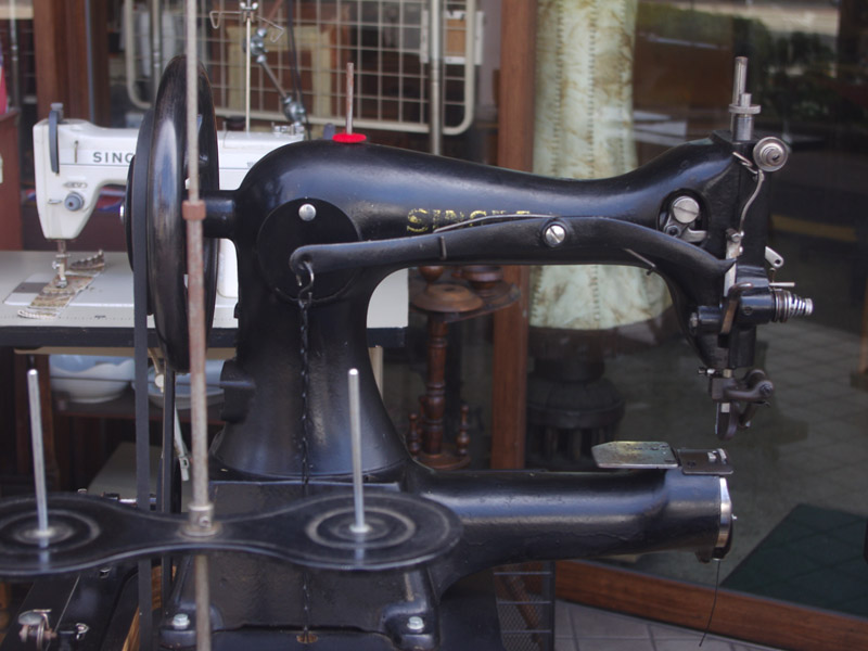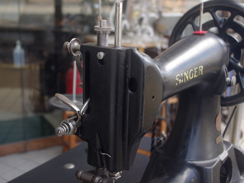 極厚物縫いの工業用ミシン、SINGERのモデル45K25です。厚地というとカーペットや帆布や皮革など、家庭用や職業用ミシンでは歯が立たないような厚い生地を対象にしています。使う針も25番など、もはや針よりも棒と呼んだ方がいいような太さの針まで使用できます。写真の試し縫いで使用している糸は0番糸と、こちらもかなり太い糸になります。生地は重ねて4mmほどの牛革です。写真にはありませんがこの厚さの生地でも下糸もしっかりと引き上げております。極厚物を縫うだけあり本体も普通のミシンよりもサイズが大きめです(写真の後ろのミシンと比較してみてください)。45Kにはフラットベッドとシリンダーアームの2種類があり、こちらは袋物にも向いているシリンダーアームのタイプです。
