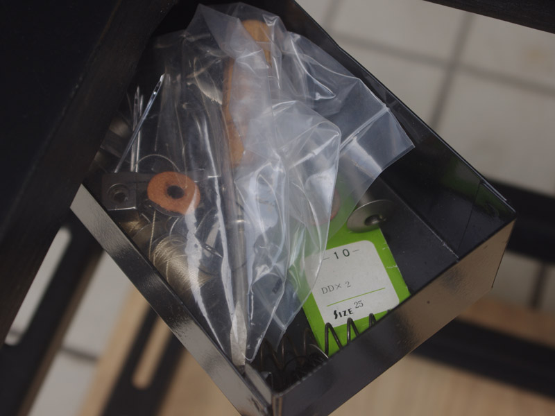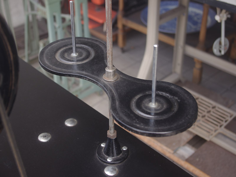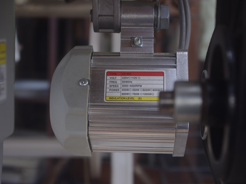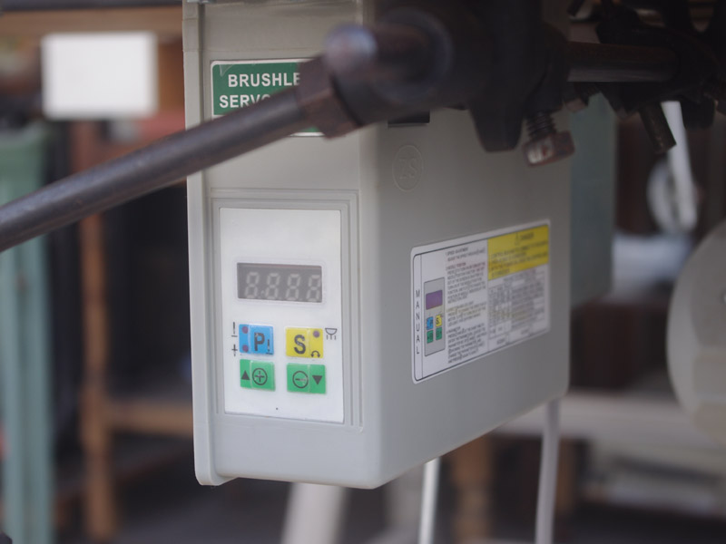 機械は分解掃除をして調整いたしました。下糸巻き機はミシン本体の横、テーブルの上に取り付けられています。モーター仕様で1000Wサーボモーターが付いております。進む速度はモーター側で遅く設定できるので慣れない方も安心して縫えるのがサーボモーターの良いところです!ミシン後方に2本糸立てが付いております(納品時は外してお届けします)。