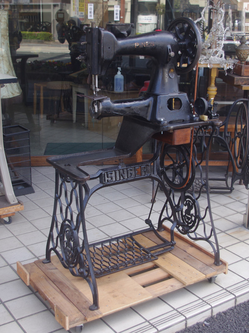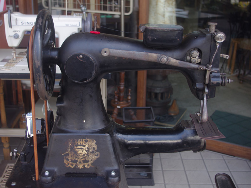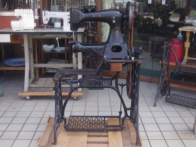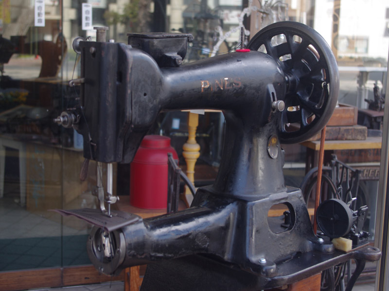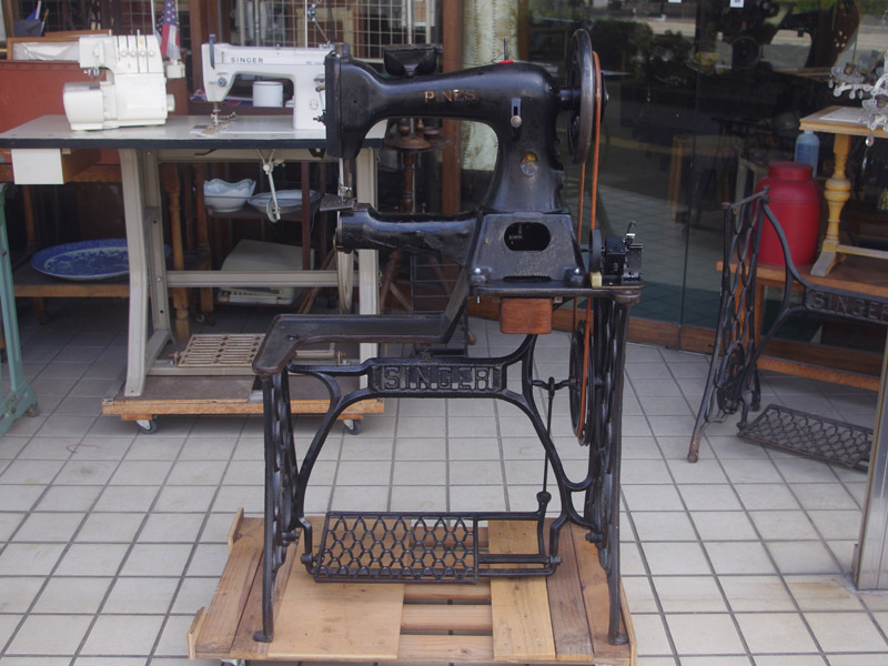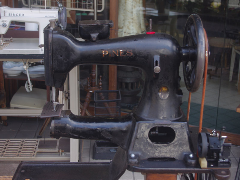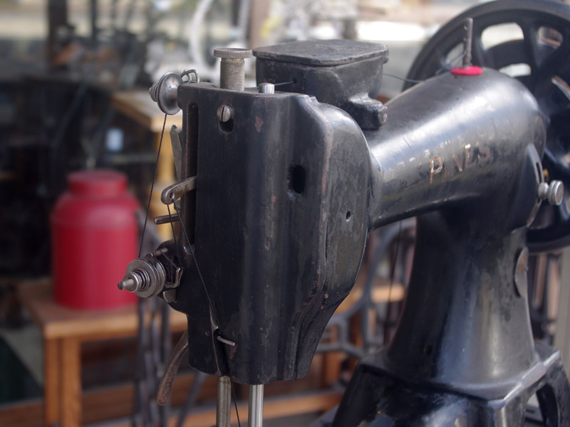 極厚物縫いの工業用ミシン、PINES(パイン)製の足踏みミシンです。SINGERで言うところのモデル45Kと同型になります。帆布・レザー・カーペットなどかなり厚い生地を縫うためのミシンになります。写真の試し縫いは針は25番、糸は0番糸、牛革4mmほどのものを使用して縫っております。写真にはありませんがこの厚さの生地でも下糸もしっかりと引き上げております。極厚物を縫うだけあり本体も普通のミシンよりもサイズが大きめです(写真の後ろのミシンと比較してみてください)。こちらは袋物にも向いているシリンダーアームのタイプです。