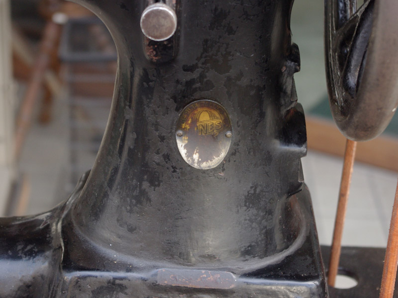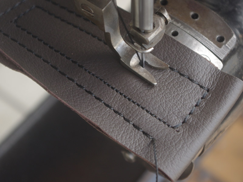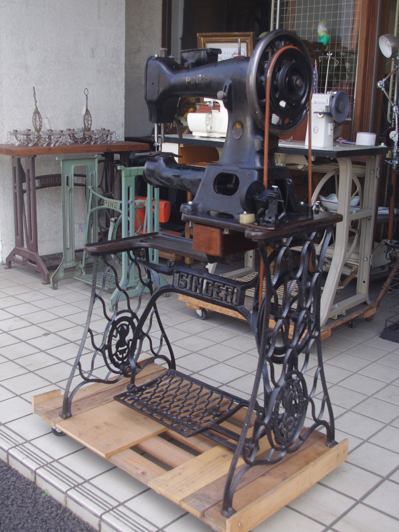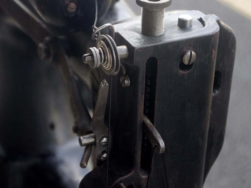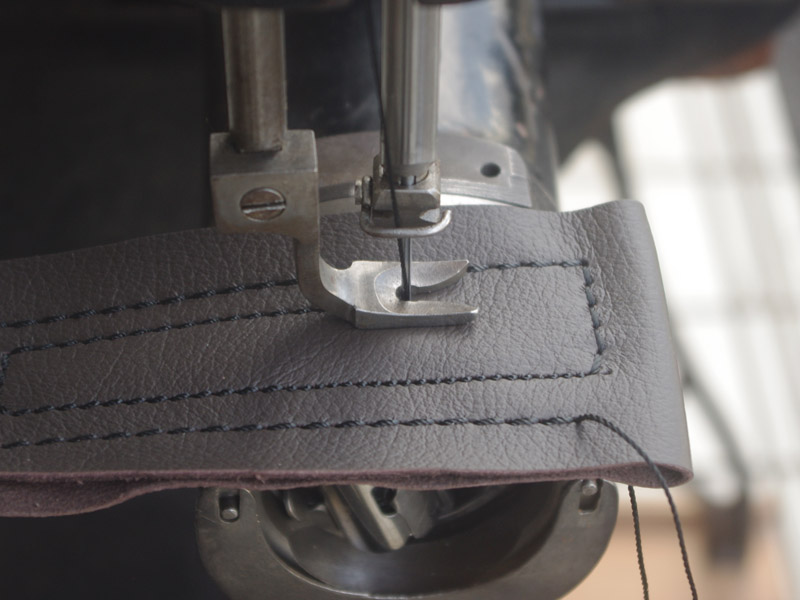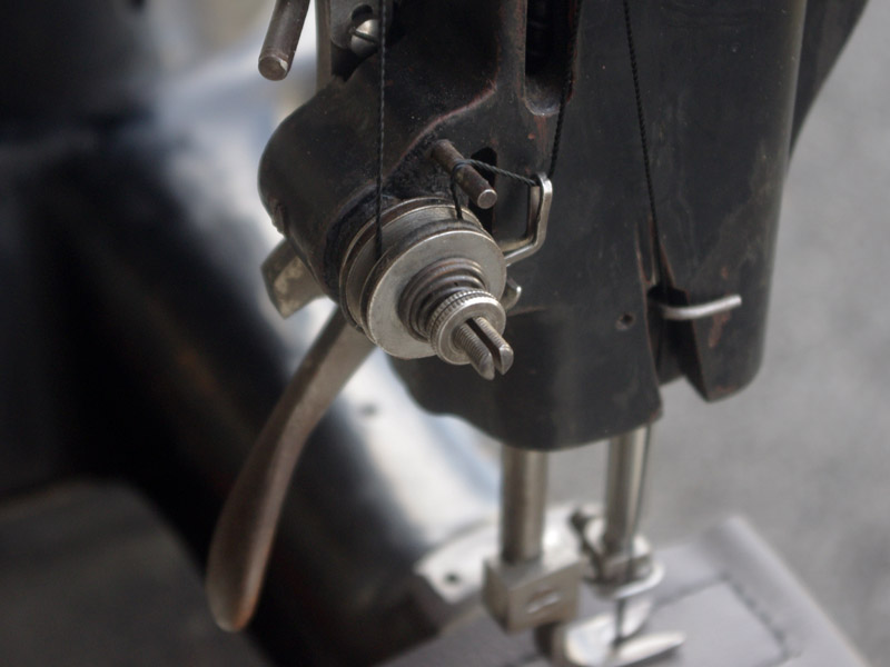 極厚物縫いの工業用ミシン、PINES(パイン)製の足踏みミシンです。SINGERで言うところのモデル45Kと同型になります。帆布・レザー・カーペットなどかなり厚い生地を縫うためのミシンになります。写真の試し縫いは針は25番、糸は0番糸、牛革4mmほどのものを使用して縫っております。写真にはありませんがこの厚さの生地でも下糸もしっかりと引き上げております。極厚物を縫うだけあり本体も普通のミシンよりもサイズが大きめです(写真の後ろのミシンと比較してみてください)。こちらは袋物にも向いているシリンダーアームのタイプです。