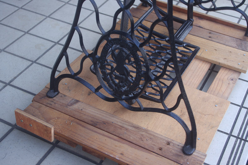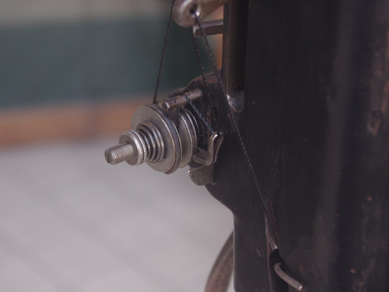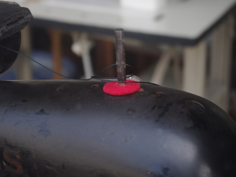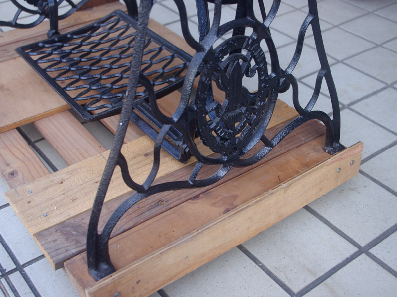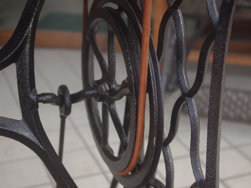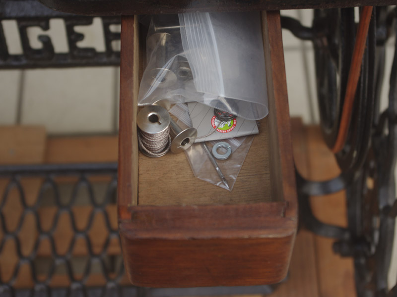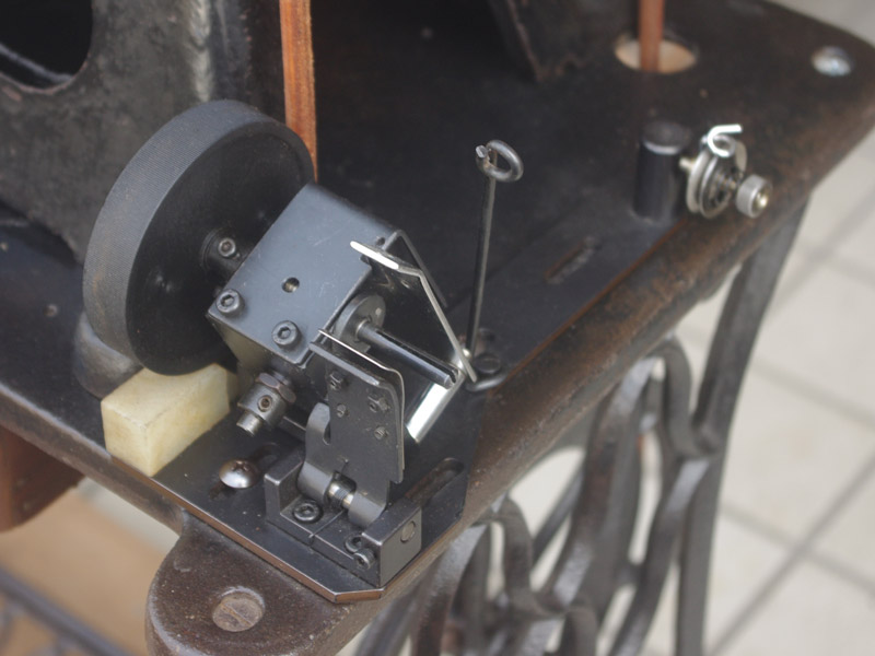 機械は分解掃除をして調整いたしました。下糸巻き機はミシン本体の横、テーブルの上に取り付けられています。脚はもともとは45K用のものではなかったと思われますが、こちらに届いた際にはこのようにシンガー29Kの台に本体が取り付けられており、元の持ち主が足踏みミシンとして使っていたようです。この脚のベルト車は径が小さいく足踏み台の中でもゆっくり進みますので、一つずつ制作するものには向いているミシンかと思います。