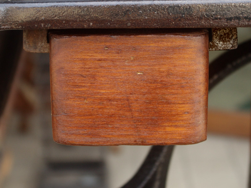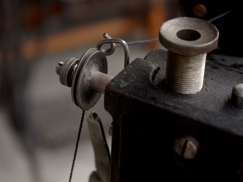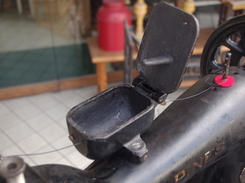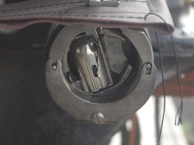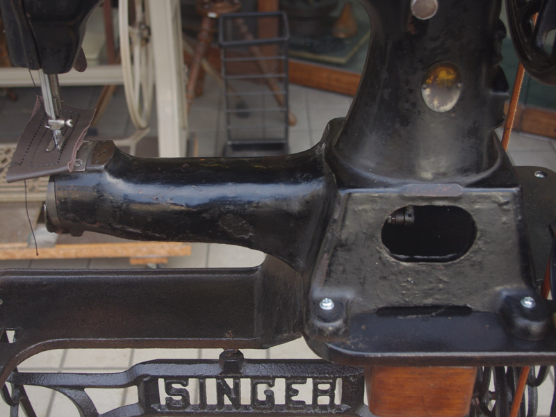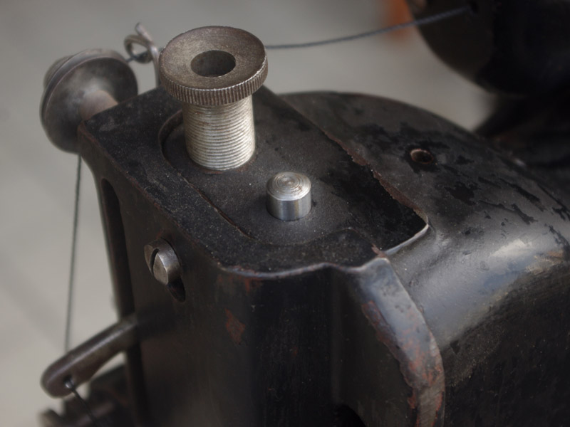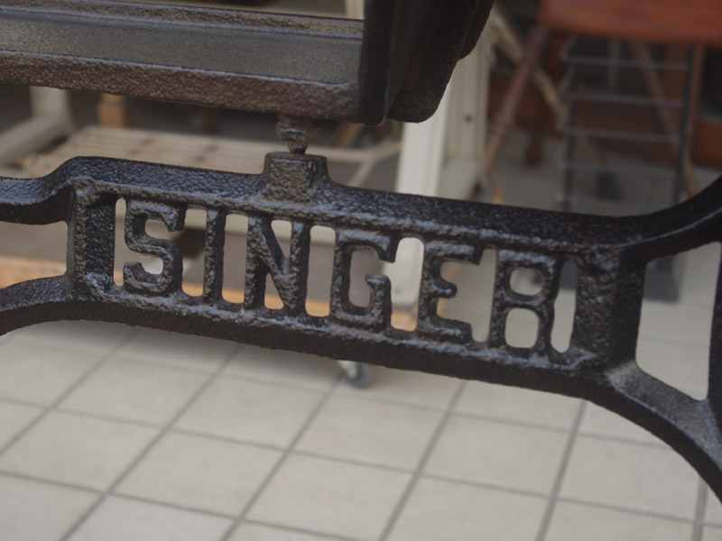 機械は分解掃除をして調整いたしました。下糸巻き機はミシン本体の横、テーブルの上に取り付けられています。脚はもともとは45K用のものではなかったと思われますが、こちらに届いた際にはこのようにシンガー29Kの台に本体が取り付けられており、元の持ち主が足踏みミシンとして使っていたようです。この脚のベルト車は径が小さいく足踏み台の中でもゆっくり進みますので、一つずつ制作するものには向いているミシンかと思います。