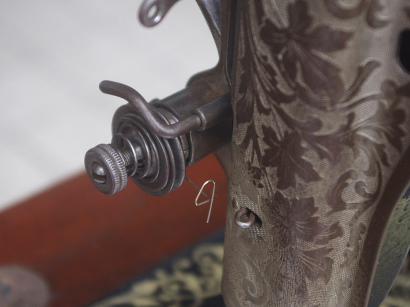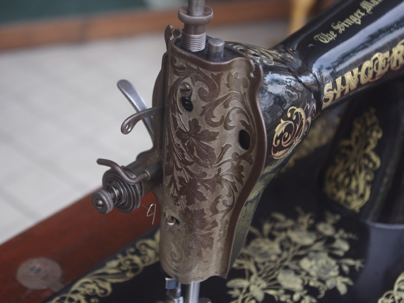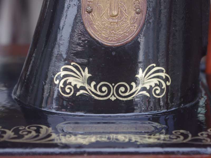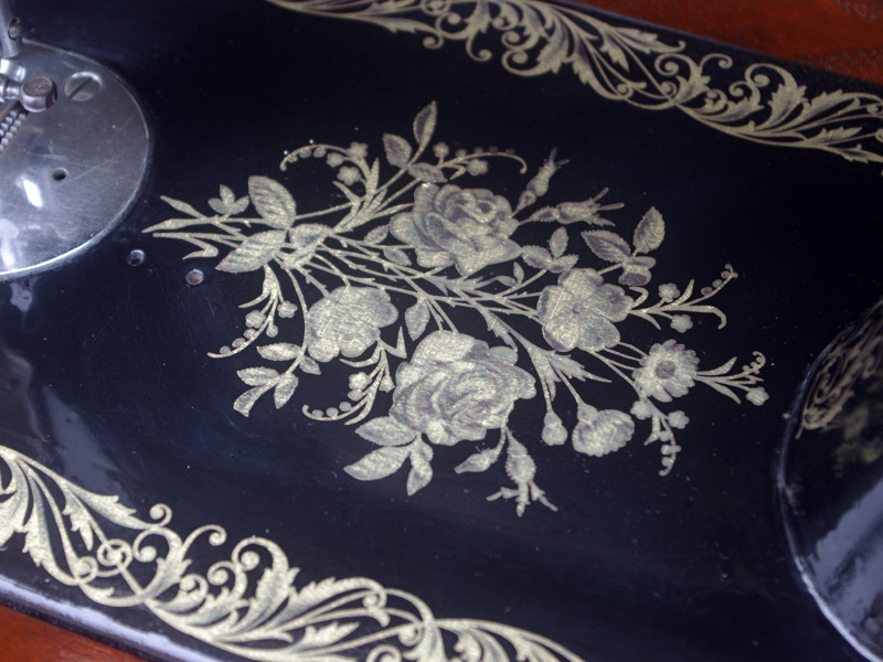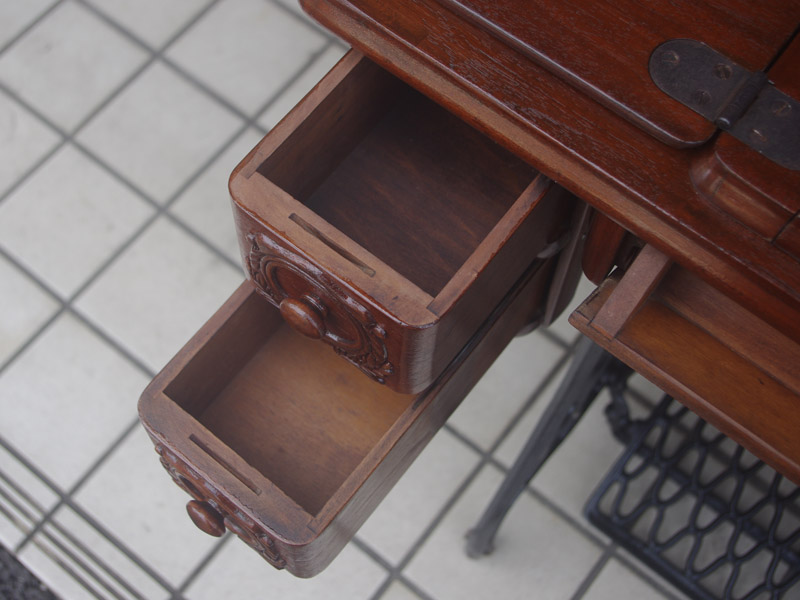 家庭用のシンガー製の足踏みミシンです!薔薇の模様は本当に昔ごくごく僅かにシンガーで使われた絵柄で、当店にて復刻をいたしました。まだ世界に数台しかございません!!黒に金色の模様は高級感を漂わせますね。台は左右が2段の引き出しがあり彫刻もあしらわれているより高級なものとなっております。樹種はマホガニーかそれに類する気が使われています。ちょっとビター寄りなチョコレートのような色味で、ミシン本体と合わせると高級感が増す気がします!網脚とも本体の植物模様は良くマッチします!
