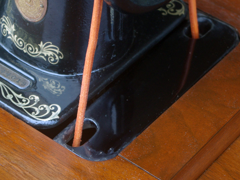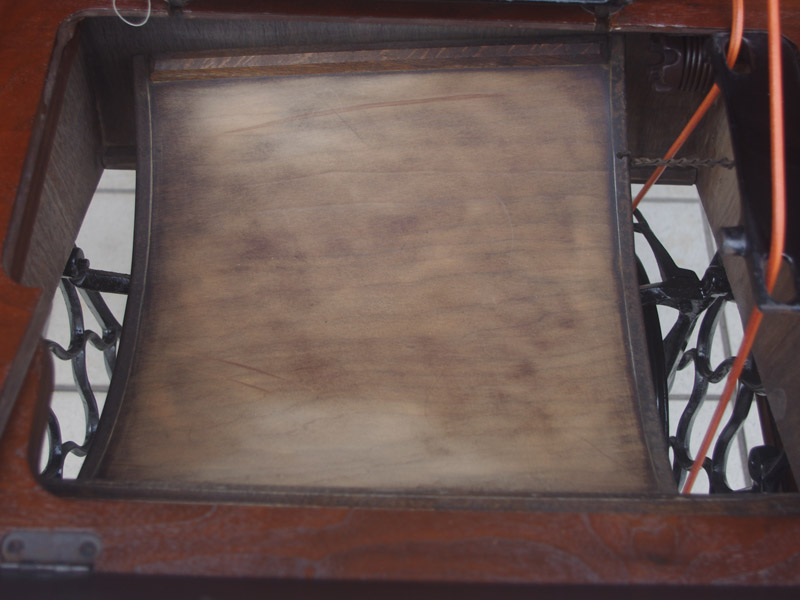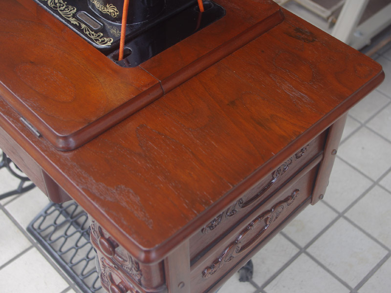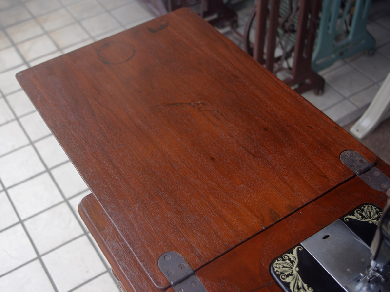 古い塗装の研磨後は色むらを抑えるため植物由来のステインを使用して色味を調整し、天然樹脂シェラックニスで塗装をいたしました。古くから使用される天然の塗料で、アンティーク家具の補修や塗装に使われてきました。天然素材で石油系シンナーなども使用しておらず、またホルムアルデヒドの吸着効果もあると言われています。ただ、熱やアルコールに弱いので、熱いコーヒーカップや消毒アルコールなどを置かないようにしてください。また水気のある花瓶も避けた方がよいでしょう。脚は分解クリーニングをして再塗装いたしました。ペダルの具合や本体との連動の調整もしております。