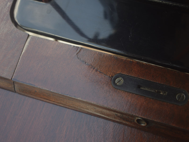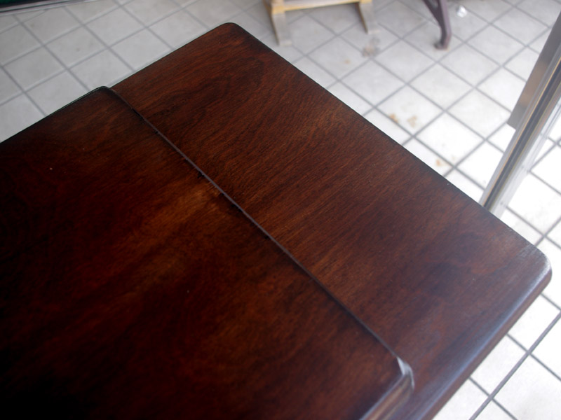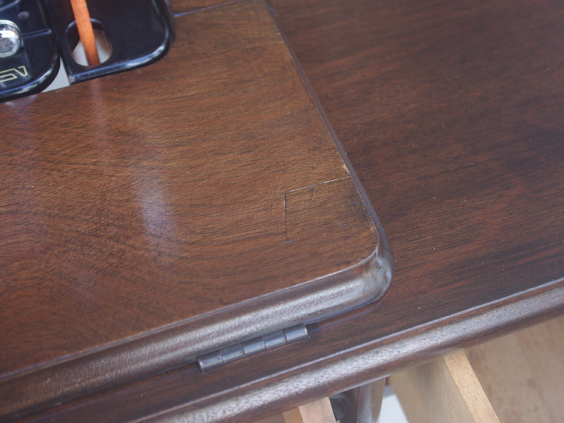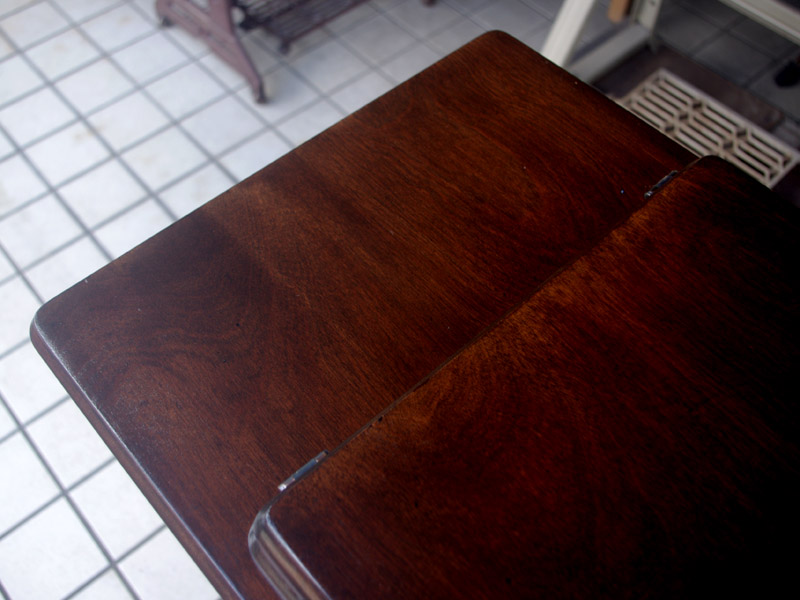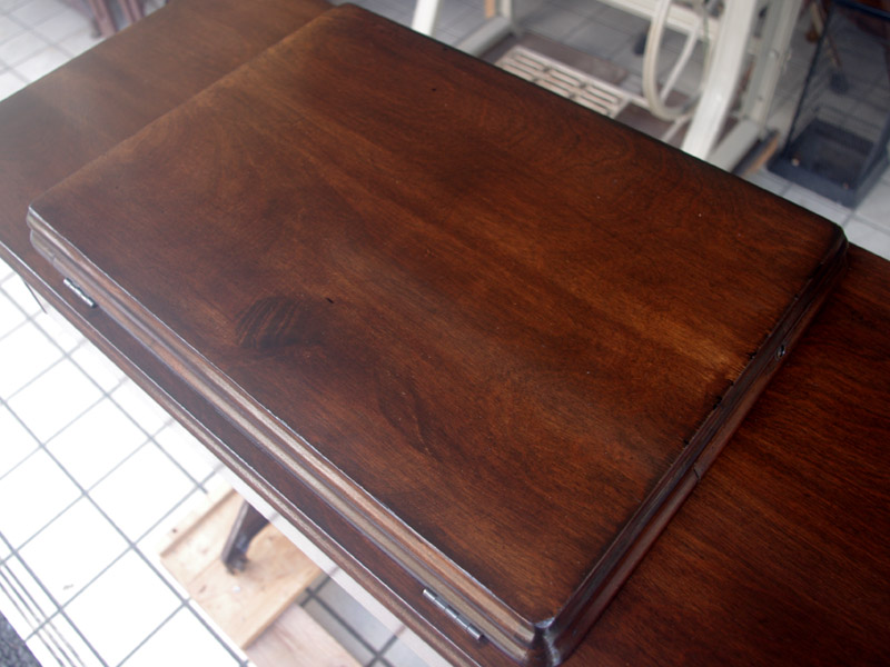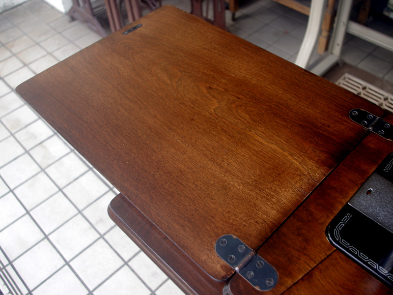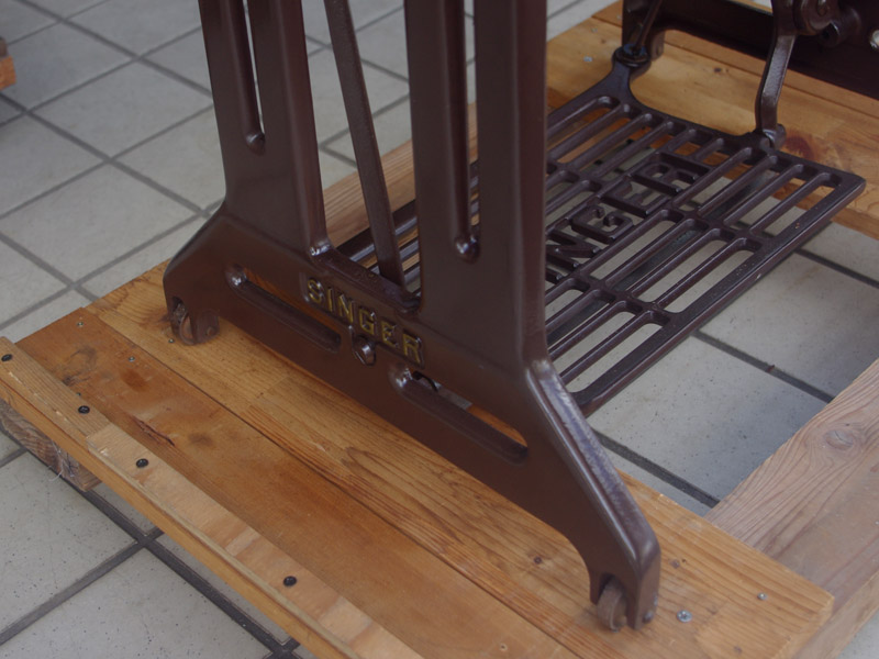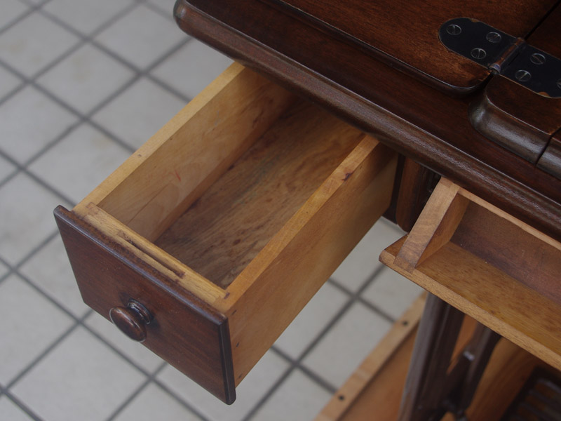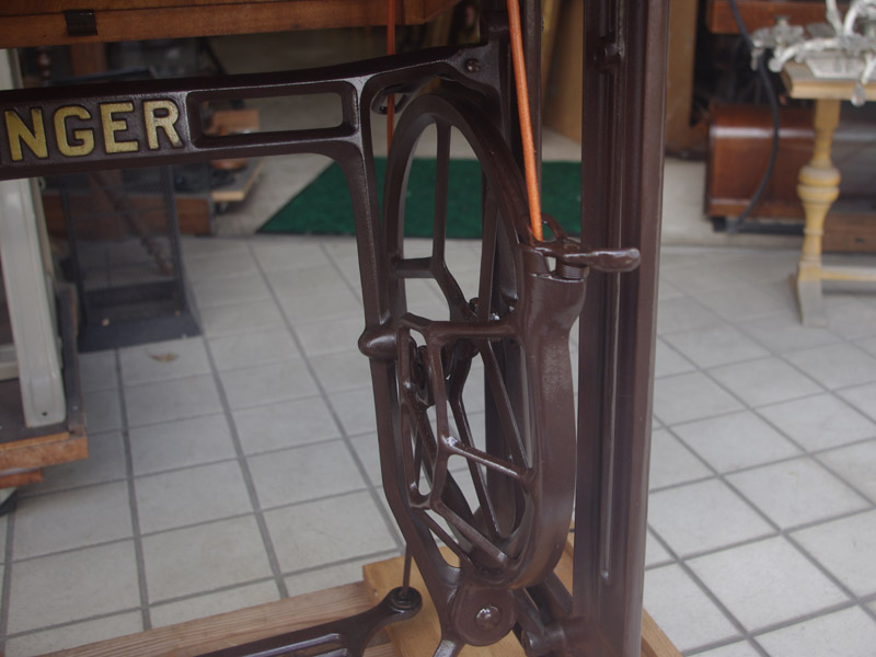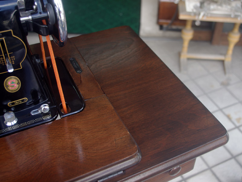 木の部分は補修が必要な箇所は手を入れ、また古い塗装を研磨して落とし、下地を調整して再塗装をいたしました。使用したニスは天然樹脂シェラックニスおよびウレタン。念のため熱いカップやアルコール、または花瓶の水などに注意して下さい。脚は分解クリーニングと一部のみ再塗装、そして調整をいたしました。ベルト車やペダルがスムースに動くように分解しグリースアップ、注油、などをしております。最後にミシン本体とベルトで繋げて動きを確認しております。動作は静かです。