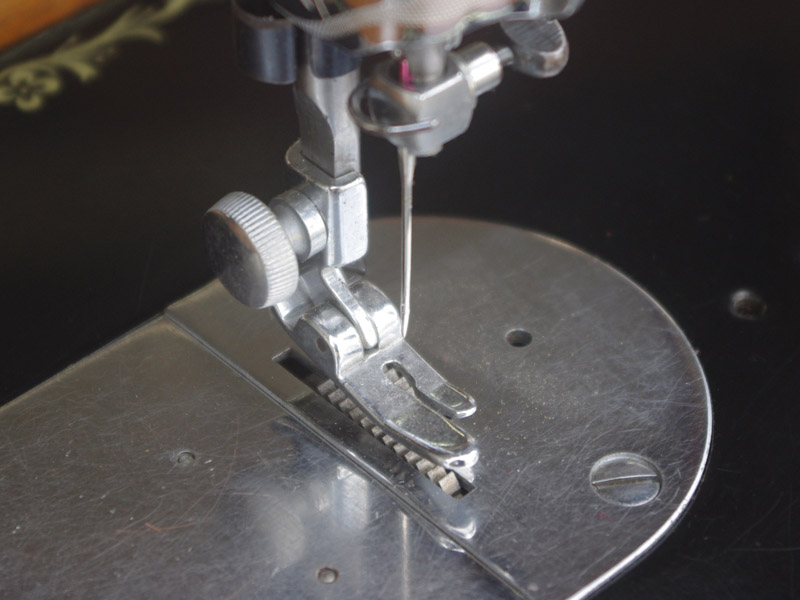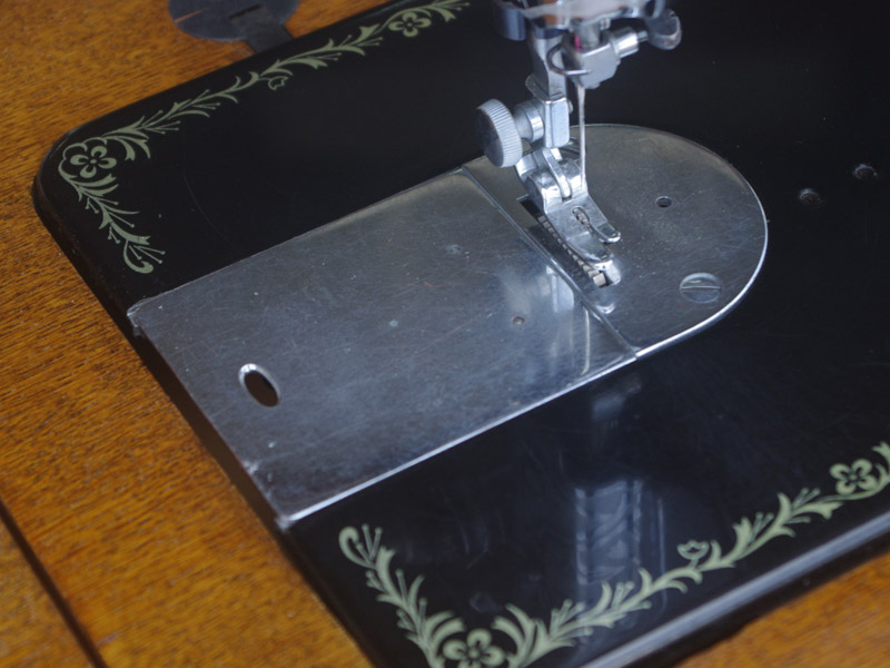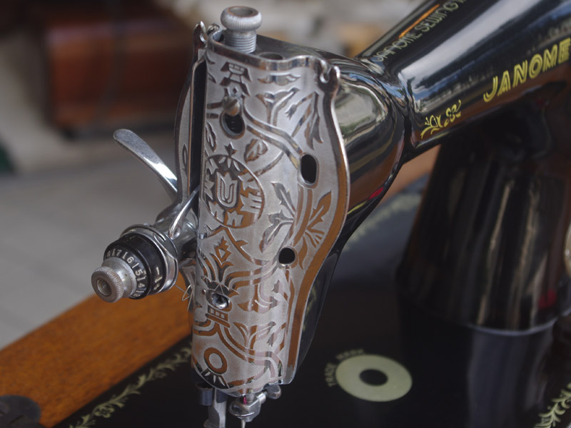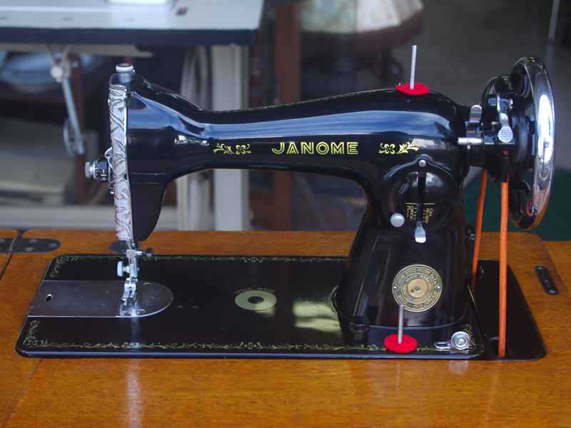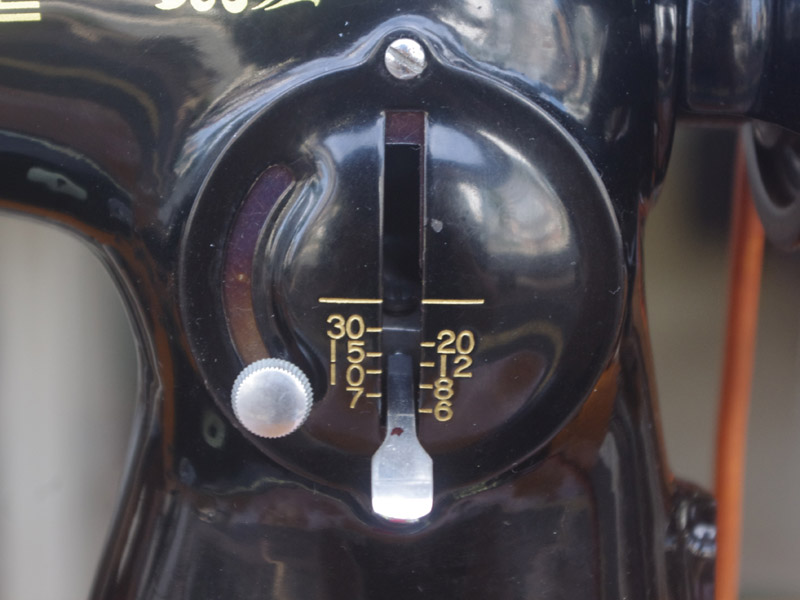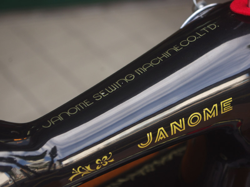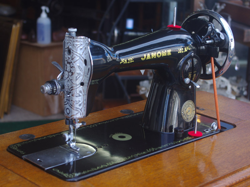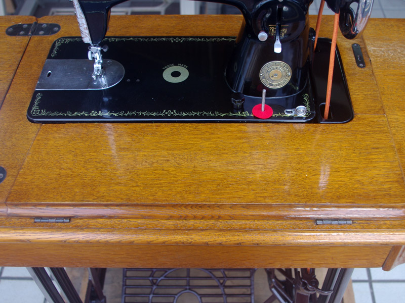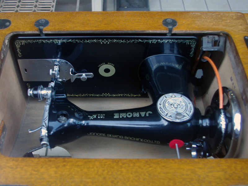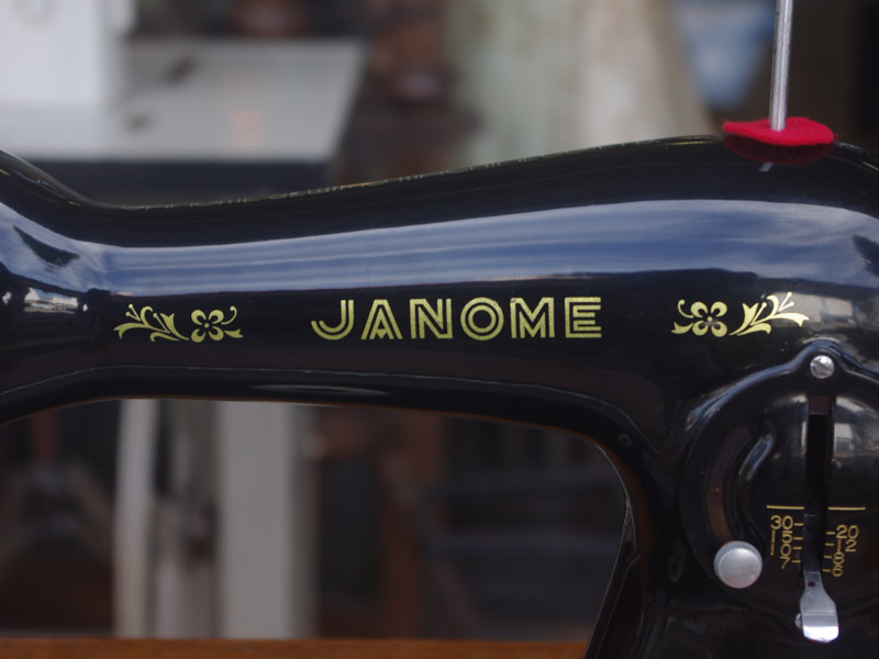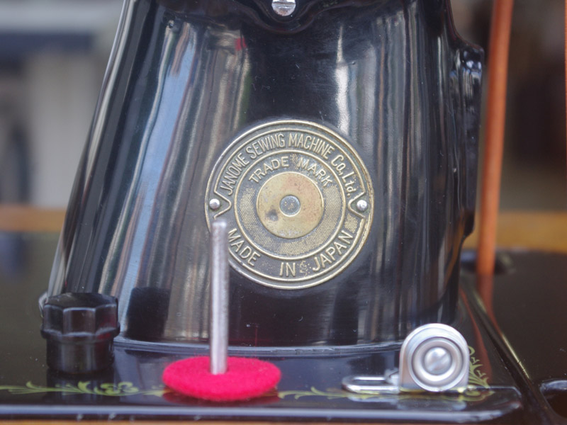 こちらはジャノメ製足踏みミシンです。ジャノメと言えば今でも日本のメーカーとしてミシン製造販売をしている歴史ある会社ですね。こちらのミシンが製造された時代からジャノメの技術力は高く、本機もとても精度よく作られたことがうかがえます。ボディの黒々としたツヤも塗装の良さのお陰です。使い勝手もよく動作は軽くて静か、縫い目は半回転垂直釜らしく整っていて、見た目も実力も備えたミシンだと思います。こちらのミシンも分解掃除をして古い汚れや錆を落としております。また、消耗品は交換、縫製に影響する傷などを取り除き、十分に使用できる状態に整備しております。消耗品である家庭用ミシン針・ボビンケース・ボビンなど市販されています(本体装着品は新品に交換済み)。レバー操作による縫い目長さの調整、また返し縫い機能があります。送り歯の高さを調整するダイヤルも付いています。別途穴かがり器をご用意いただければ、ボタンホールも縫えます!