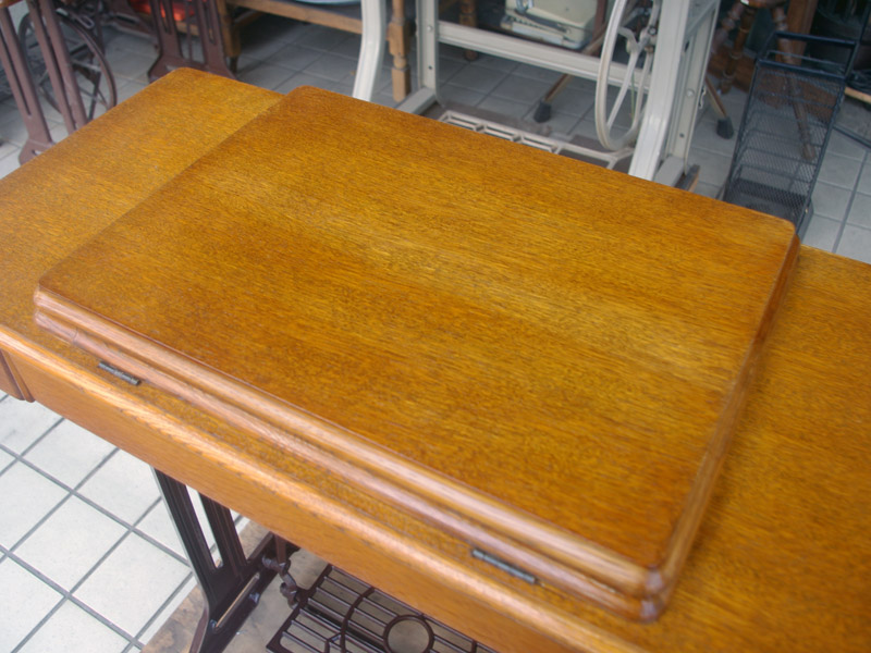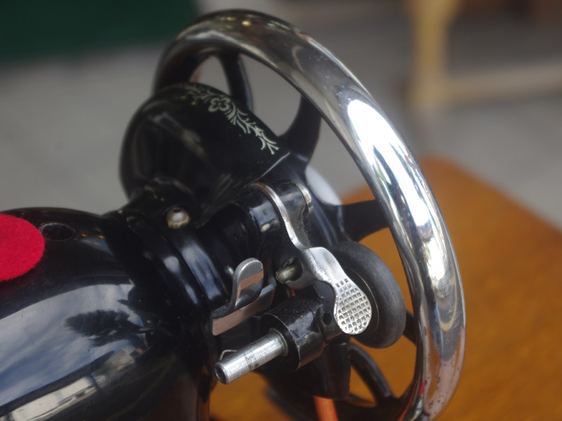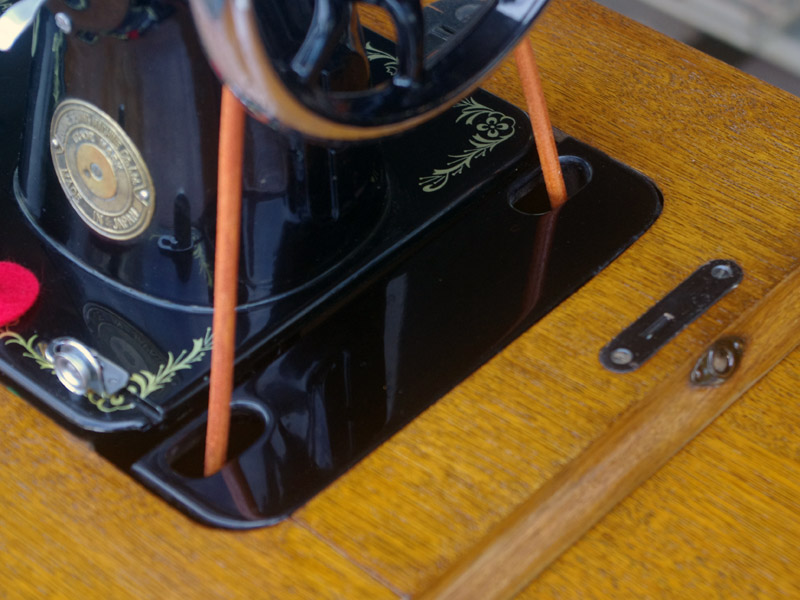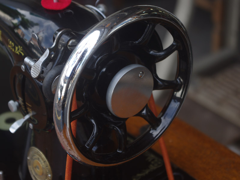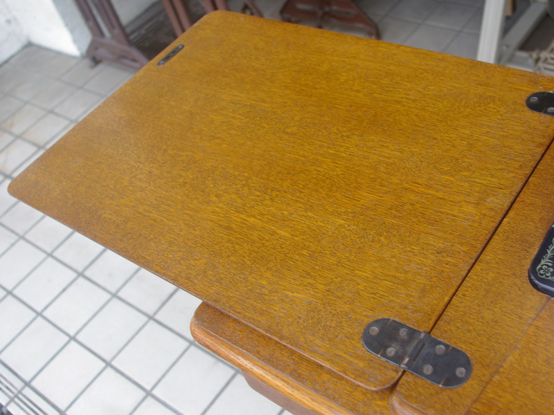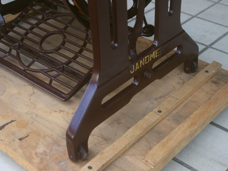 飴色の木製の台も整備して再塗装をしております。黒いミシン本体とツヤのある飴色の台がとてもカジュアルにもビンテージにも合う雰囲気になっています。塗料には天然樹脂シェラックニスおよび摩耗に強いウレタンを使用しました。熱いカップやアルコール、多少の水気は問題ありませんが花瓶の水などには注意して下さい。脚は分解クリーニングと調整、再塗装をいたしました。文字の部分も下の方の写真でご確認いただければと思いますが、金色を入れております。ベルト車やペダルがスムースに動くように分解しグリースアップ、注油、などをしております。最後にミシン本体とベルトで繋げて動きを確認しております。