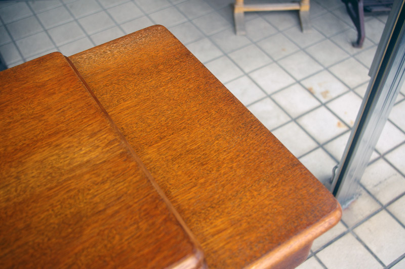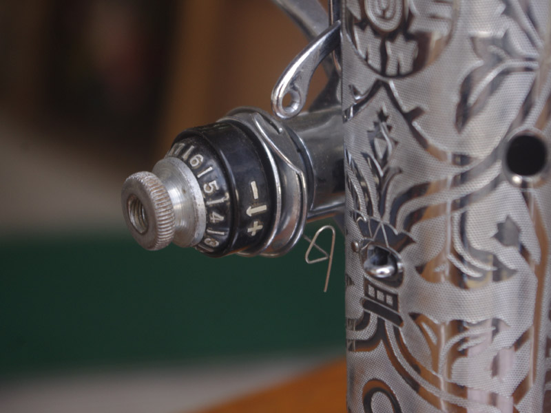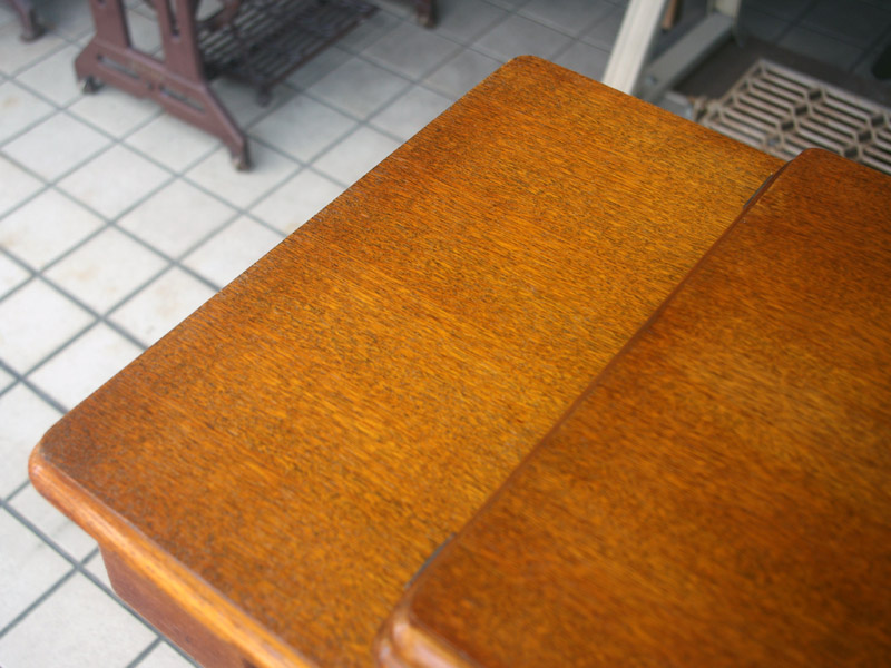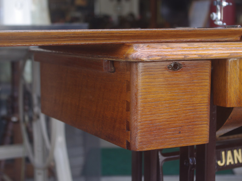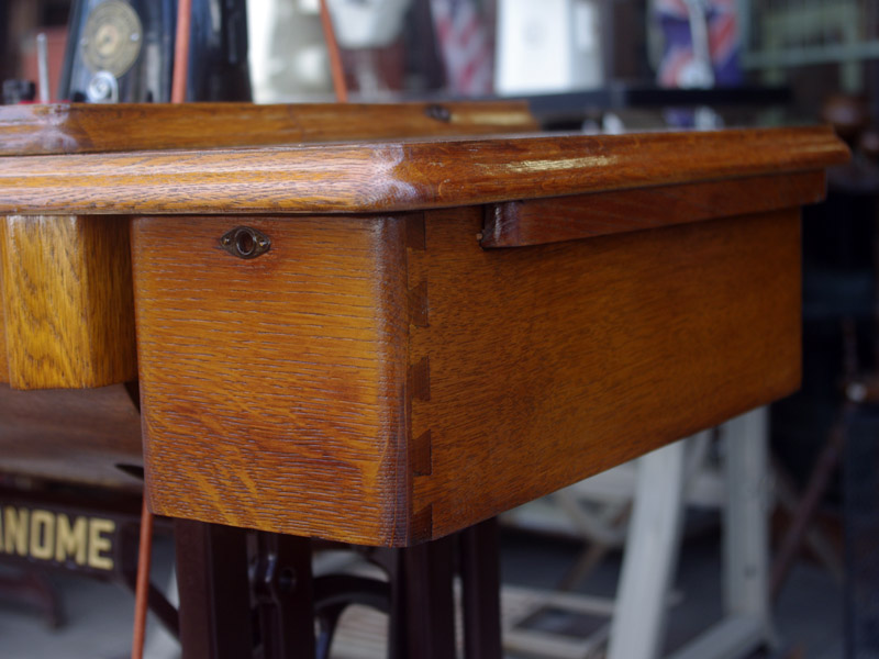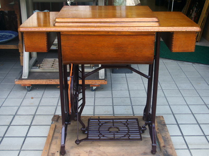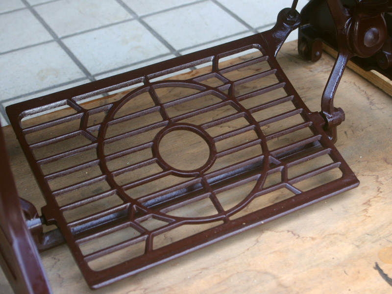 飴色の木製の台も整備して再塗装をしております。黒いミシン本体とツヤのある飴色の台がとてもカジュアルにもビンテージにも合う雰囲気になっています。塗料には天然樹脂シェラックニスおよび摩耗に強いウレタンを使用しました。熱いカップやアルコール、多少の水気は問題ありませんが花瓶の水などには注意して下さい。脚は分解クリーニングと調整、再塗装をいたしました。文字の部分も下の方の写真でご確認いただければと思いますが、金色を入れております。ベルト車やペダルがスムースに動くように分解しグリースアップ、注油、などをしております。最後にミシン本体とベルトで繋げて動きを確認しております。