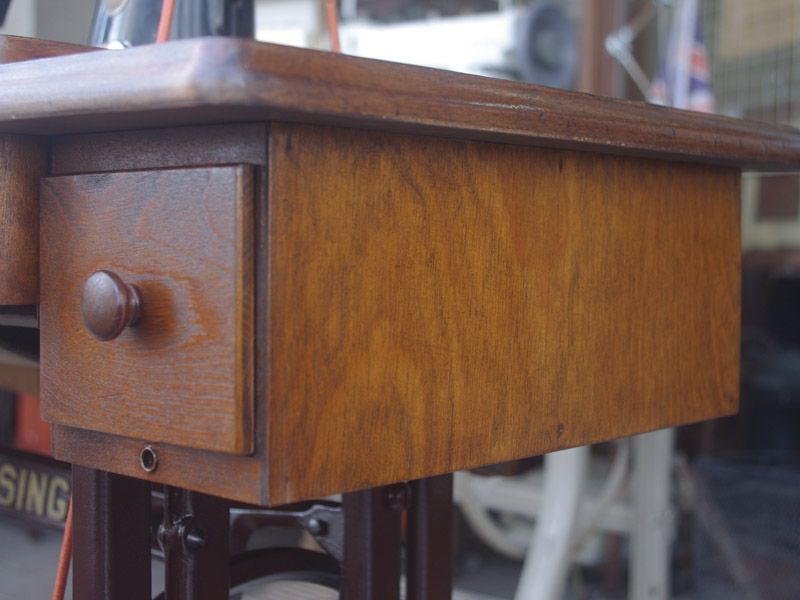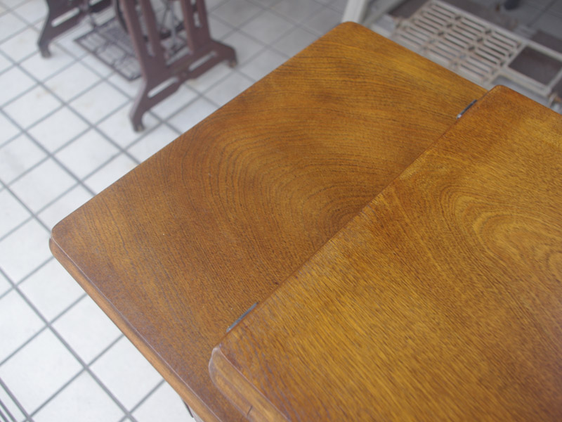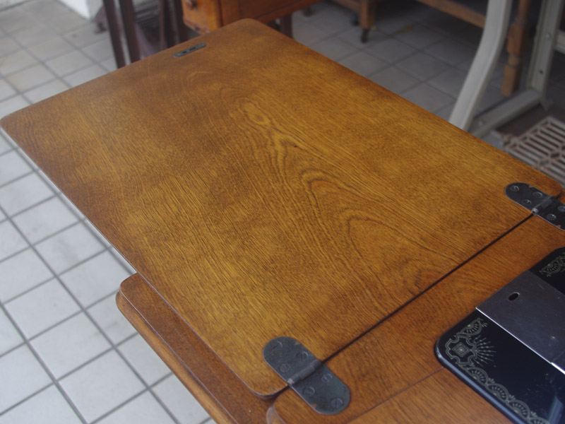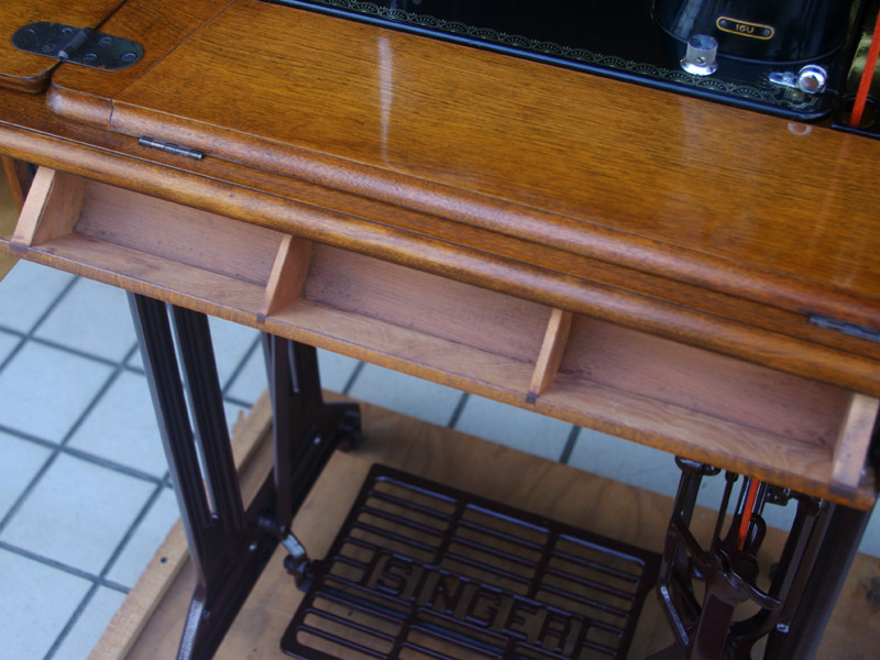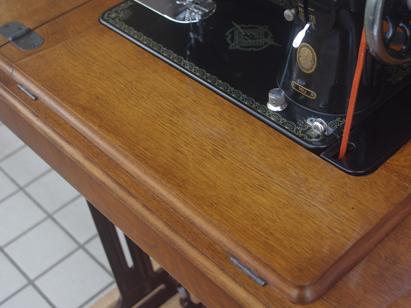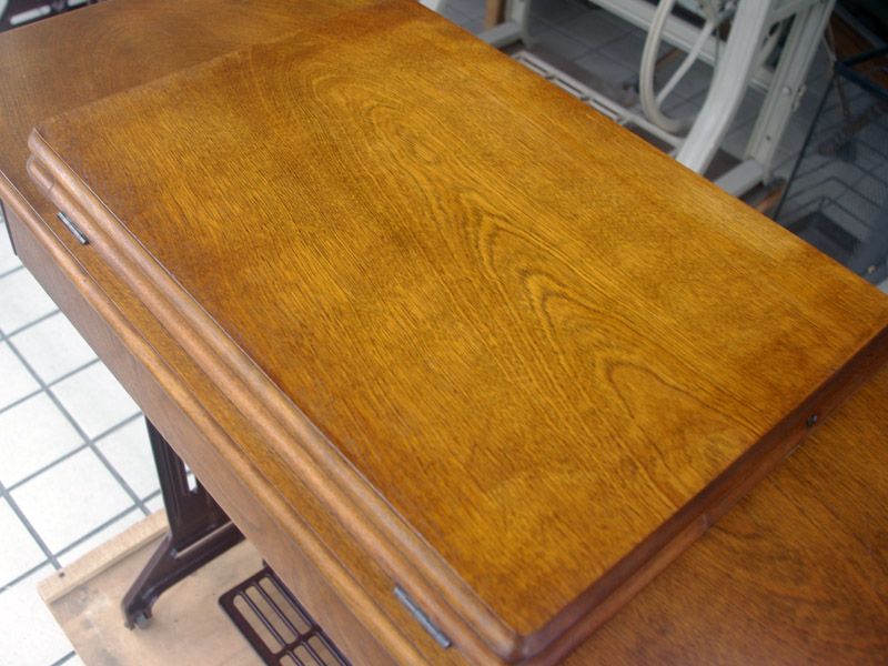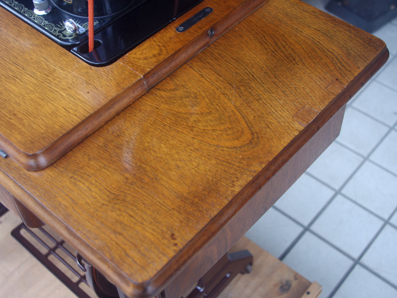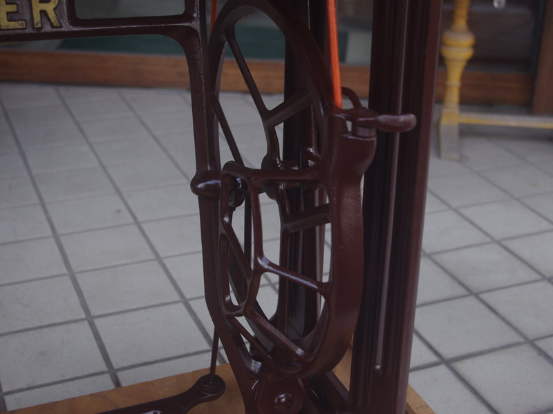 木製部分は傷んでいた部分を補修し、古い塗装を落としたうえで再塗装をいたしました。塗料はシェラックニスおよび耐久性を考えてウレタンでコーティングをしております。脚は塗装の劣化が見られましたので分解クリーニングと再塗装および調整をいたしました。ベルト車やペダルがスムースに動くように分解しグリースアップ、注油、などをしております。最後にミシン本体とベルトで繋げて動きを確認しております。動作は特に静かです。