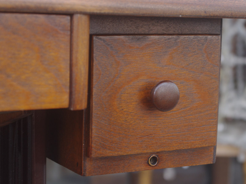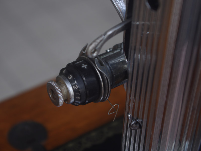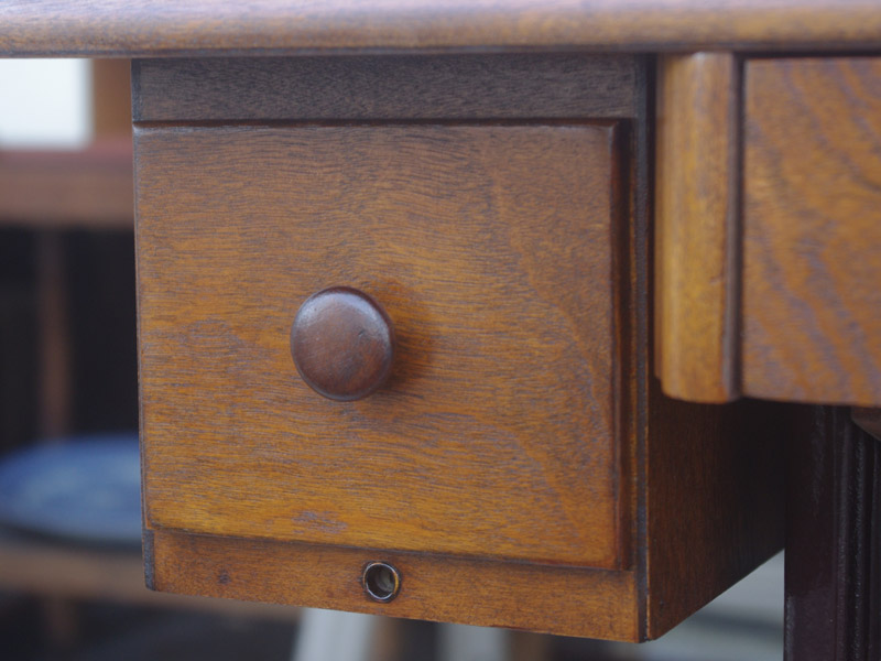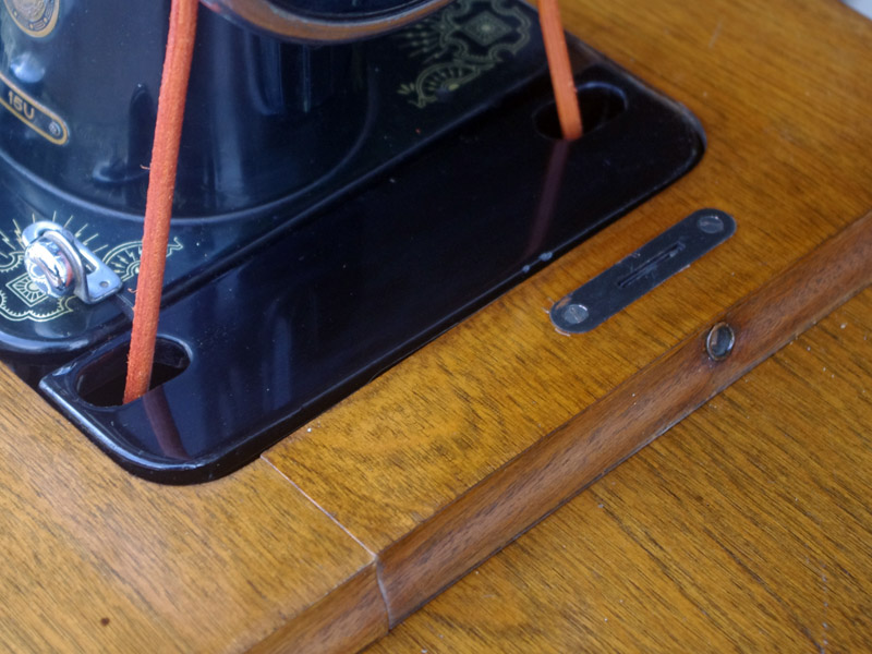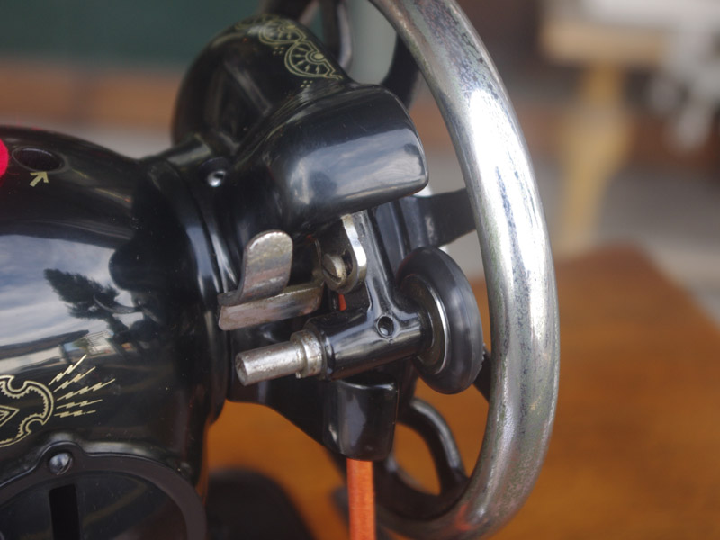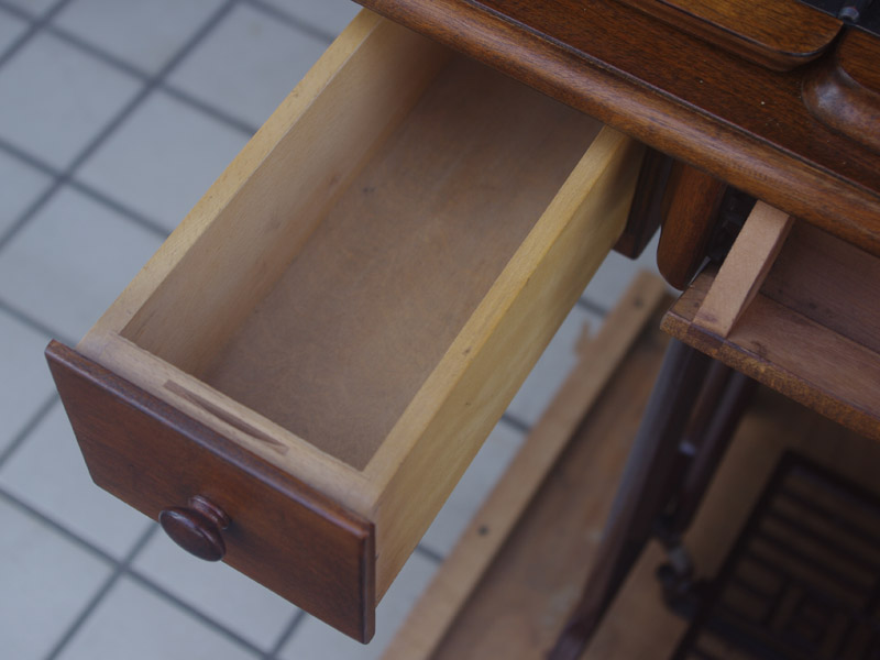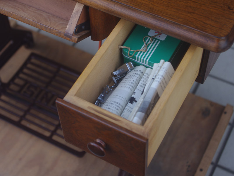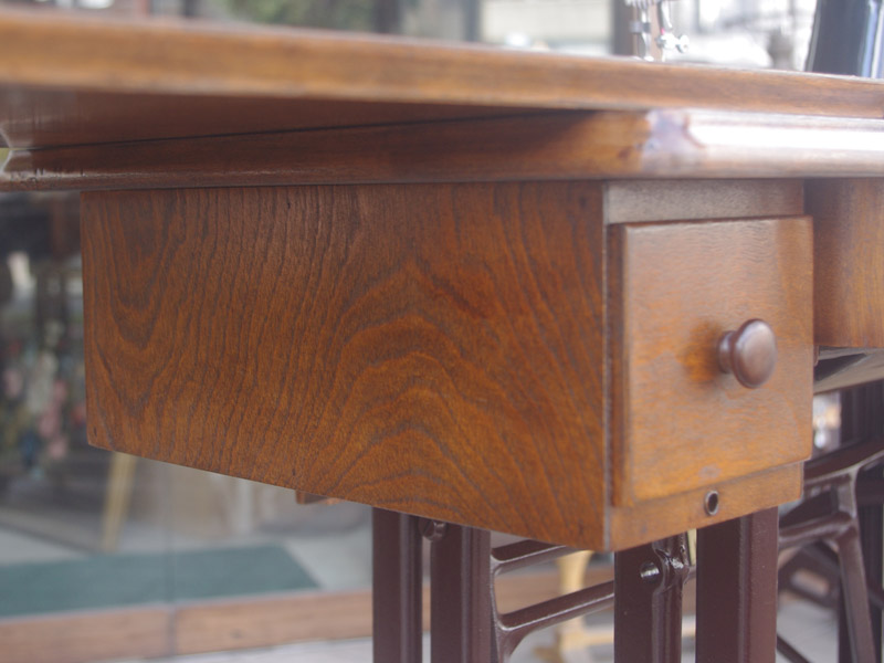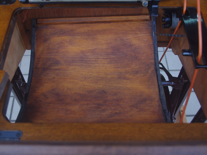 木製部分は傷んでいた部分を補修し、古い塗装を落としたうえで再塗装をいたしました。塗料はシェラックニスおよび耐久性を考えてウレタンでコーティングをしております。脚は塗装の劣化が見られましたので分解クリーニングと再塗装および調整をいたしました。ベルト車やペダルがスムースに動くように分解しグリースアップ、注油、などをしております。最後にミシン本体とベルトで繋げて動きを確認しております。動作は特に静かです。