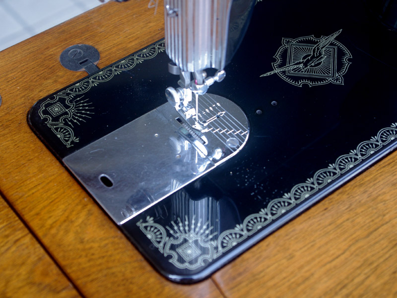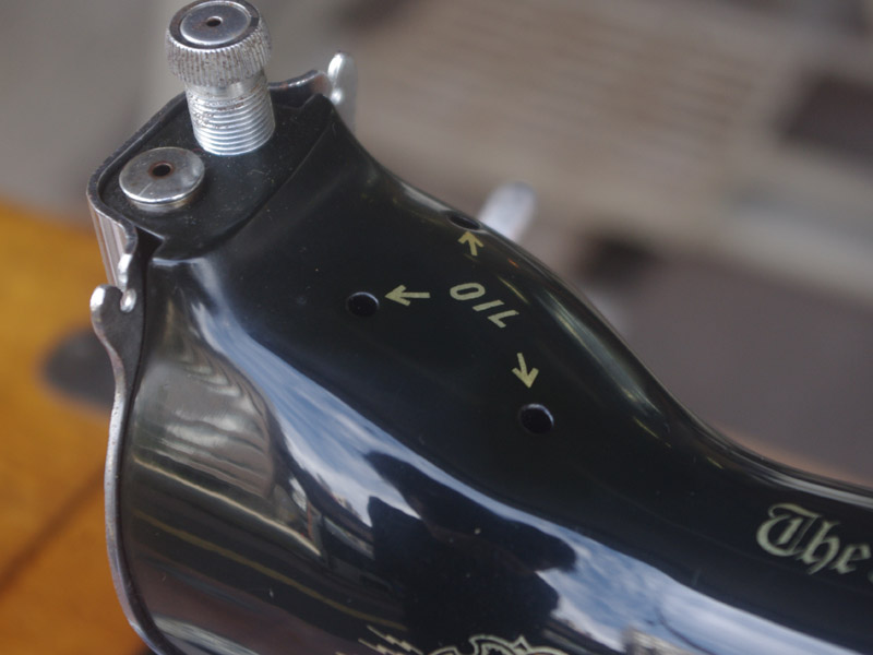 本体外装は比較的にきれいな状態で、機械内部は汚れはありましたが基本的には良いコンディションでした。分解掃除、縫製に影響する傷等の除去、消耗品の交換、再組立てをして調整して縫えるようになっております。こちらには返し縫い機能があります。また送り歯の上下機能もありますので、別途刺繍枠やダーニング押えを入手すればフリーキルトや刺繍も可能です。