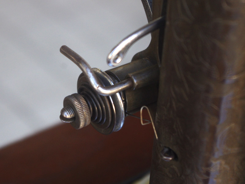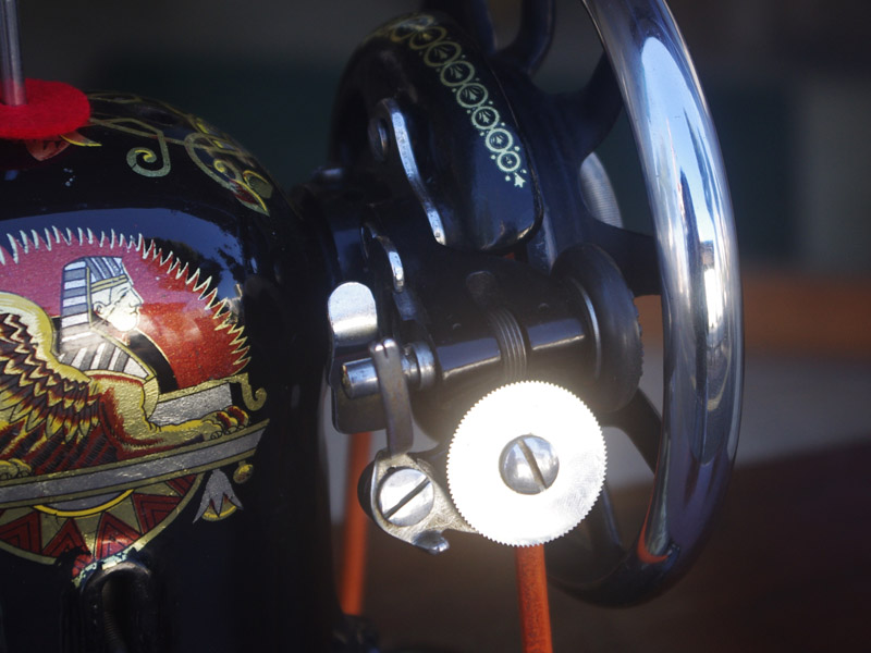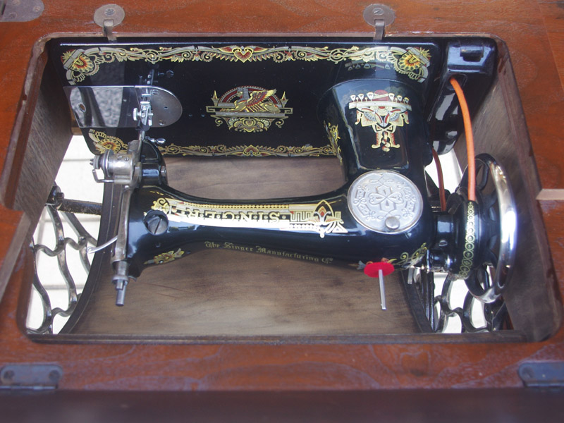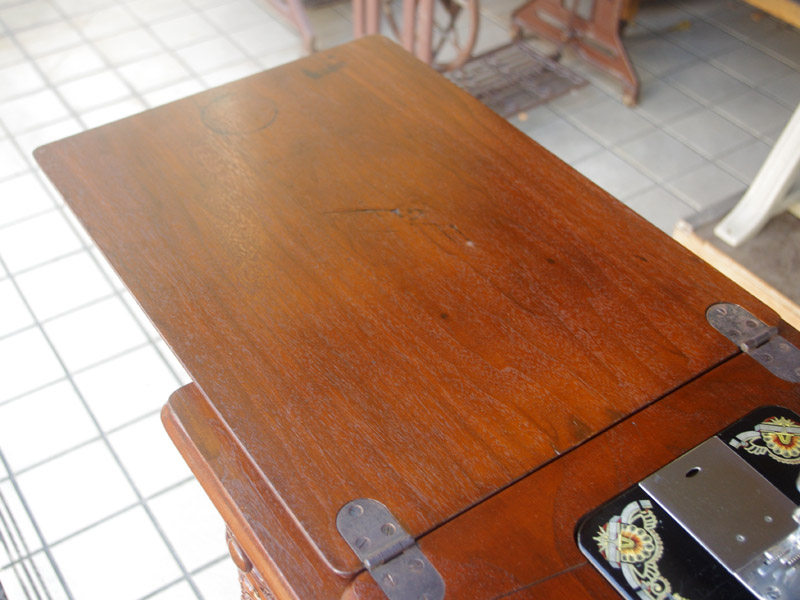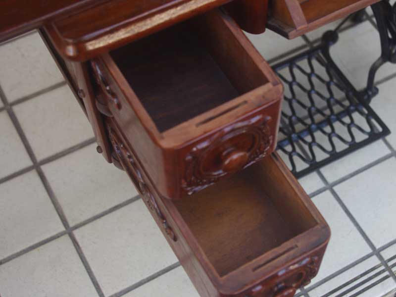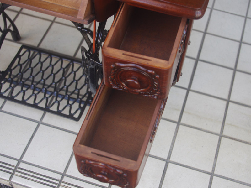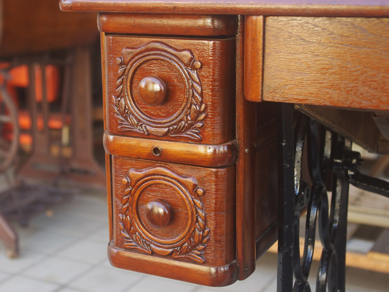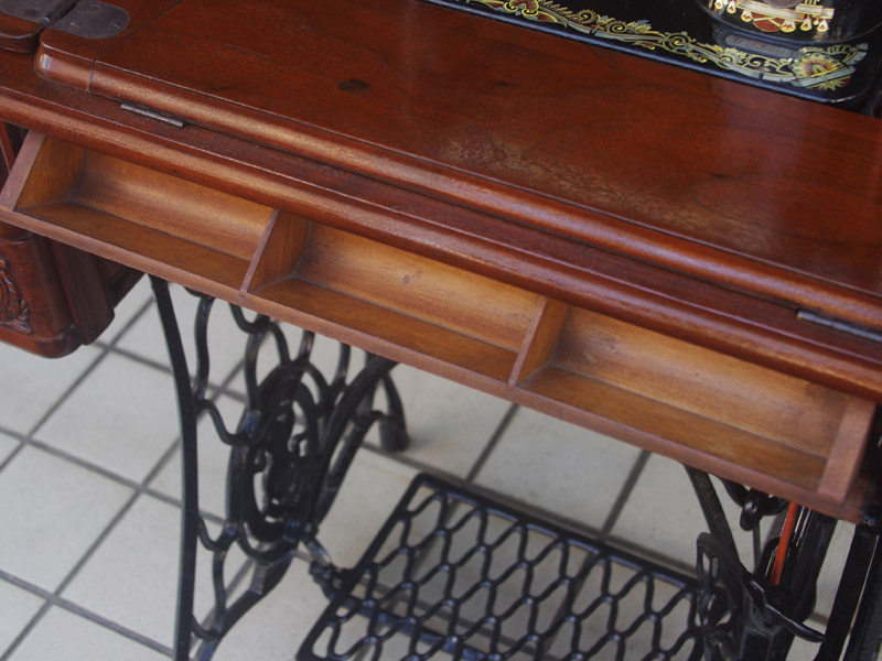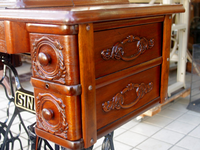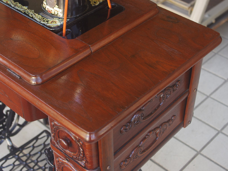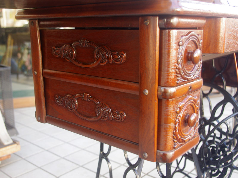 シンガー製の足踏みミシンです!網脚になっている古いタイプの足踏みミシンですね。ミシン本体の模様は定番のスフィンクス柄ではありますが、赤い色が入っている珍しいものです。台は左右が2段の引き出しがあり彫刻もあしらわれているより高級なものとなっております。樹種はウォールナットかそれに類する気が使われています。やや赤みを帯びた茶系の色で、ミルクチョコレートのような色味です。