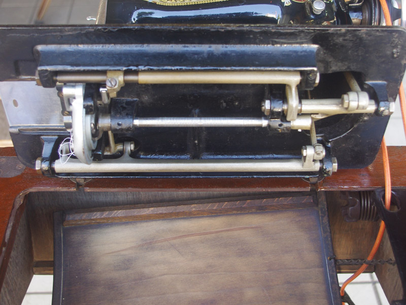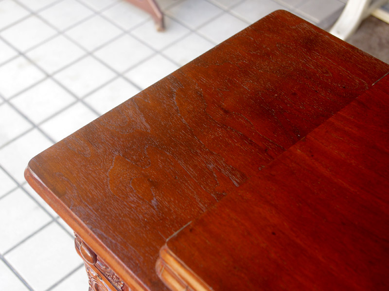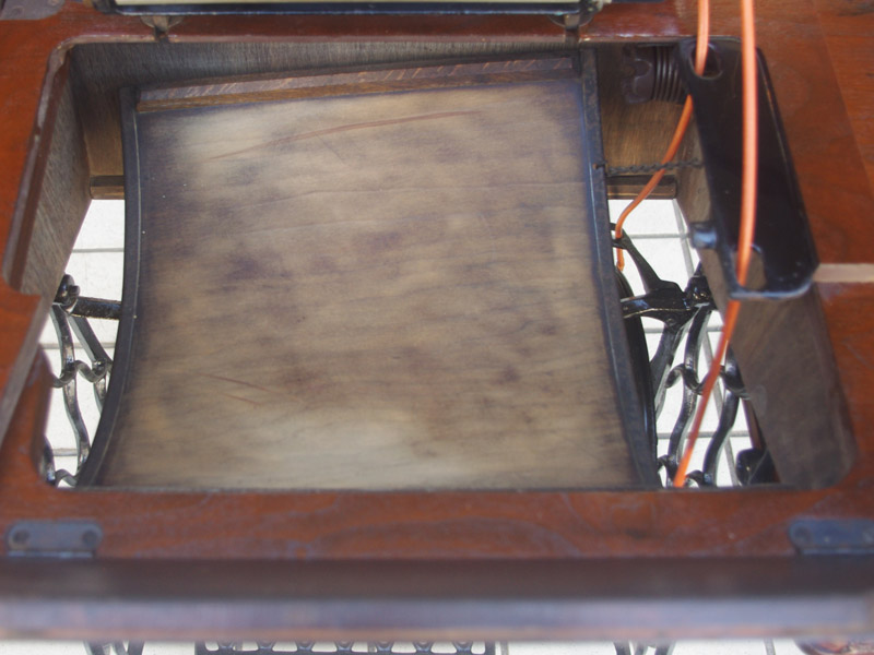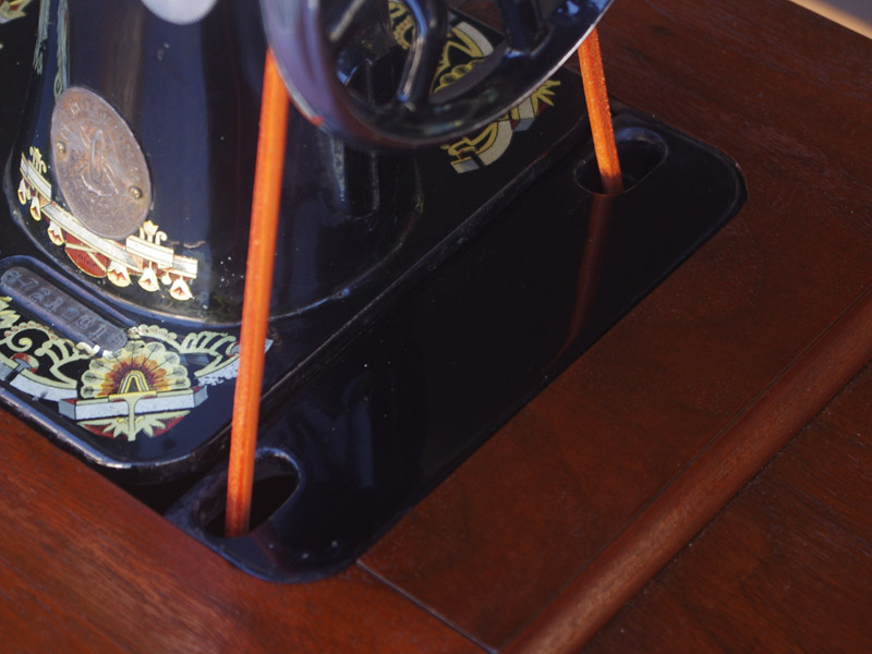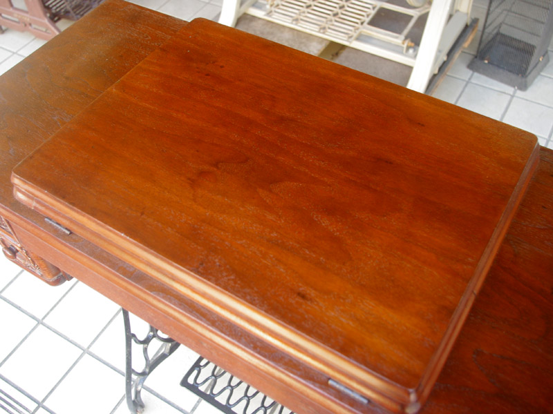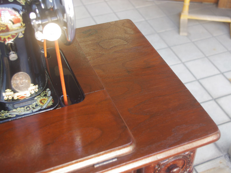 古い塗装の研磨後は色むらを抑えるため植物由来のステインを使用して色味を調整し、天然樹脂シェラックニスで塗装をいたしました。古くから使用される天然の塗料で、アンティーク家具の補修や塗装に使われてきました。天然素材で石油系シンナーなども使用しておらず、またホルムアルデヒドの吸着効果もあると言われています。ただ、熱やアルコールに弱いので、熱いコーヒーカップや消毒アルコールなどを置かないようにしてください。また水気のある花瓶も避けた方がよいでしょう。脚は分解クリーニングをして再塗装いたしました。ペダルの具合や本体との連動の調整もしております。