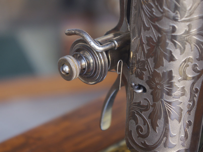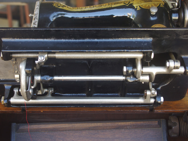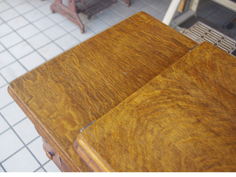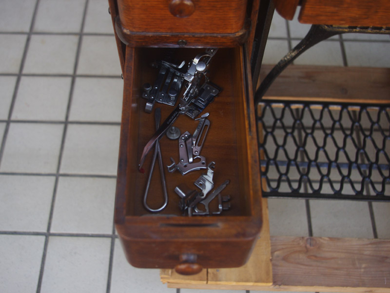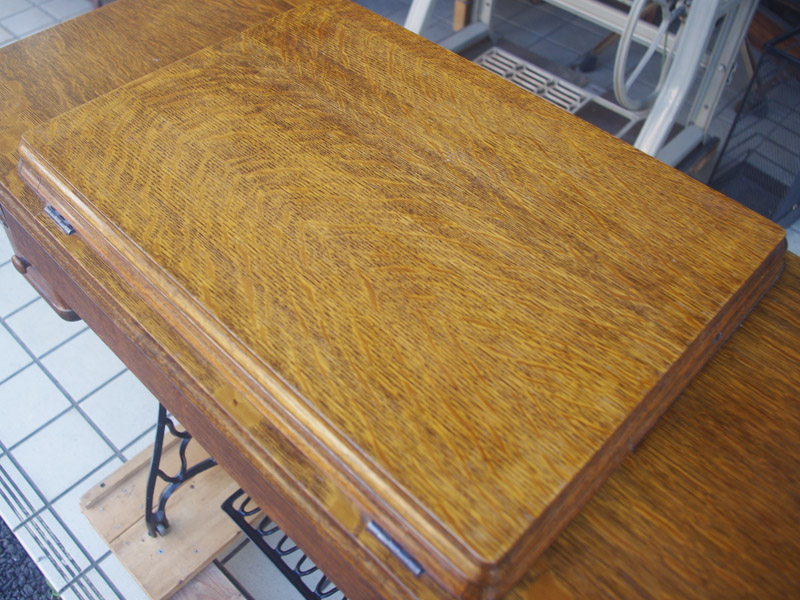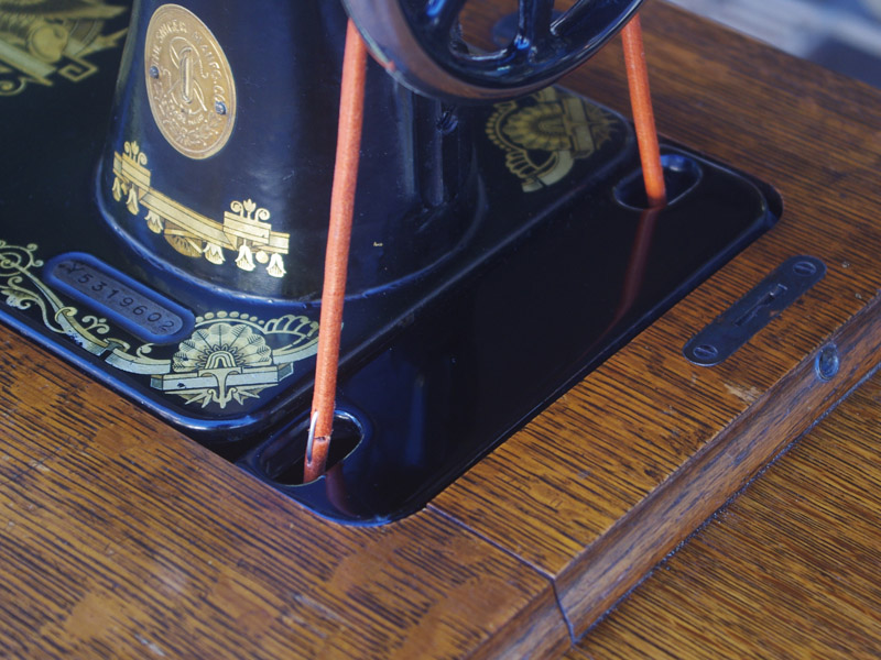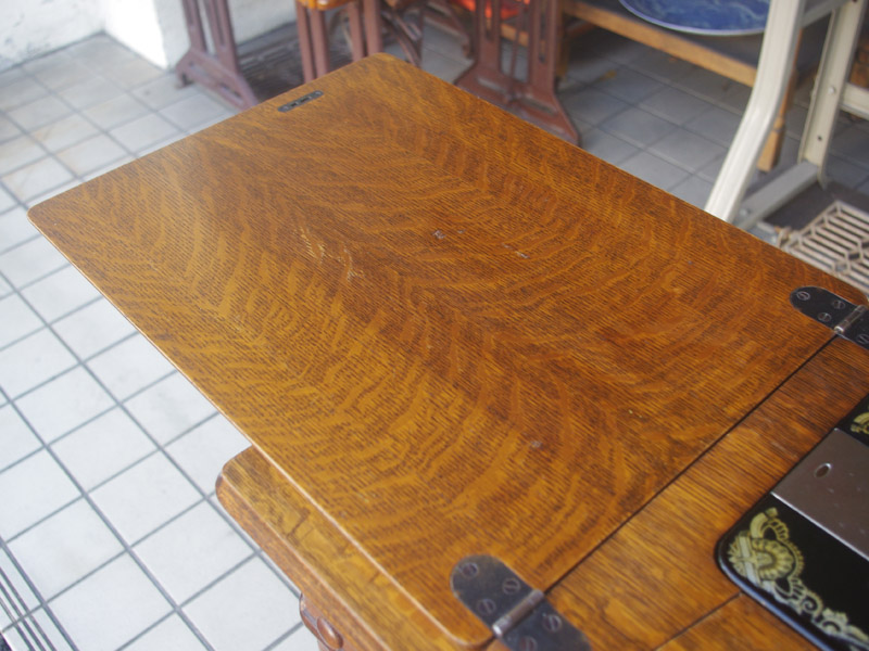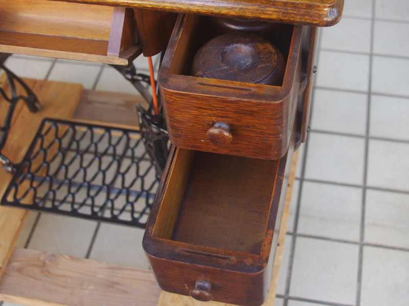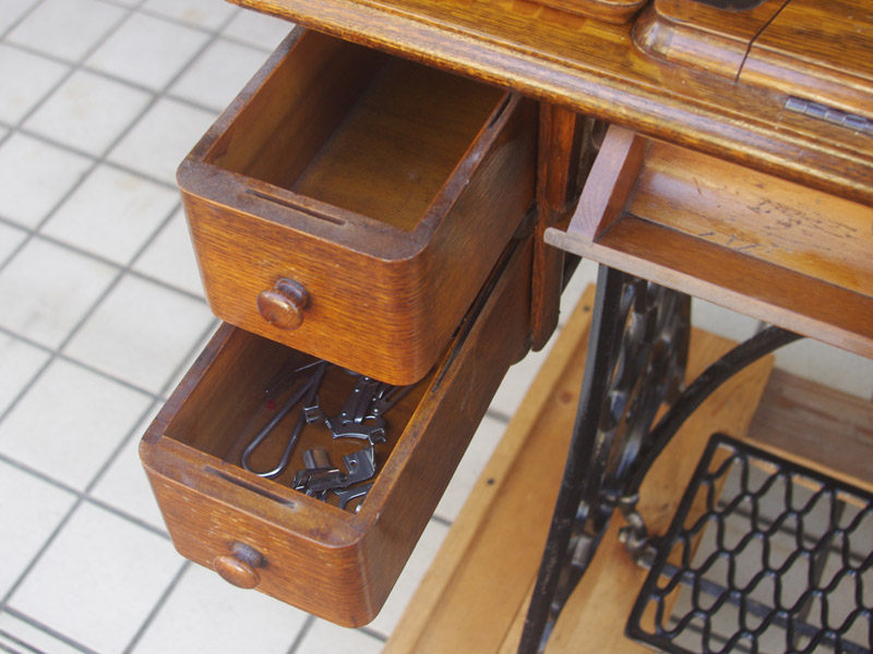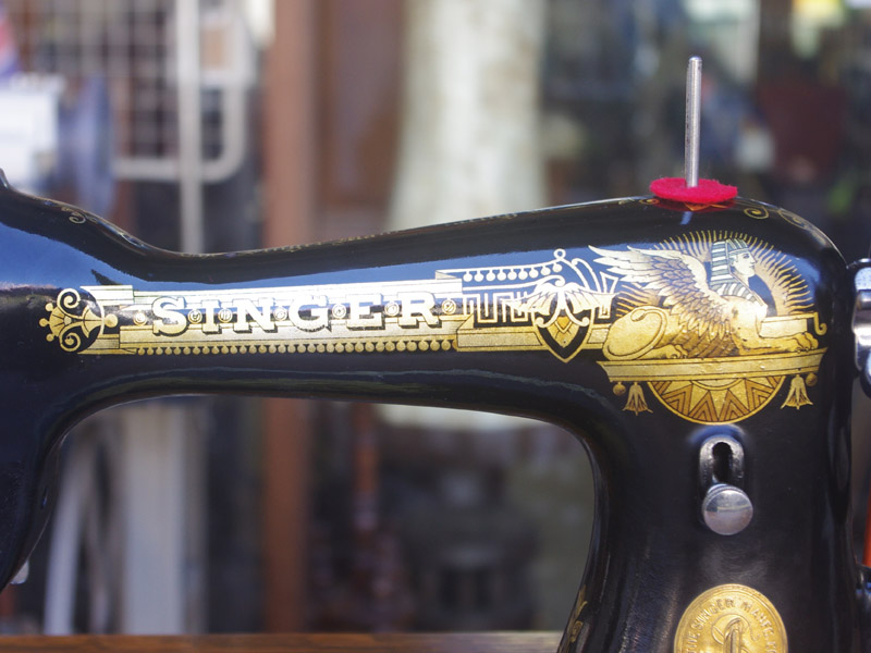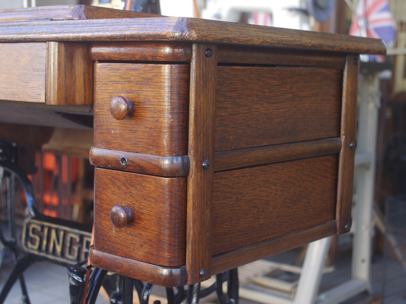 イギリス製のアンティーク、シンガーの足踏みミシンです。モデルは15K。オーソドックスなモデルではありますが、100年ほどたっているミシンとしては絵柄も良く残っており、さらに実働できるミシンですので、かなりコンディションは良い一品だと思います!ミシン本体の絵柄はスフィンクス。当時流行したオリエント趣味の模様ですね。木製分はオーク材仕様。オークと言っても樹種は様々ですが、本機はヨーロッパ出身らしい明るめでカジュアルなお部屋にもアンティーク調のお部屋にも合わせやすい色味になっています。2段の引き出しでオーク仕様のものは最近見かけなくなってきましたね。希少になってきております。脚はシンガーの網脚ですね。