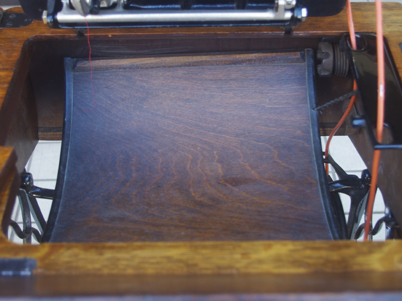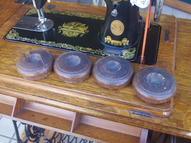 古い塗装の研磨後は色むらを抑えるため植物由来のステインを使用して色味を調整し、天然樹脂シェラックニスで塗装をいたしました。古くから使用される天然の塗料で、アンティーク家具の補修や塗装に使われてきました。天然素材で石油系シンナーなども使用しておらず、またホルムアルデヒドの吸着効果もあると言われています。ただ、熱やアルコールに弱いので、熱いコーヒーカップや消毒アルコールなどを置かないようにしてください。また水気のある花瓶も避けた方がよいでしょう。脚は分解クリーニングをして再塗装いたしました。ペダルの具合や本体との連動の調整もしております。