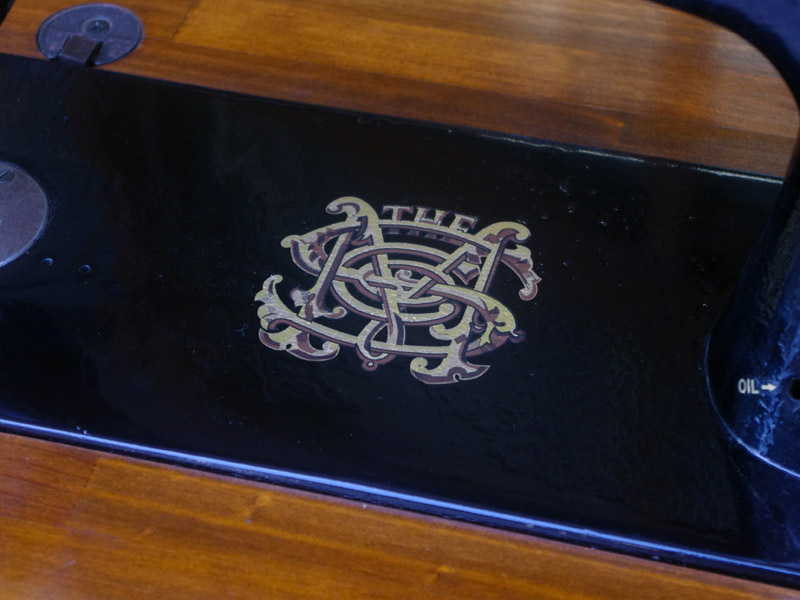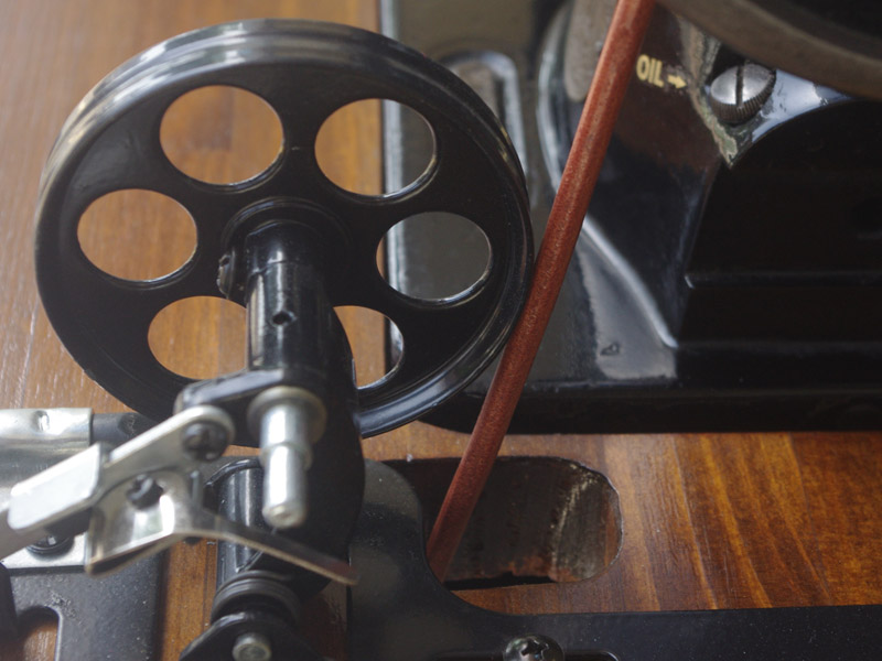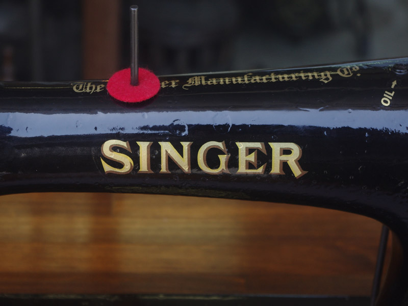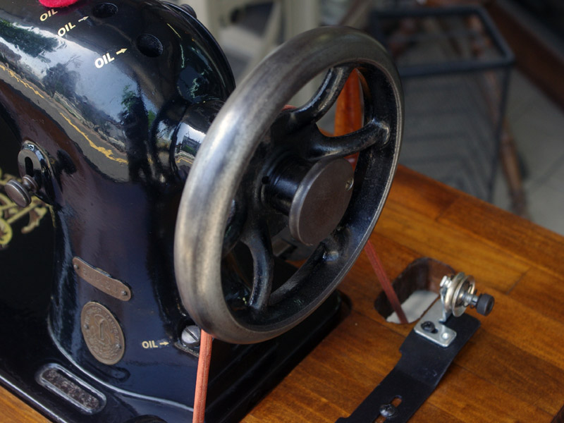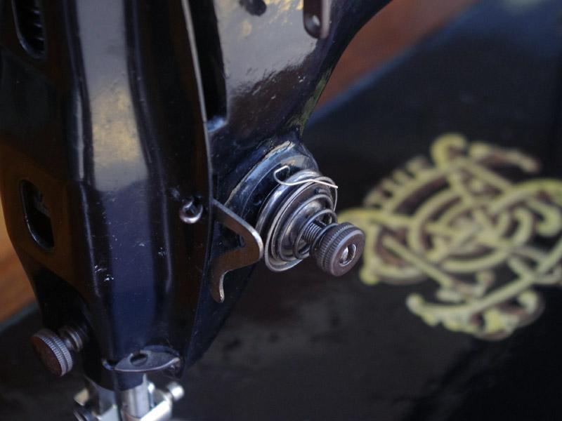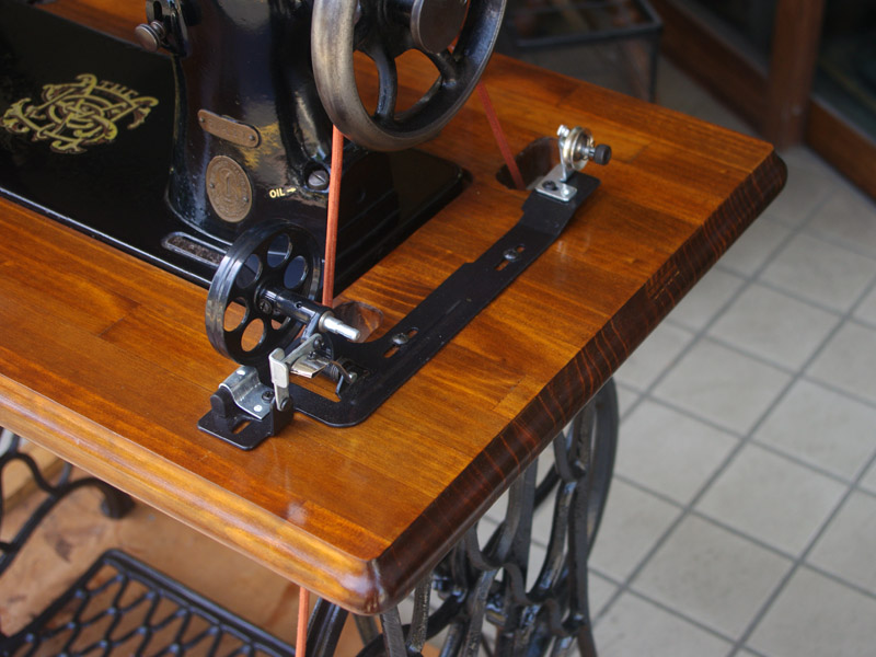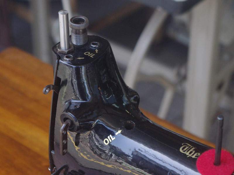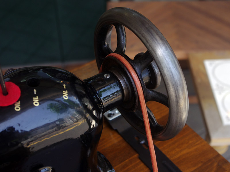 機械は分解掃除をして調整いたしました。ベルトなどの消耗品は交換いたしました。大釜も一部を交換しております。本体の塗装は結構落ちていましたので、黒の再塗装と、文字と模様の復元、最後にコーティングをしております。使用できる針は硬い職業用・工業用ミシン針でいろいろな種類があるのも魅力です。こちらで試した針の太さは最大で19番、糸は8番。もう少し針が太くても針板の穴は通りそうですが糸を持ち上げてこれるかはやってみないと分からないといったところです。下糸巻き機は本体の横の、テーブルの上に別途付けてあります。