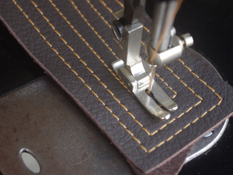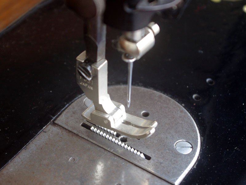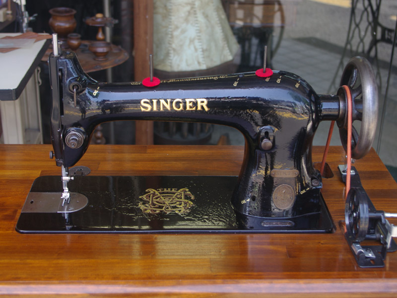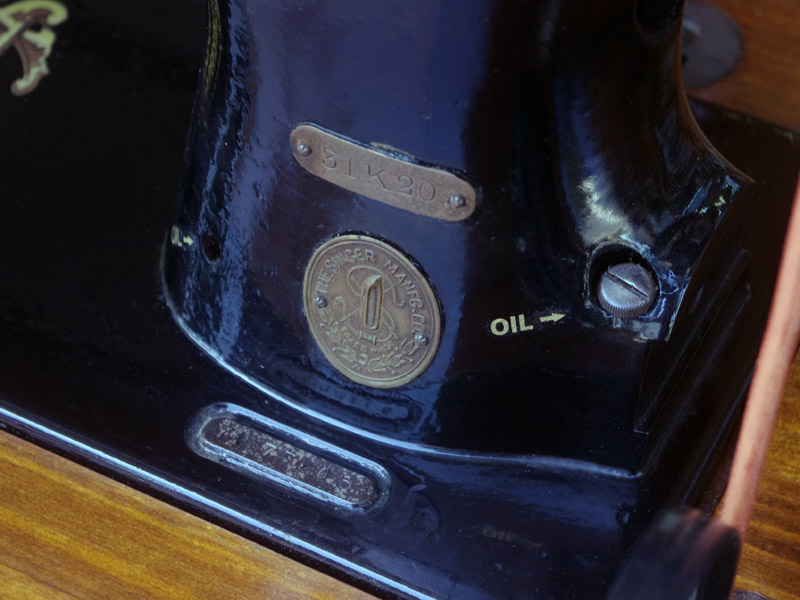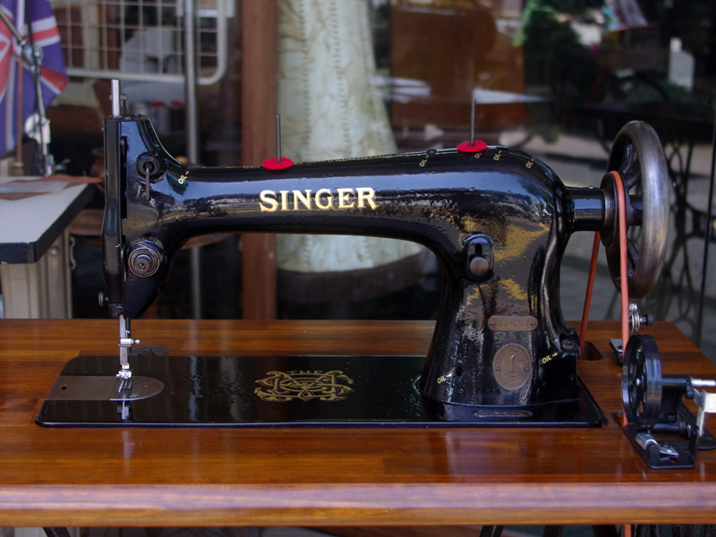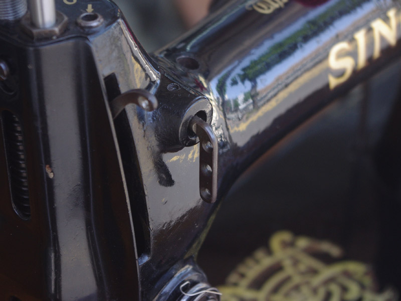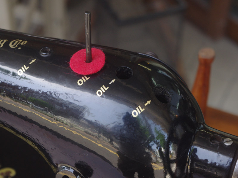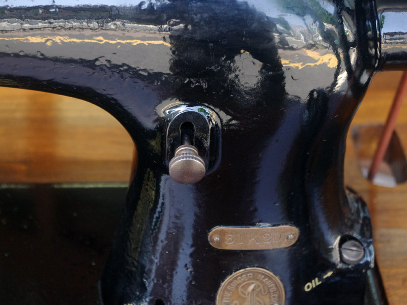 機械は分解掃除をして調整いたしました。ベルトなどの消耗品は交換いたしました。大釜も一部を交換しております。本体の塗装は結構落ちていましたので、黒の再塗装と、文字と模様の復元、最後にコーティングをしております。使用できる針は硬い職業用・工業用ミシン針でいろいろな種類があるのも魅力です。こちらで試した針の太さは最大で19番、糸は8番。もう少し針が太くても針板の穴は通りそうですが糸を持ち上げてこれるかはやってみないと分からないといったところです。下糸巻き機は本体の横の、テーブルの上に別途付けてあります。