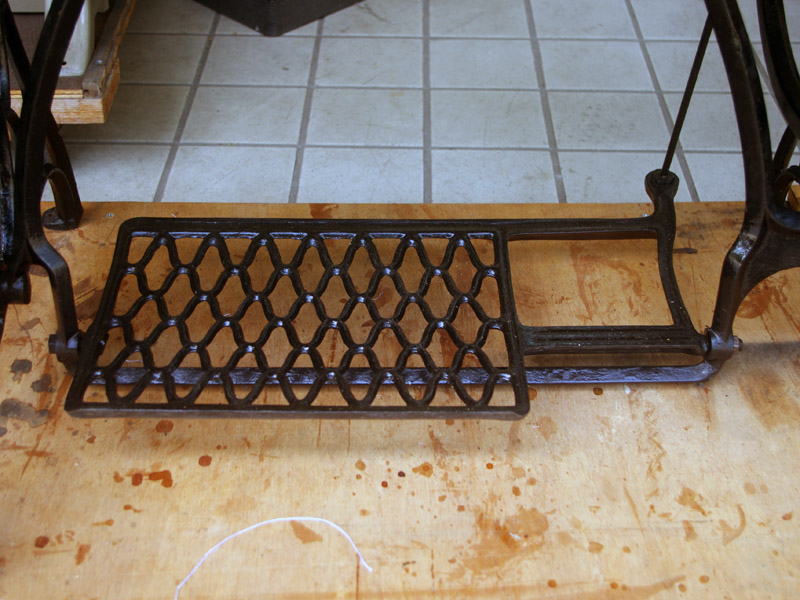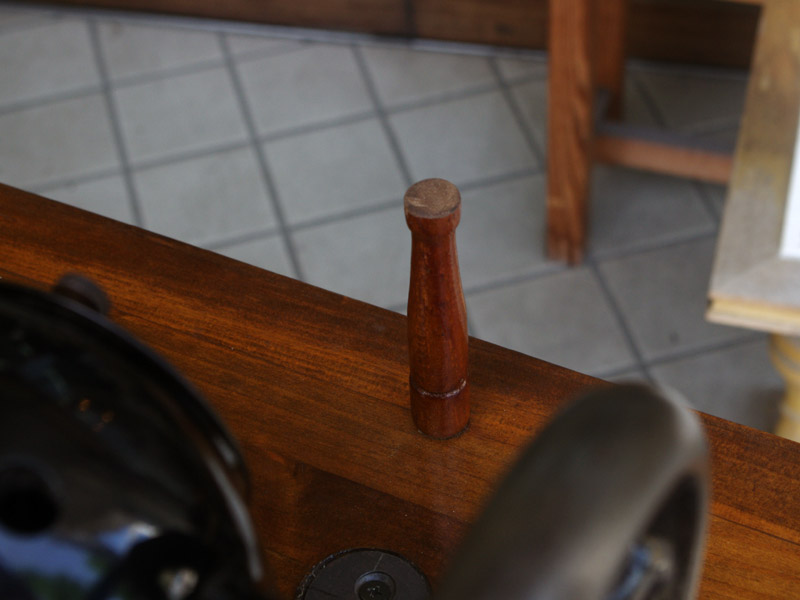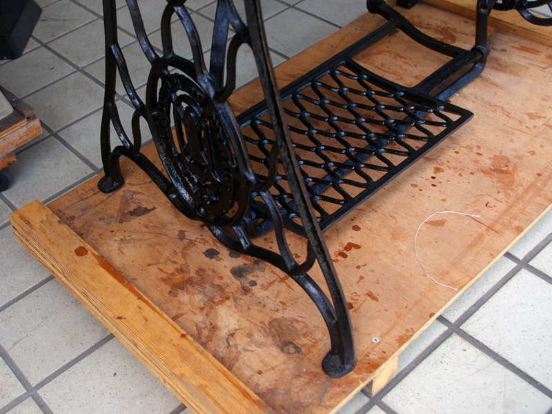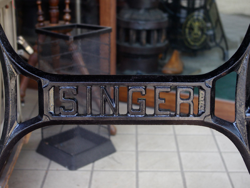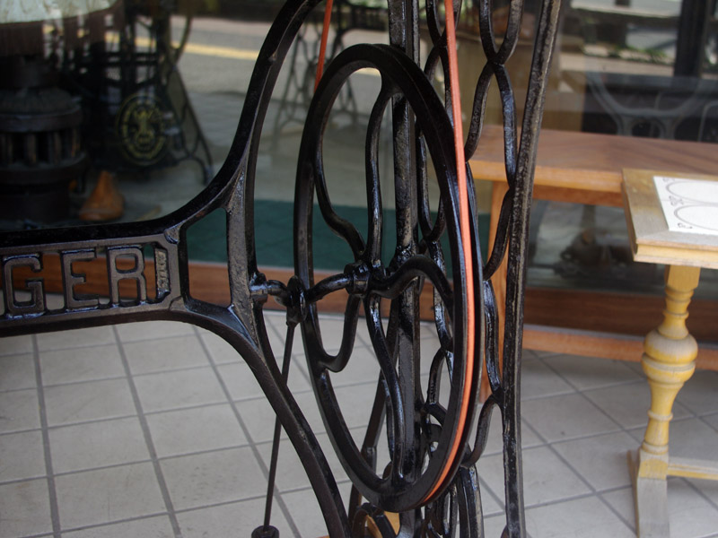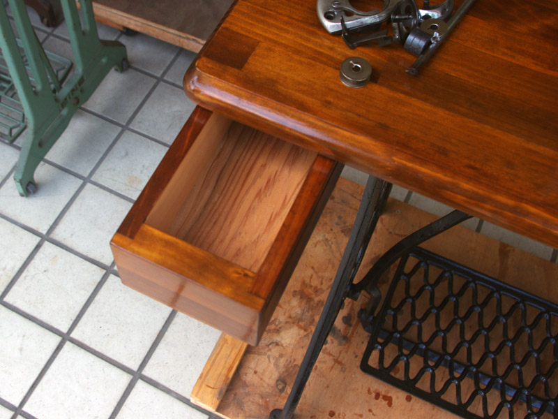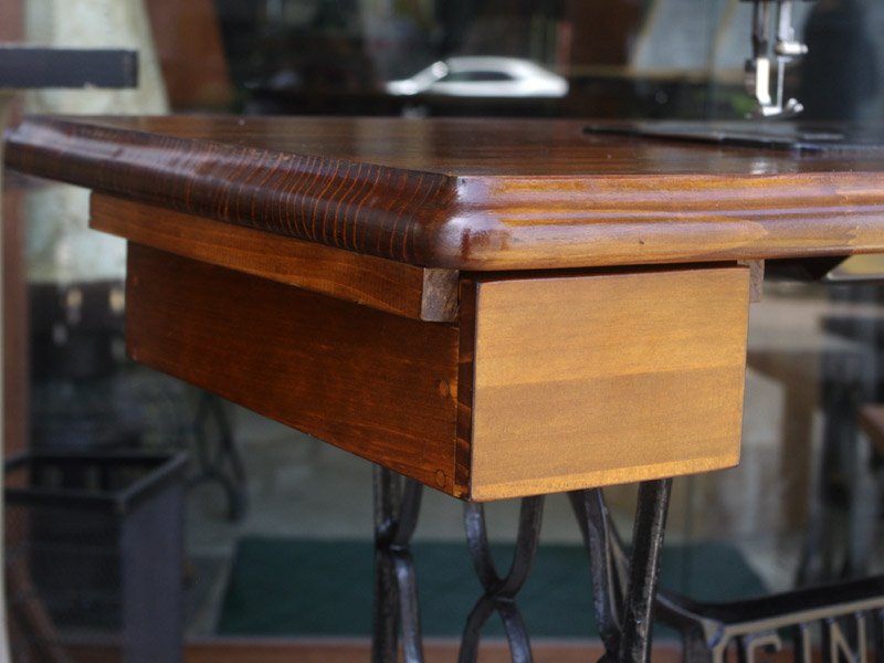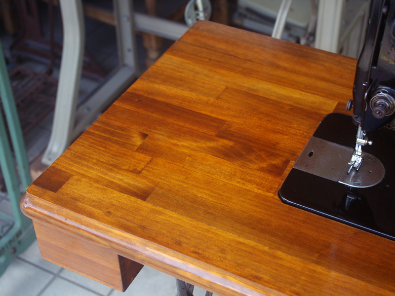 台は新たに当店で製作いたしました。使用した塗料は天然樹脂のシェラックニス。脚もクリーニングで長年の埃や汚れを落とし、再塗装をいたしました。脚もクリーニングをして再塗装をしております。(2025.3.27更新)脚の中央文字部分を塗装いたしました。一部以前の写真を使用しております。現在はSINGERの文字は金になっています。