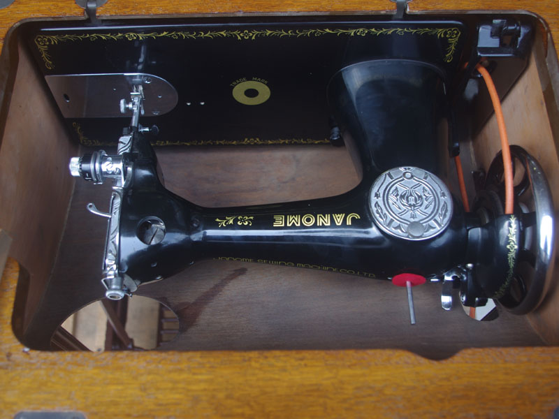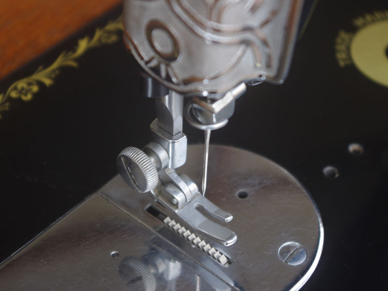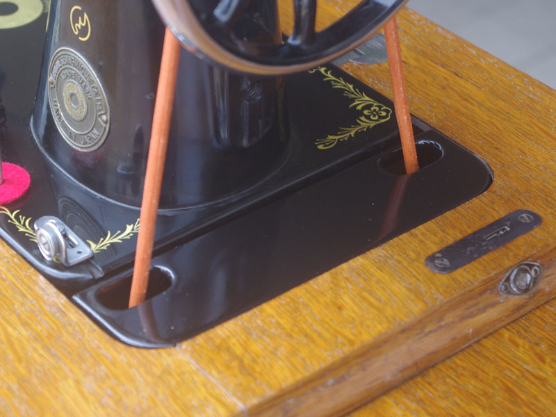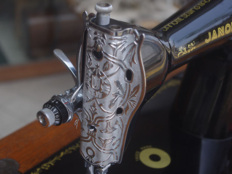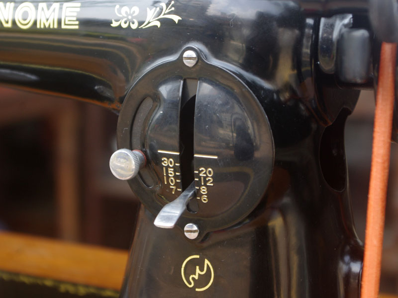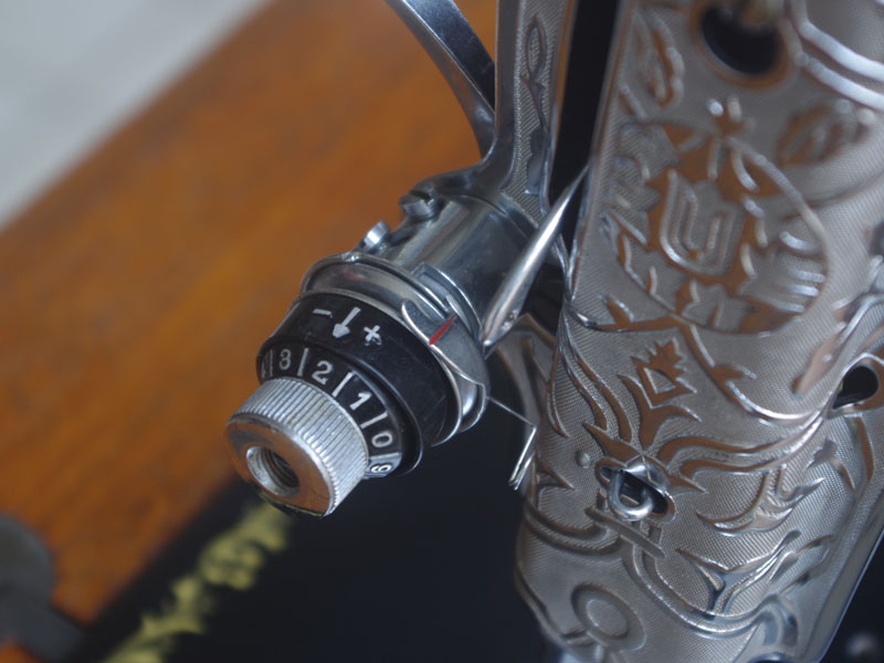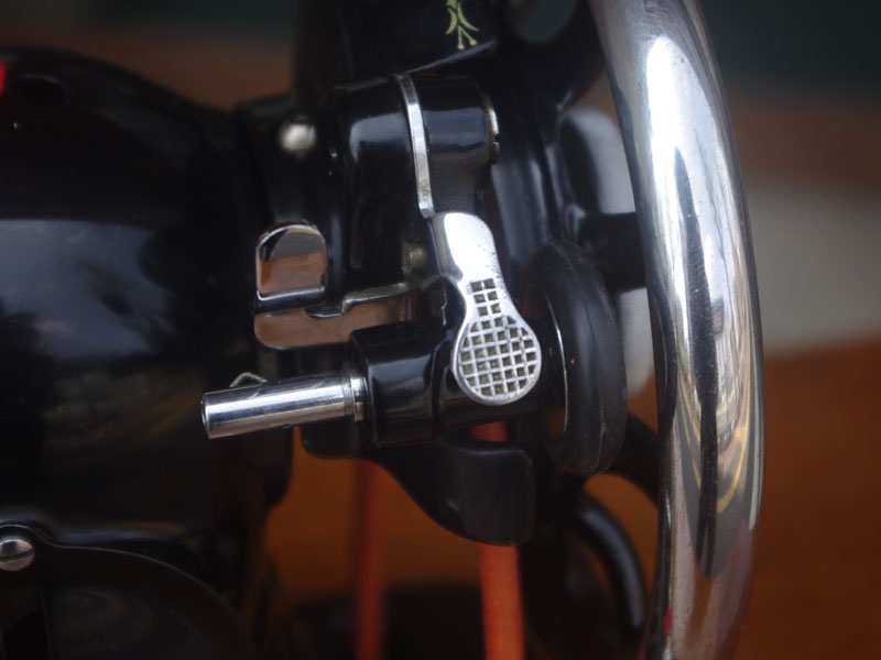 本体は黒の塗装、模様、ツヤが良く残っておりメッキの状態も長い年月を経ていますがとても良好です。使い勝手もよく動作は軽くて静か、縫い目は半回転垂直釜らしい目締りの良いものができます。こちらのミシンも分解掃除をして古い汚れや錆を落としております。また、消耗品は交換、縫製に影響する傷などを取り除き、十分に使用できる状態に整備しております。消耗品である家庭用ミシン針・ボビンケース・ボビンなど市販されています(本体装着品は新品に交換済み)。レバー操作による縫い目長さの調整、また返し縫い機能があります。送り歯の高さを調整するダイヤルも付いています。別途穴かがり器をご用意いただければ、ボタンホールも縫えます。