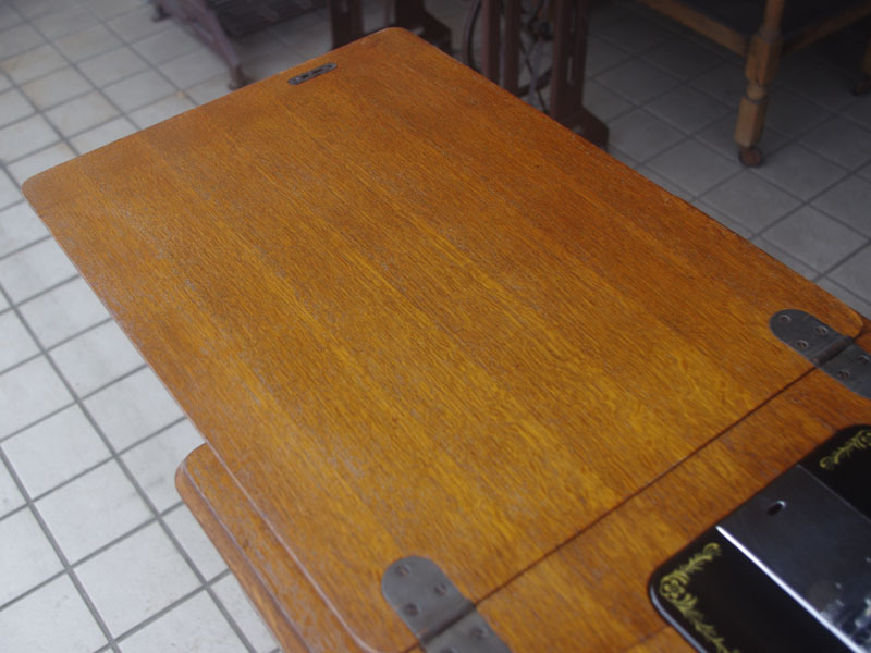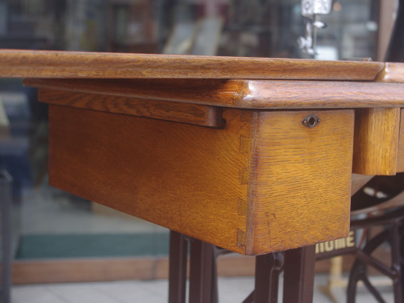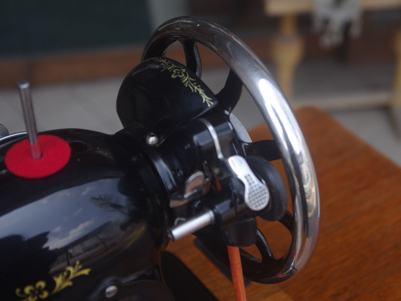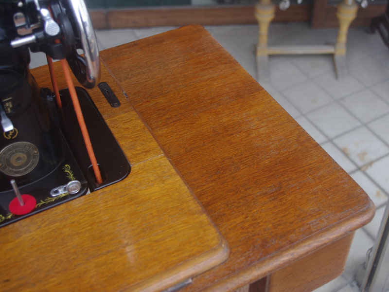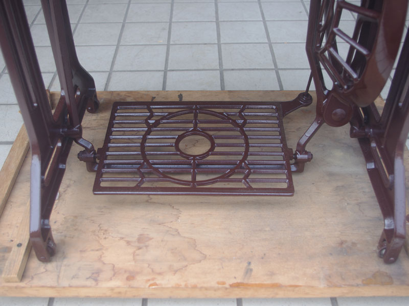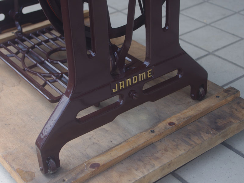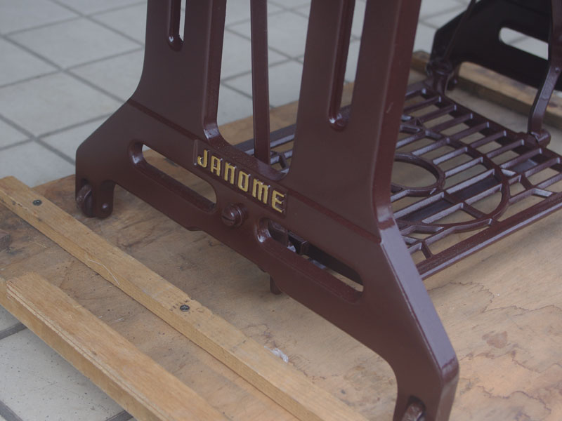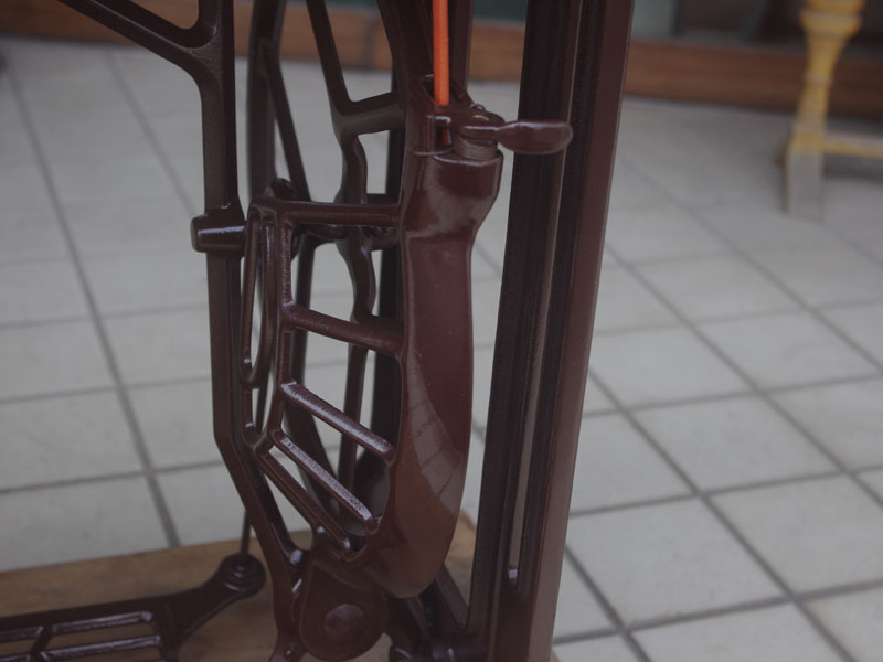 飴色の木製の台も整備して再塗装をしております。黒いミシン本体とツヤのある飴色の台がとてもカジュアルにもビンテージにも合う雰囲気になっています。塗料には天然樹脂シェラックニスおよび摩耗に強いウレタンを使用しました。熱いカップやアルコール、多少の水気は問題ありませんが花瓶の水などには注意して下さい。脚は分解クリーニングと調整、再塗装をいたしました。文字の部分も下の方の写真でご確認いただければと思いますが、金色を入れております。ベルト車やペダルがスムースに動くように分解し注油をしております。最後にミシン本体とベルトで繋げて動きを確認しております。