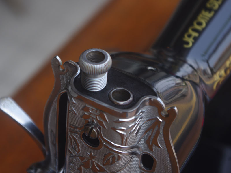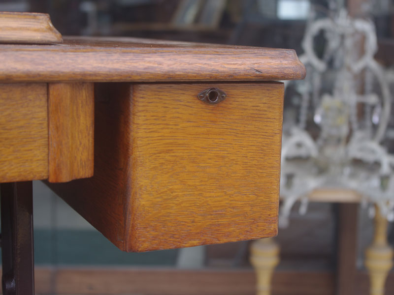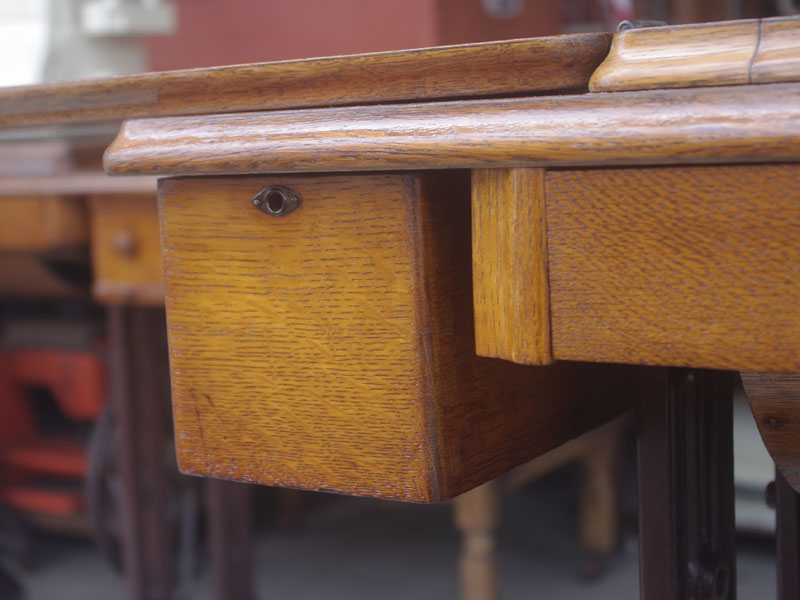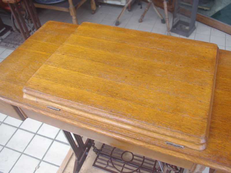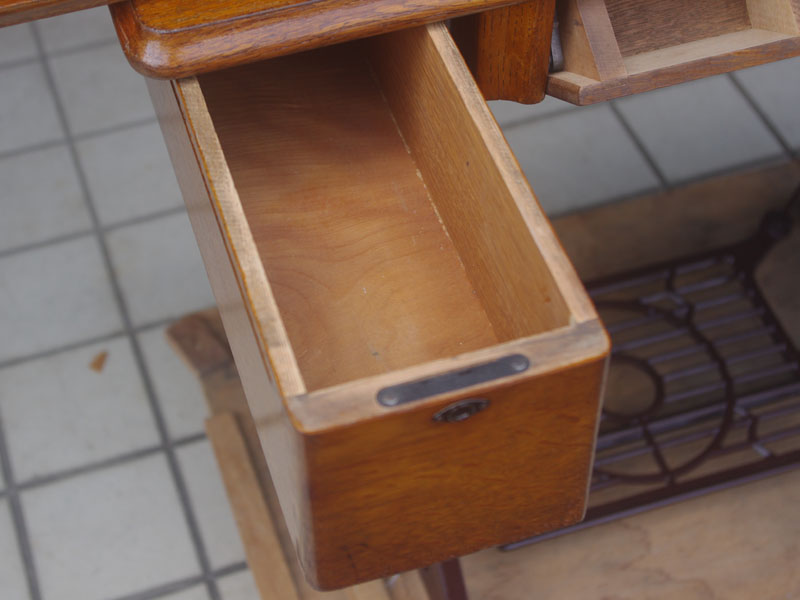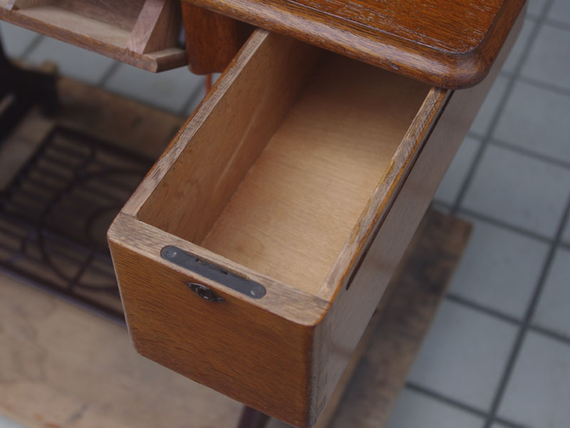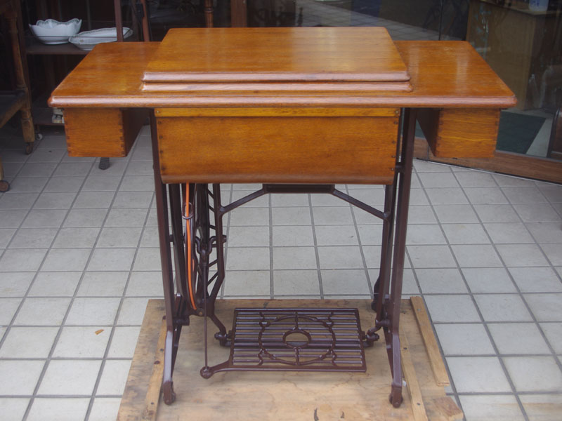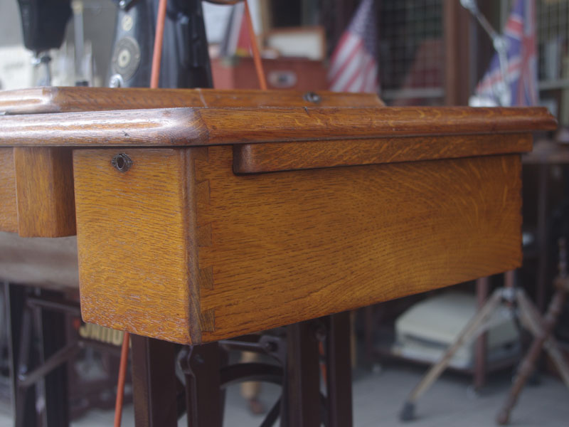 飴色の木製の台も整備して再塗装をしております。黒いミシン本体とツヤのある飴色の台がとてもカジュアルにもビンテージにも合う雰囲気になっています。塗料には天然樹脂シェラックニスおよび摩耗に強いウレタンを使用しました。熱いカップやアルコール、多少の水気は問題ありませんが花瓶の水などには注意して下さい。脚は分解クリーニングと調整、再塗装をいたしました。文字の部分も下の方の写真でご確認いただければと思いますが、金色を入れております。ベルト車やペダルがスムースに動くように分解し注油をしております。最後にミシン本体とベルトで繋げて動きを確認しております。