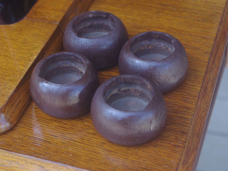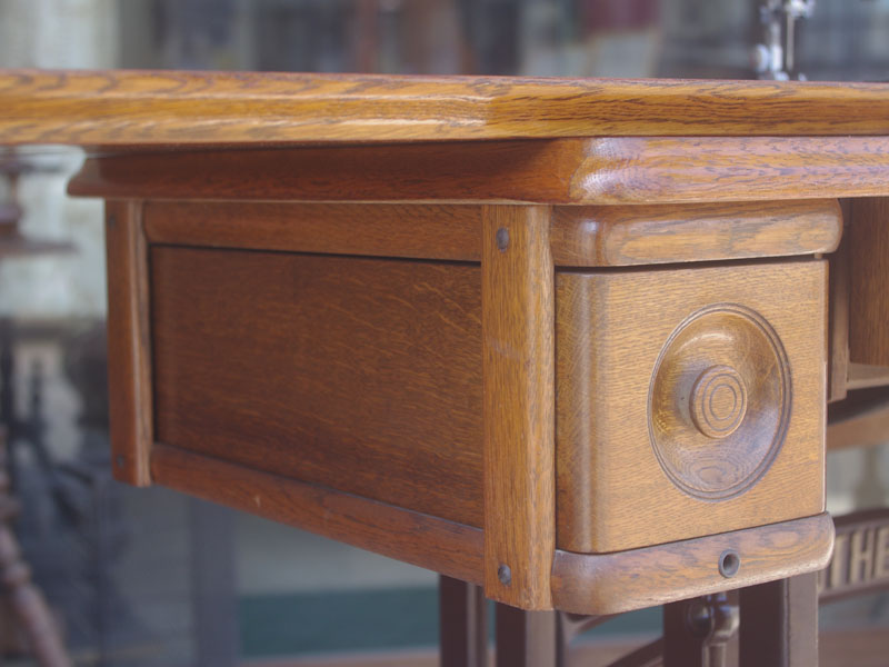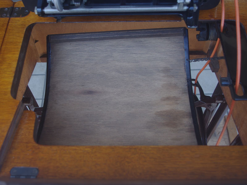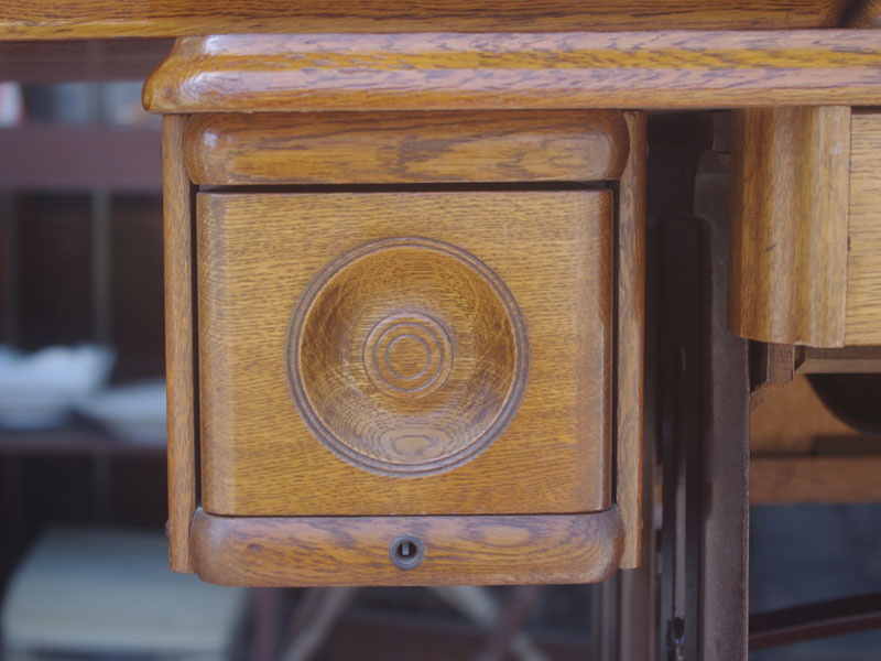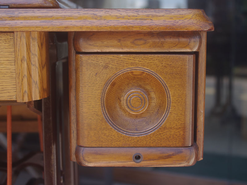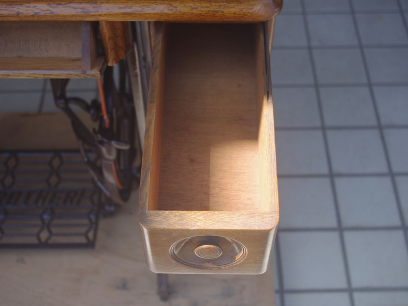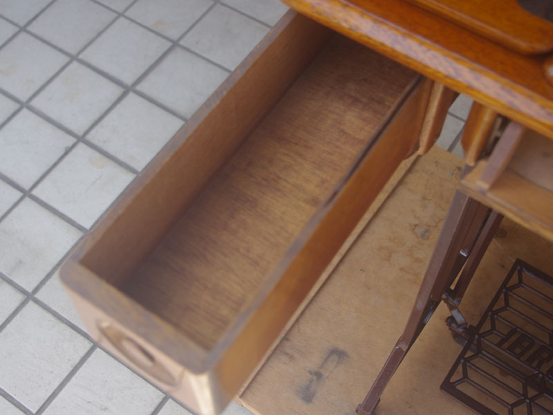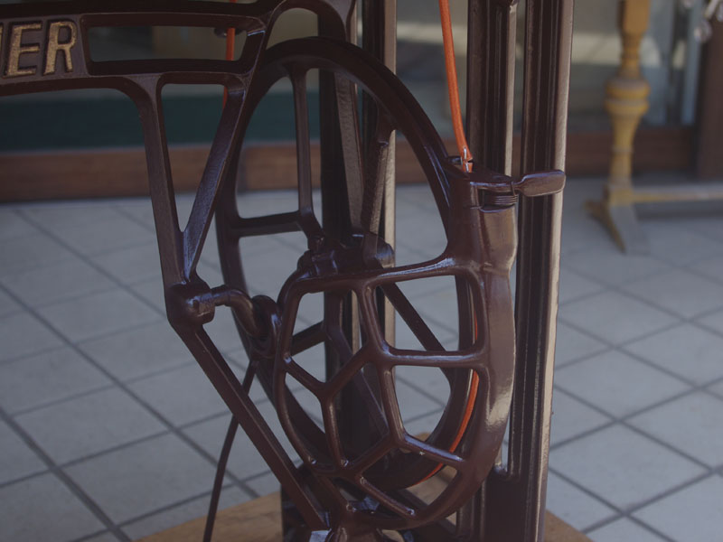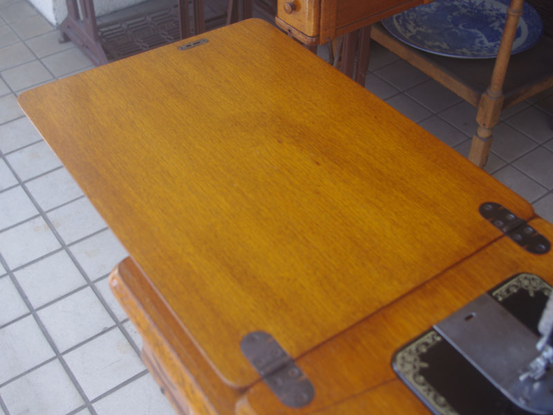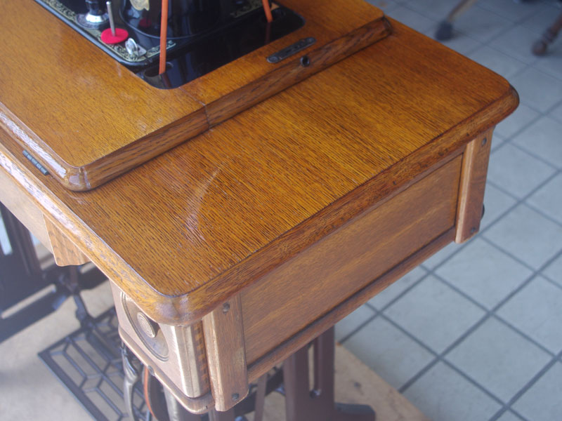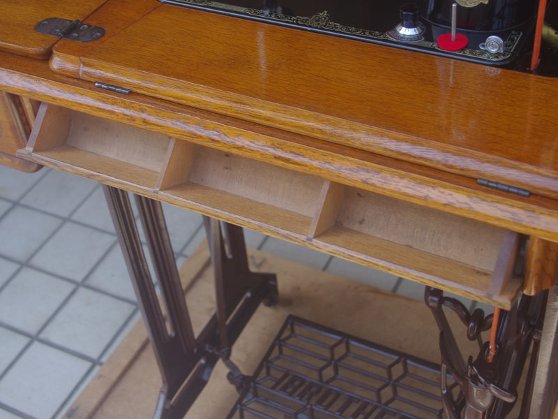 木の部分の塗装は、上の広い面で劣化が見られましたので、古い塗装を研磨して落とし、傷んだ部分の補修、下地を調整して再塗装いたしました。使用したニスは天然樹脂シェラックニスと耐久性のあるウレタンニス。念のため熱いカップやアルコール、または花瓶の水などに注意して下さい。脚は分解クリーニングと再塗装および調整をいたしました。ベルト車やペダルがスムースに動くように分解し注油をしております。最後にミシン本体とベルトで繋げて動きを確認しております。