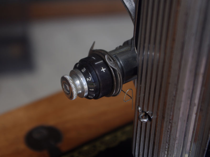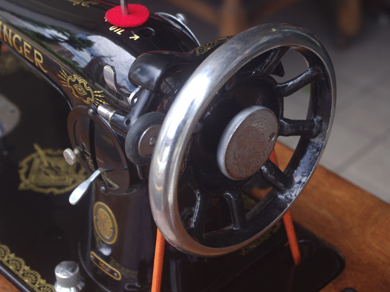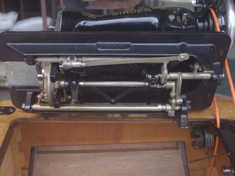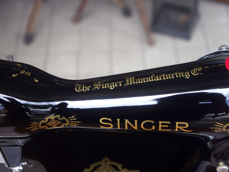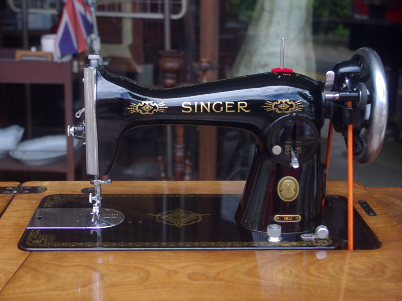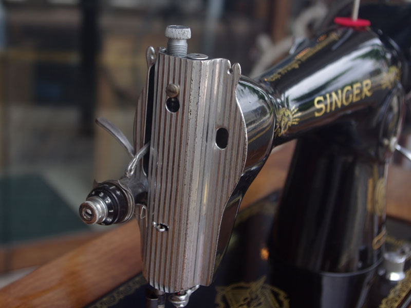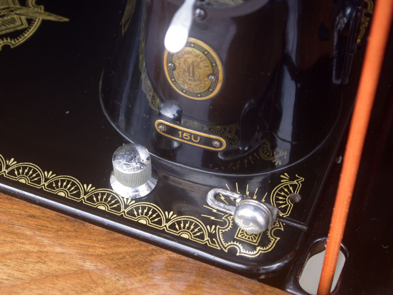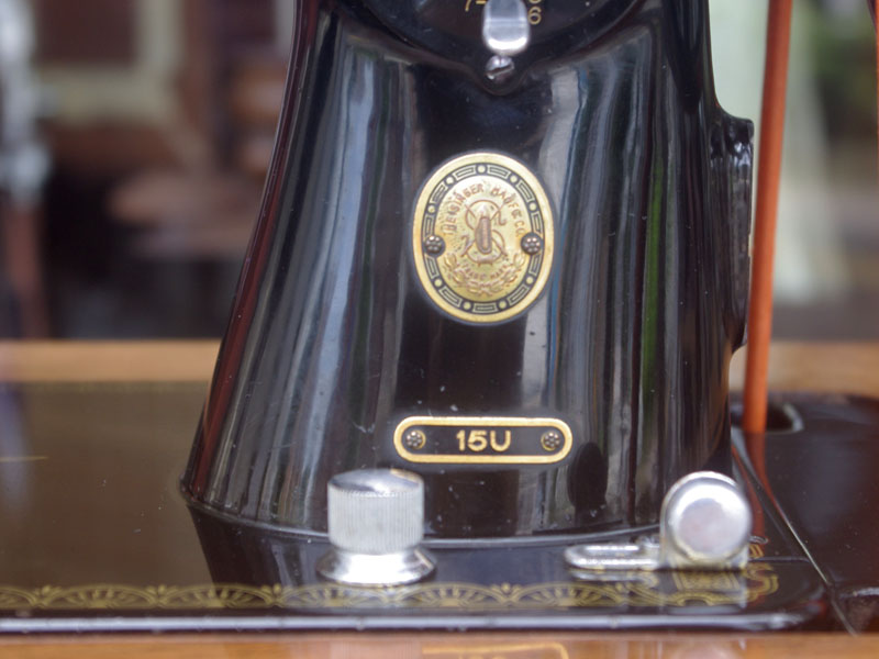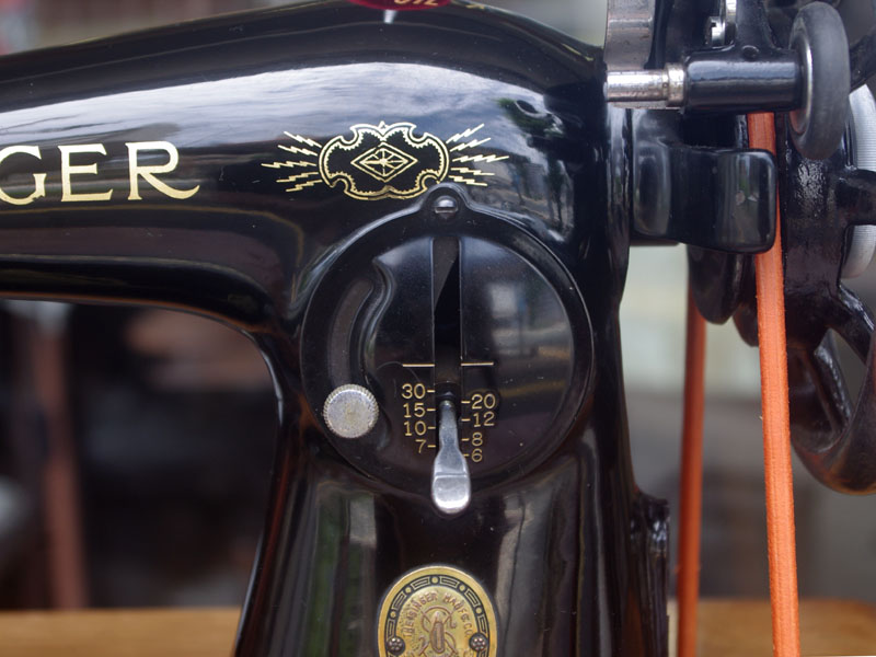 国産のシンガー(SINGER)モデル15Uの足踏みミシンです。モデル15Uは日本の宇都宮の工場で製造されたモデルで、当時は世界でトップと言っても間違いない品質の良いミシンでした。この頃は日本製のミシンがとても質が高くなった時代ですが、シンガー15Uはその中でもトップクラスだったと思います。まずデザインは現代でも通じる繊細されたものがありますね。黒いボディに金色の文字が当時のミシンのデザインのトレンドですが、文字や模様の線の太さやカーブが何とも言えないバランスがあって、これは他のメーカーと比べて魅力的です。機械的にもとても工作精度が高いです。機械がいいことは使い勝手につながりますね。使い勝手と言えば、天秤にスリットがあるのですが、これは他のメーカーのミシンにはない特徴で、より簡単に手早く糸を掛けることができるようになっています。シンガーがユーザー視点で設計を考えていたことがうかがえますね。