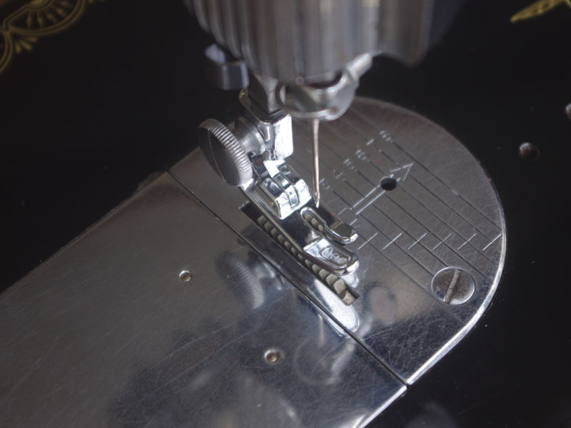 本体外装は比較的にきれいな状態で、機械内部は汚れはありましたが基本的には良いコンディションでした。分解掃除、縫製に影響する傷等の除去、消耗品の交換、再組立てをして調整して縫えるようになっております。こちらには返し縫い機能があります。また送り歯の上下機能もありますので、別途刺繍枠やダーニング押えを入手すればフリーキルトや刺繍も可能です。