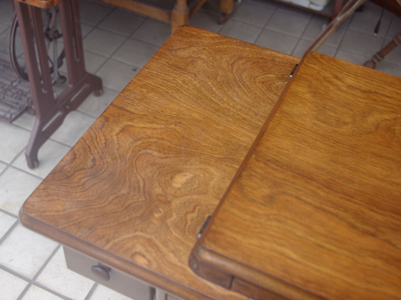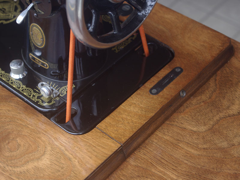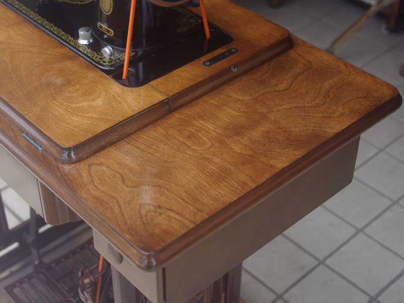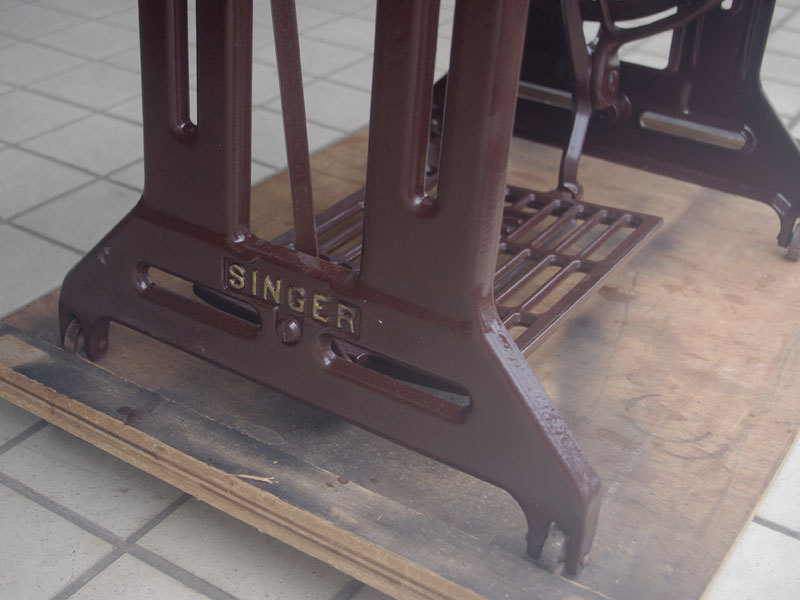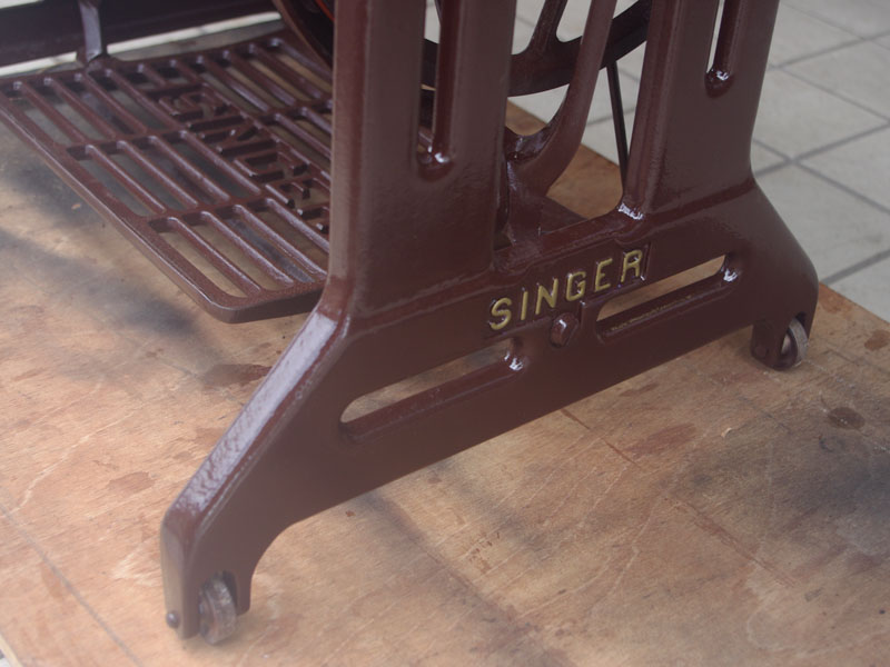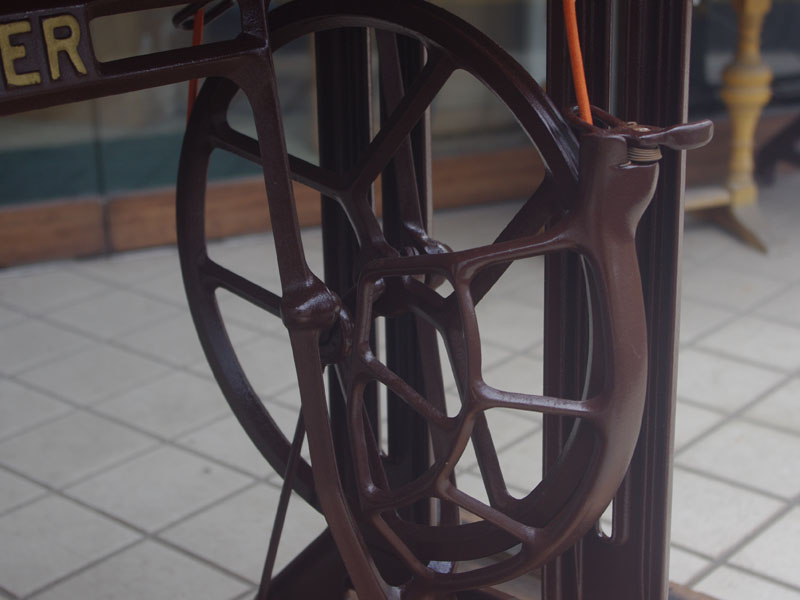 木製部分は傷んでいた部分を補修し、上を向いた広い面の塗装に傷がありましたので、古い塗装を落としたうえで再塗装をいたしました。塗料は耐久性を考えてウレタンを使用しました。脚は塗装の劣化が見られましたので分解クリーニングと再塗装および調整をいたしました。文字はオリジナルの金色が残っています!ベルト車やペダルがスムースに動くように分解しグリースアップ、注油、などをしております。最後にミシン本体とベルトで繋げて動きを確認しております。動作は特に静かです。