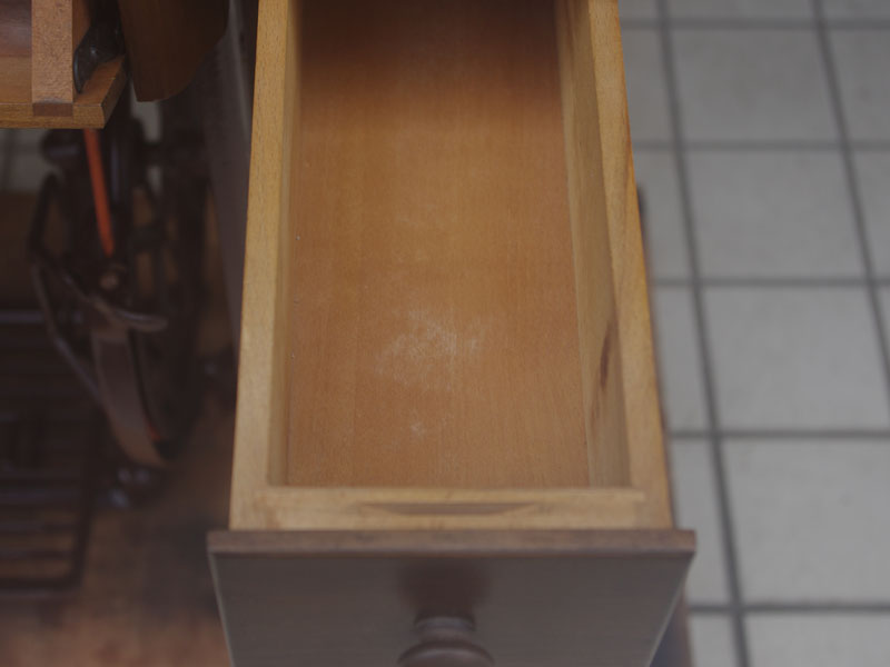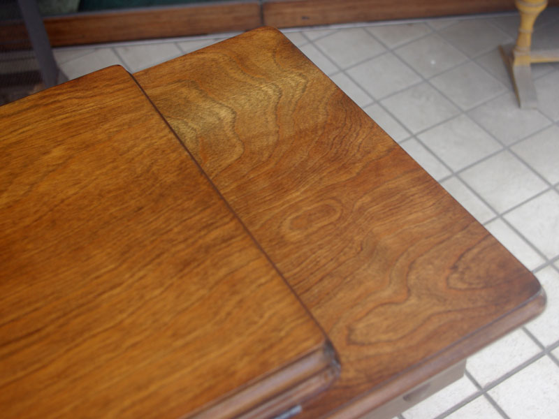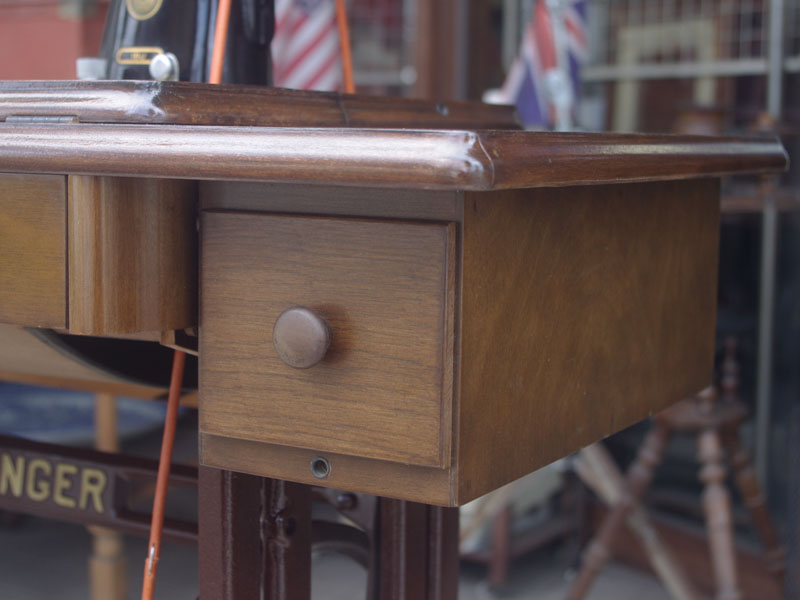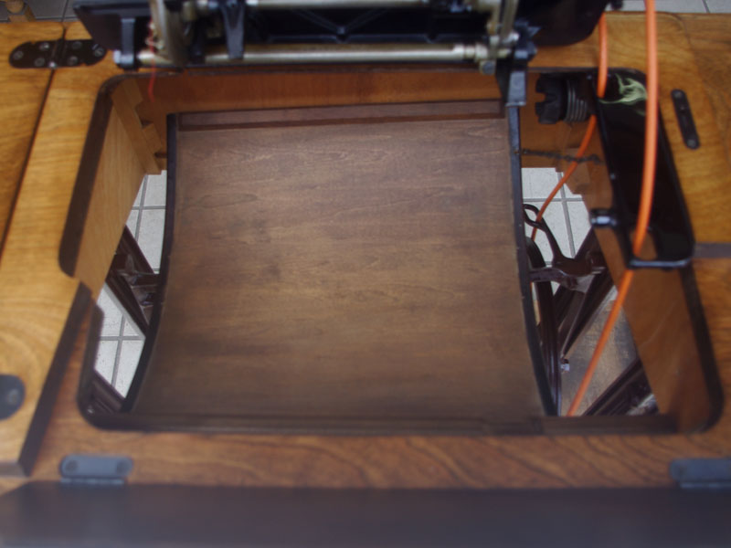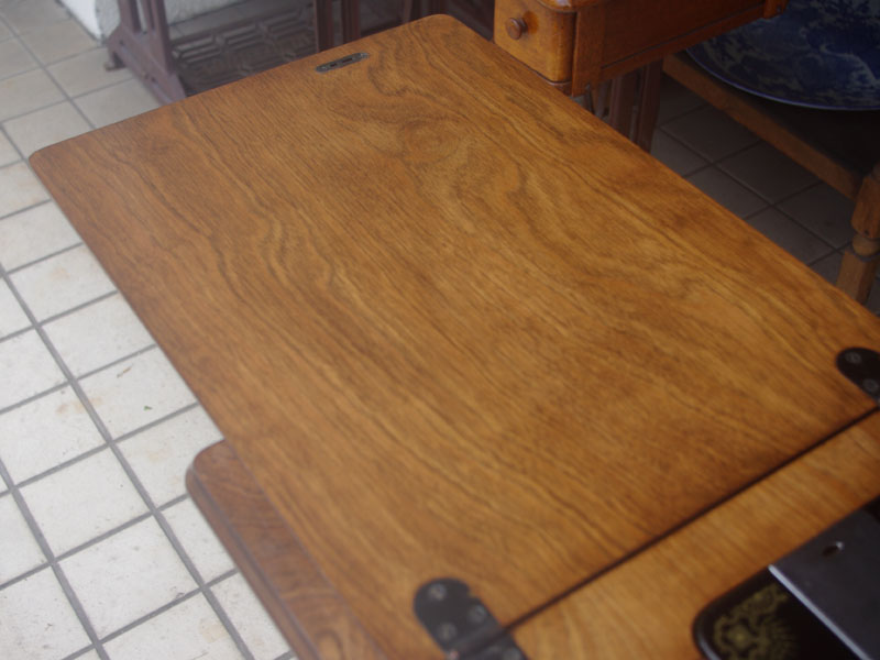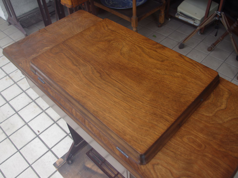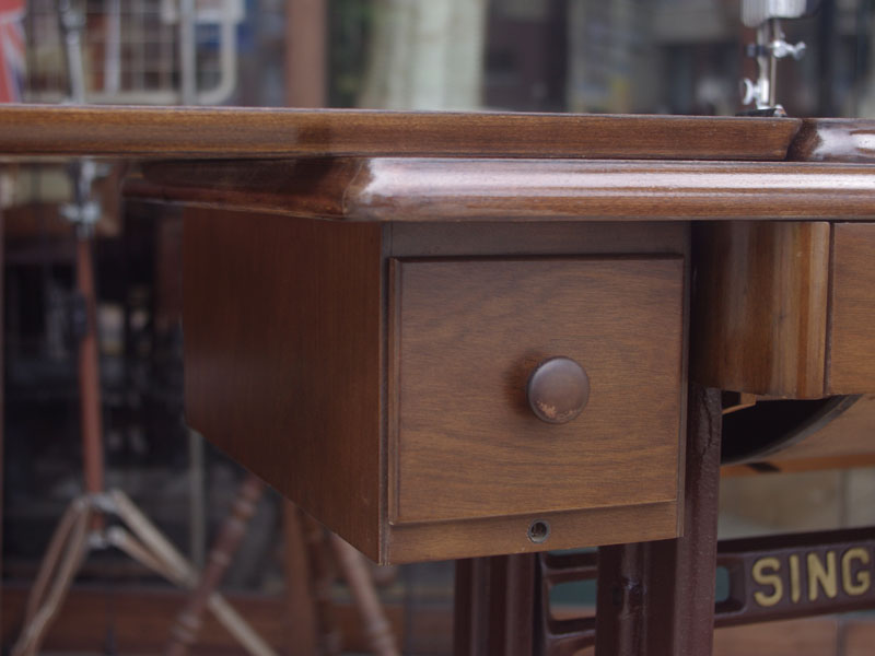 木製部分は傷んでいた部分を補修し、上を向いた広い面の塗装に傷がありましたので、古い塗装を落としたうえで再塗装をいたしました。塗料は耐久性を考えてウレタンを使用しました。脚は塗装の劣化が見られましたので分解クリーニングと再塗装および調整をいたしました。文字はオリジナルの金色が残っています!ベルト車やペダルがスムースに動くように分解しグリースアップ、注油、などをしております。最後にミシン本体とベルトで繋げて動きを確認しております。動作は特に静かです。