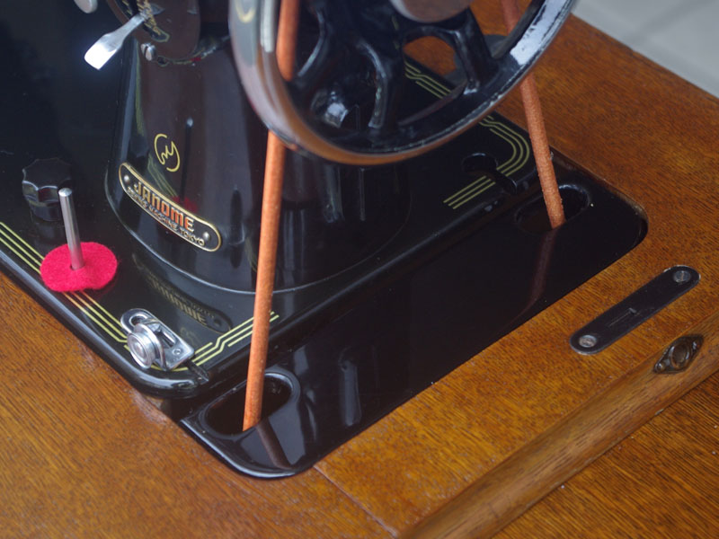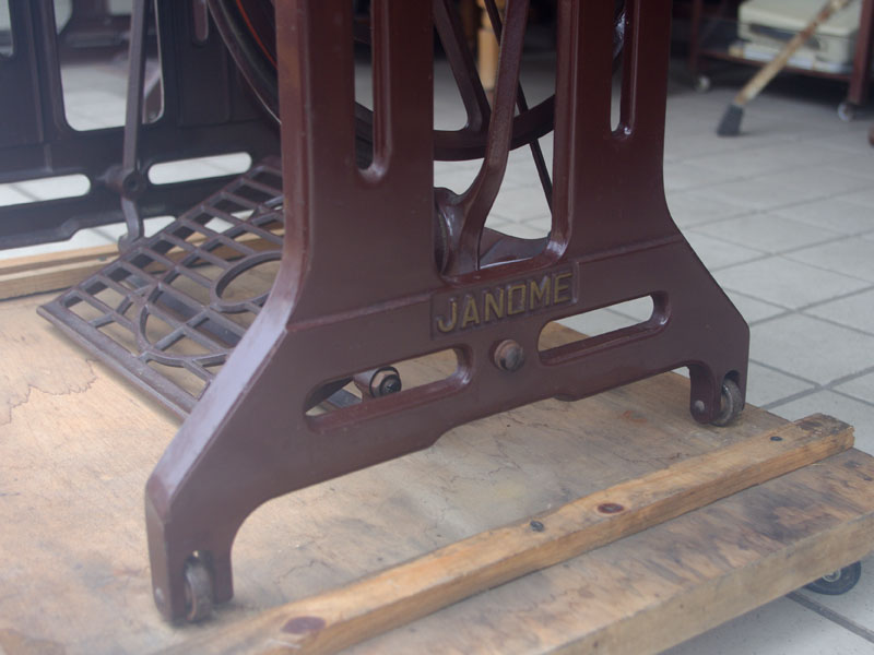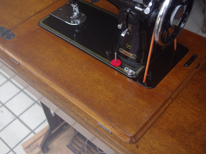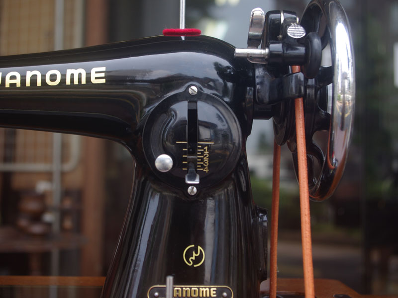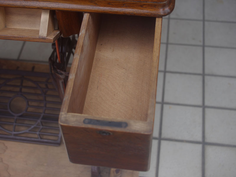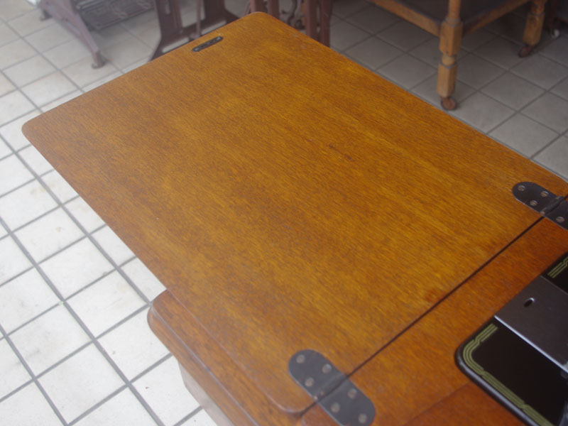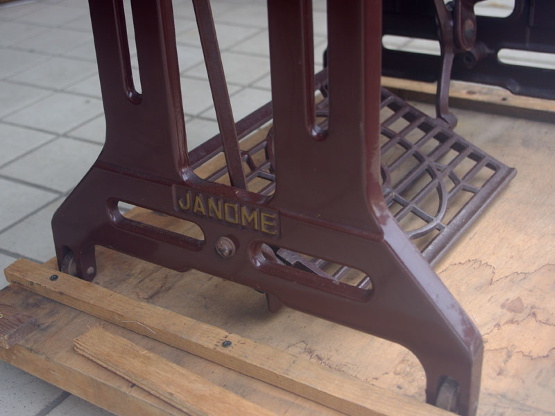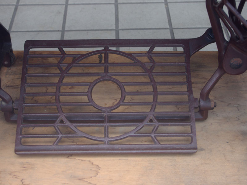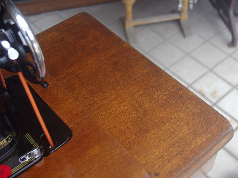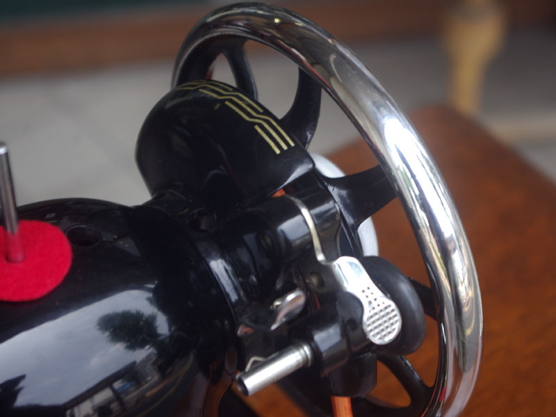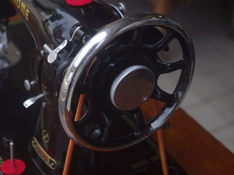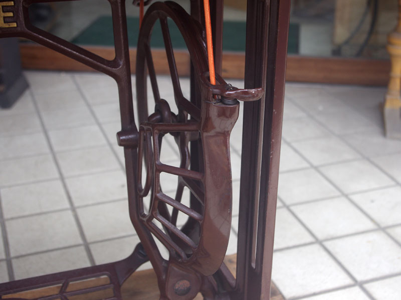 飴色の木製の台も整備して再塗装をしております。黒いミシン本体とツヤのある飴色の台がとてもカジュアルにもビンテージにも合う雰囲気になっています。塗料には天然樹脂シェラックニスおよび摩耗に強いウレタンを使用しました。熱いカップやアルコール、多少の水気は問題ありませんが花瓶の水などには注意して下さい。脚は分解クリーニングと調整をいたしました。塗装の状態は良かったためクリーニングにのみ留めておりますが、金色の文字の色も残っていて本体同様に状態の良さがうかがえるかと思います。ベルト車やペダルがスムースに動くように分解しグリースアップ、注油、などをしております。最後にミシン本体とベルトで繋げて動きを確認しております。