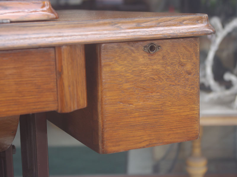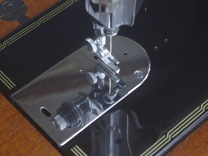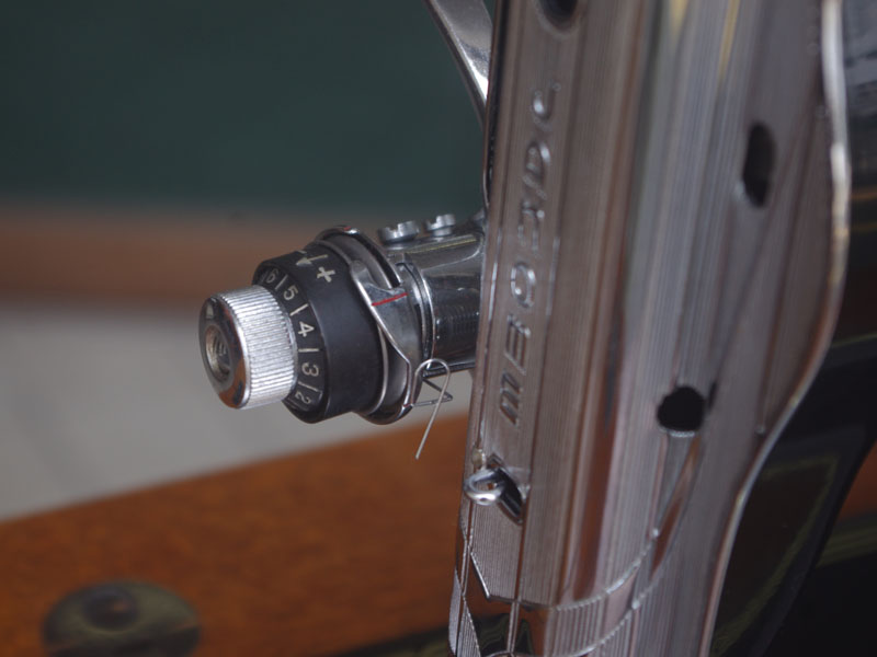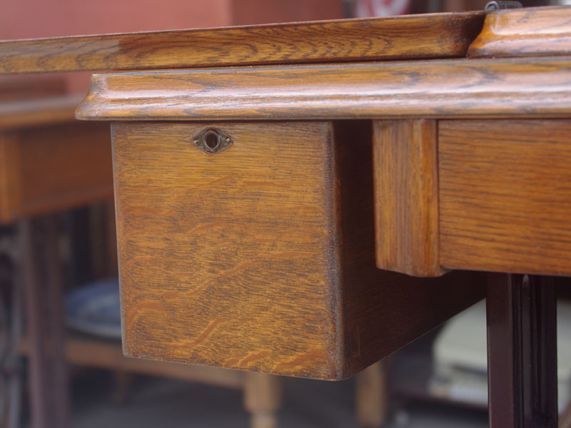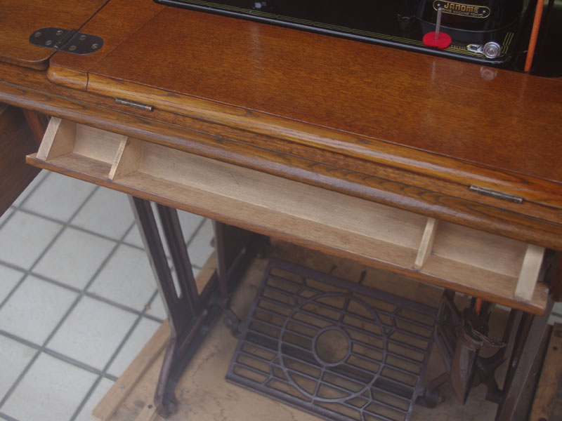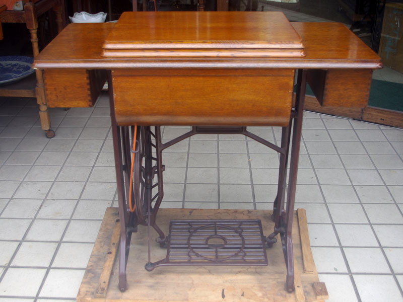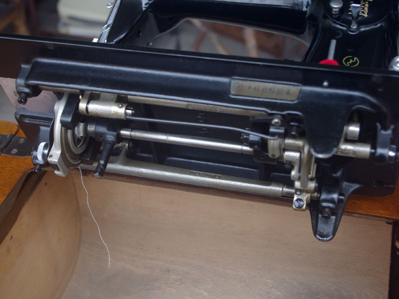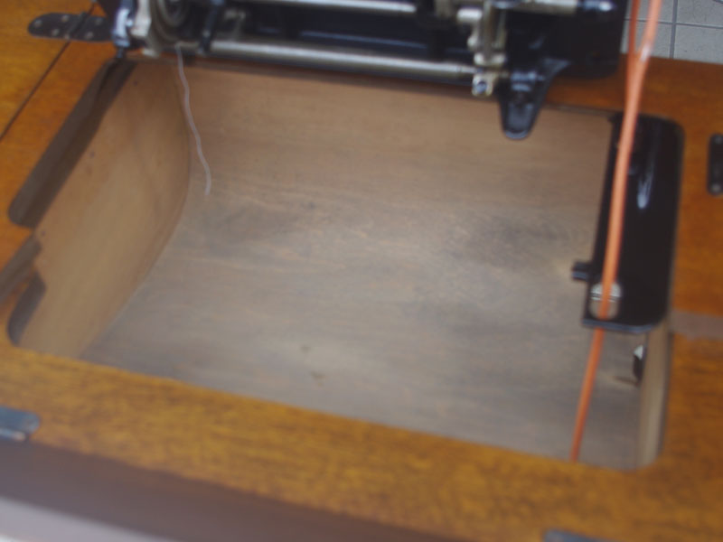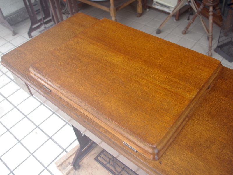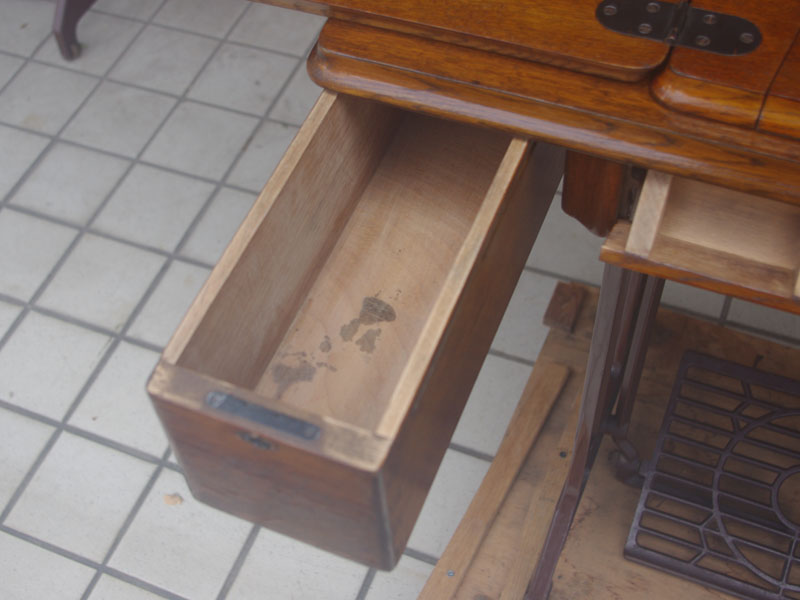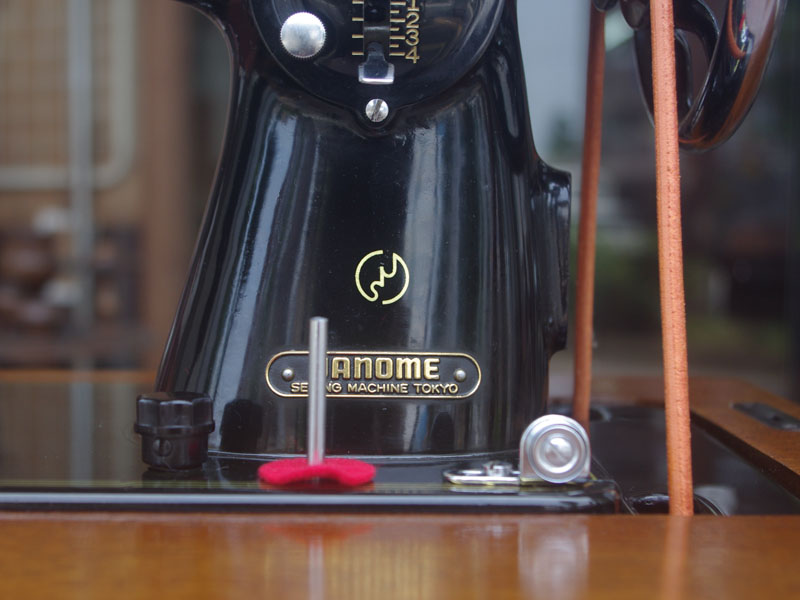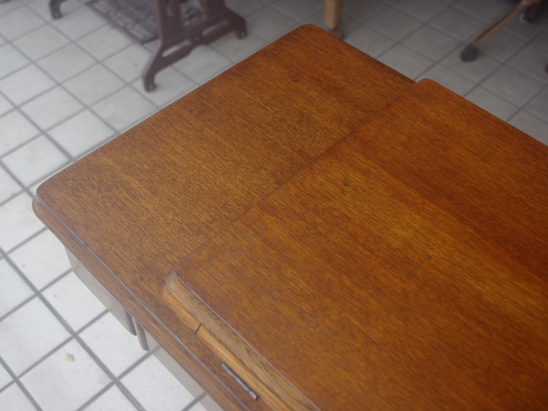 飴色の木製の台も整備して再塗装をしております。黒いミシン本体とツヤのある飴色の台がとてもカジュアルにもビンテージにも合う雰囲気になっています。塗料には天然樹脂シェラックニスおよび摩耗に強いウレタンを使用しました。熱いカップやアルコール、多少の水気は問題ありませんが花瓶の水などには注意して下さい。脚は分解クリーニングと調整をいたしました。塗装の状態は良かったためクリーニングにのみ留めておりますが、金色の文字の色も残っていて本体同様に状態の良さがうかがえるかと思います。ベルト車やペダルがスムースに動くように分解しグリースアップ、注油、などをしております。最後にミシン本体とベルトで繋げて動きを確認しております。