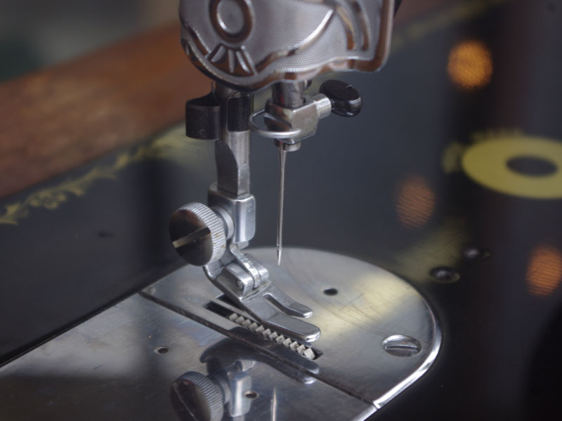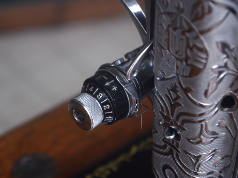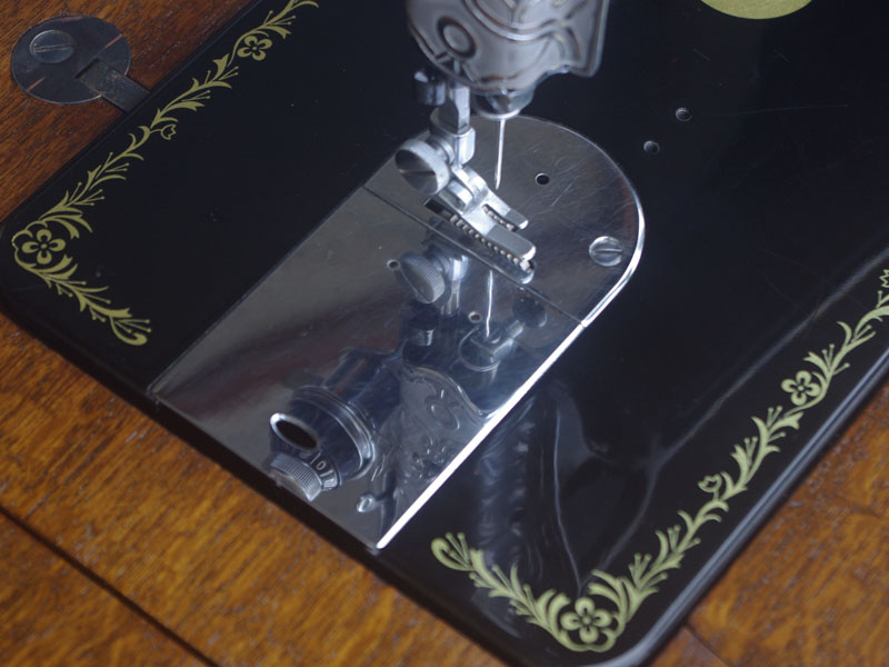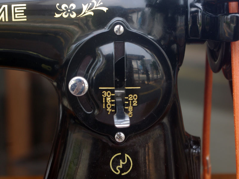 こちらのミシンも分解掃除をして古い汚れや錆を落としております。また、消耗品は交換、縫製に影響する傷などを取り除き、十分に使用できる状態に整備しております。消耗品である家庭用ミシン針・ボビンケース・ボビンなど市販されています(本体装着品は新品に交換済み)。レバー操作による縫い目長さの調整、また返し縫い機能があります。送り歯の高さを調整するダイヤルも付いています。別途穴かがり器をご用意いただければ、ボタンホールも縫えます。