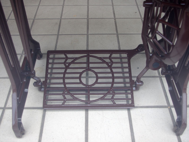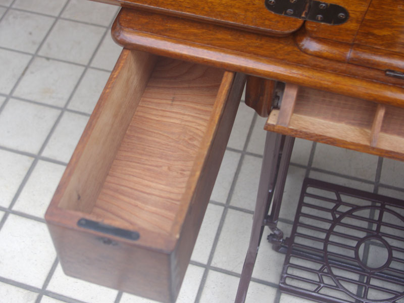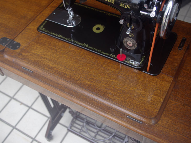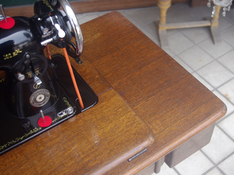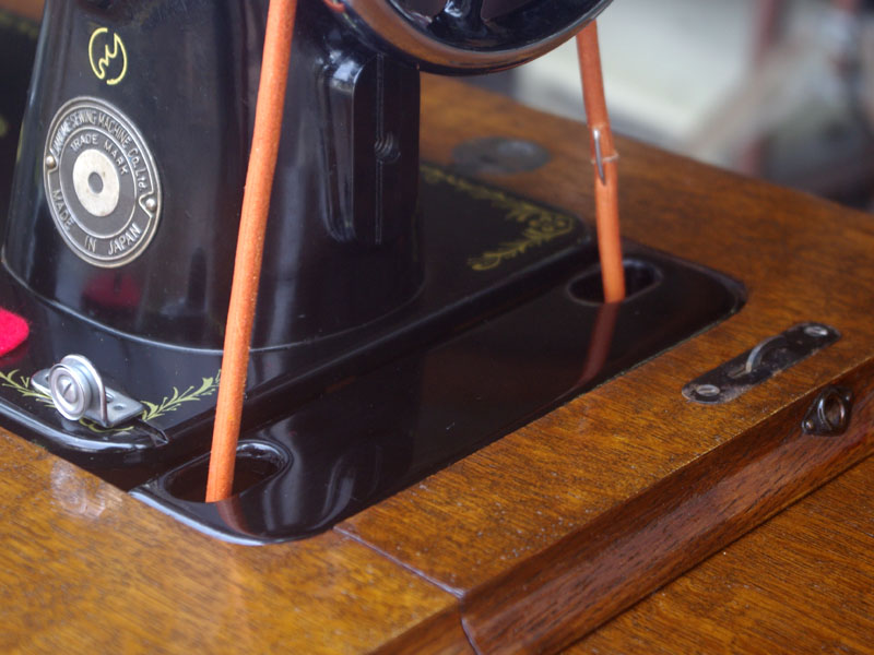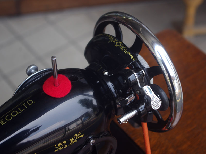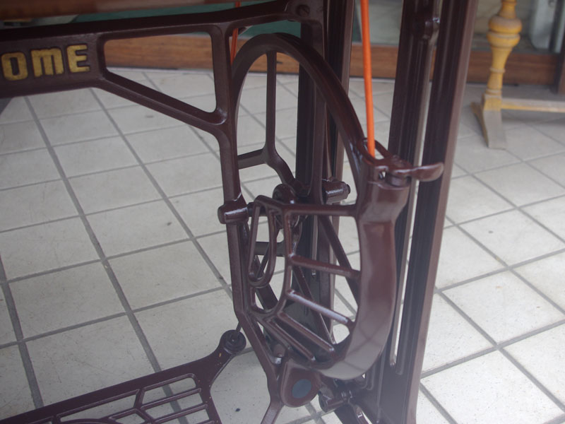 飴色の木製の台も整備して再塗装をしております。黒いミシン本体とツヤのある飴色の台がとてもカジュアルにもビンテージにも合う雰囲気になっています。塗料には天然樹脂シェラックニスおよび摩耗に強いウレタンを使用しました。熱いカップやアルコール、多少の水気は問題ありませんが花瓶の水などには注意して下さい。脚は分解クリーニングと調整、再塗装をいたしました。文字の部分はオリジナルの金色です。ベルト車やペダルがスムースに動くように分解し注油をしております。最後にミシン本体とベルトで繋げて動きを確認しております。