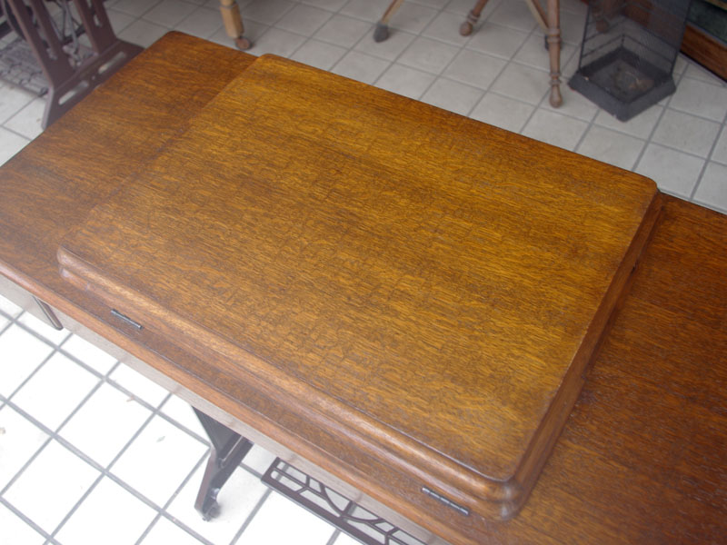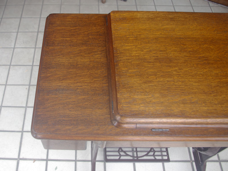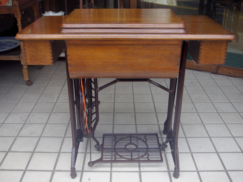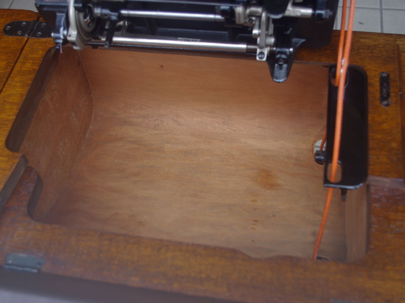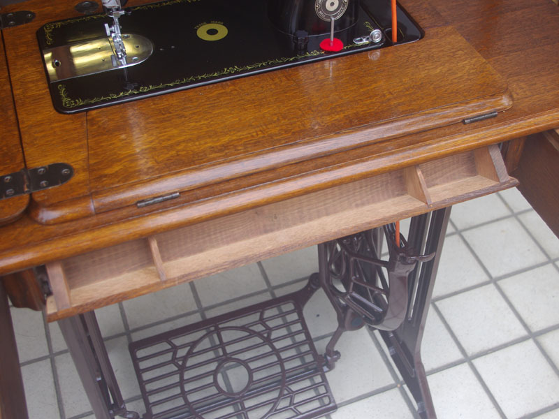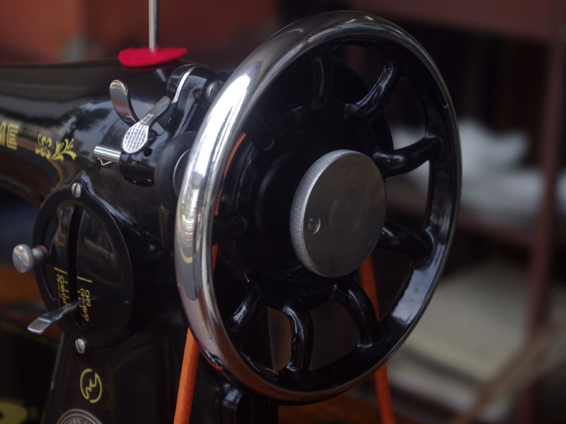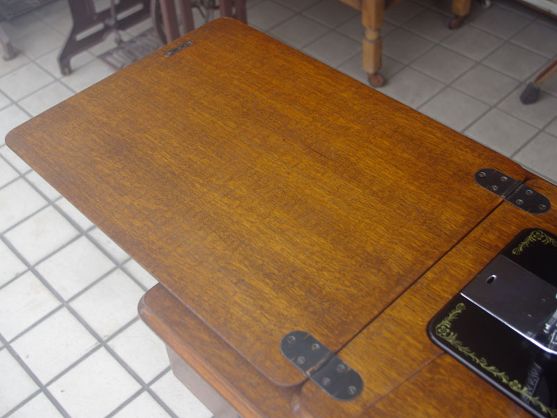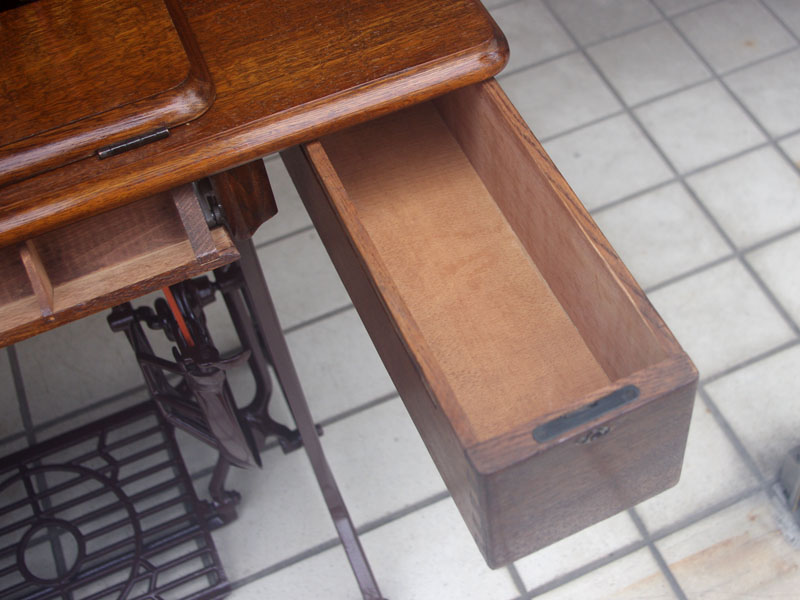 飴色の木製の台も整備して再塗装をしております。黒いミシン本体とツヤのある飴色の台がとてもカジュアルにもビンテージにも合う雰囲気になっています。塗料には天然樹脂シェラックニスおよび摩耗に強いウレタンを使用しました。熱いカップやアルコール、多少の水気は問題ありませんが花瓶の水などには注意して下さい。脚は分解クリーニングと調整、再塗装をいたしました。文字の部分はオリジナルの金色です。ベルト車やペダルがスムースに動くように分解し注油をしております。最後にミシン本体とベルトで繋げて動きを確認しております。