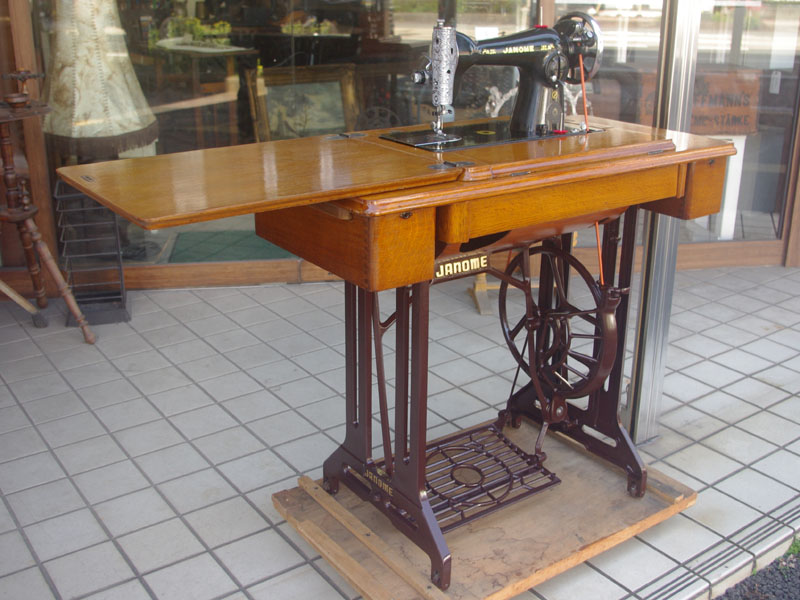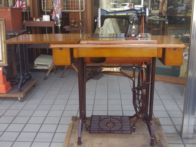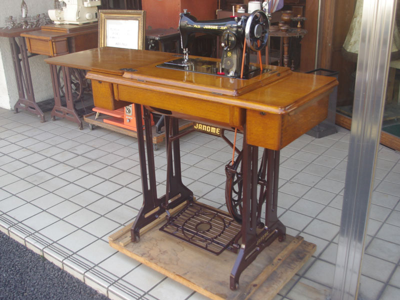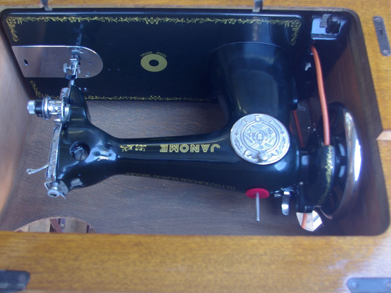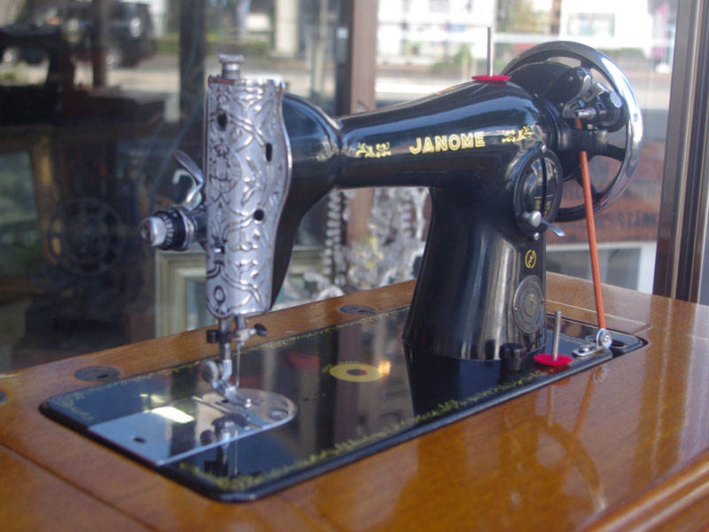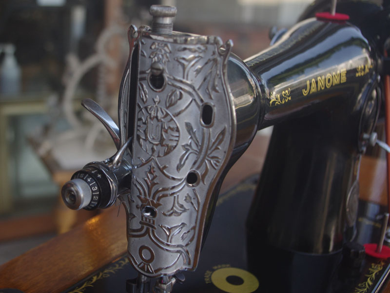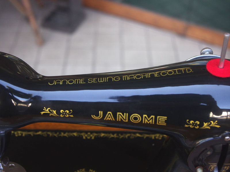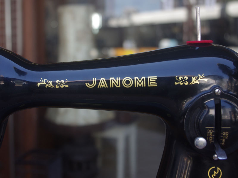 日本製のジャノメの足踏みミシンです。ジャノメは今でも日本を代表するミシンメーカーで歴史は100年を超えています。本機は戦後のミシンですが、メーカーとして技術が円熟してきた時期だと思われます。というのも戦前のジャノメのミシンに比べると圧倒的に機械の精度や品質が上がっていて、また同じ時代の他のメーカーのミシンと比較しても非常に精度が高く工夫も凝らされている箇所が見られるのがこの頃のジャノメの特徴だからです。本機も動作は安定して、音も静か、縫い目もきれいで言うことがありません。絵柄や黒い塗装もしっかりと残っており、レトロでありながら非常に美しい状態を保っている、そんなミシンです。