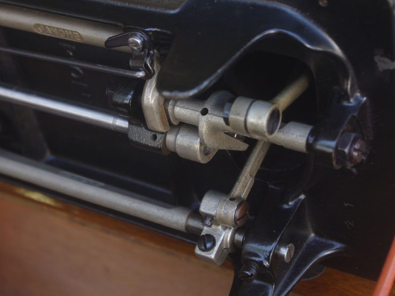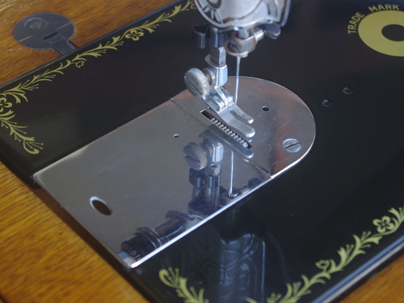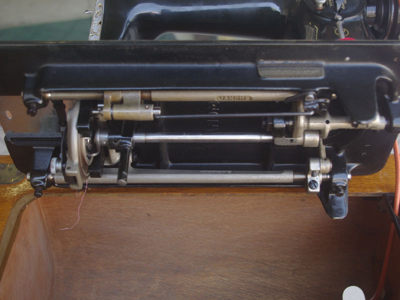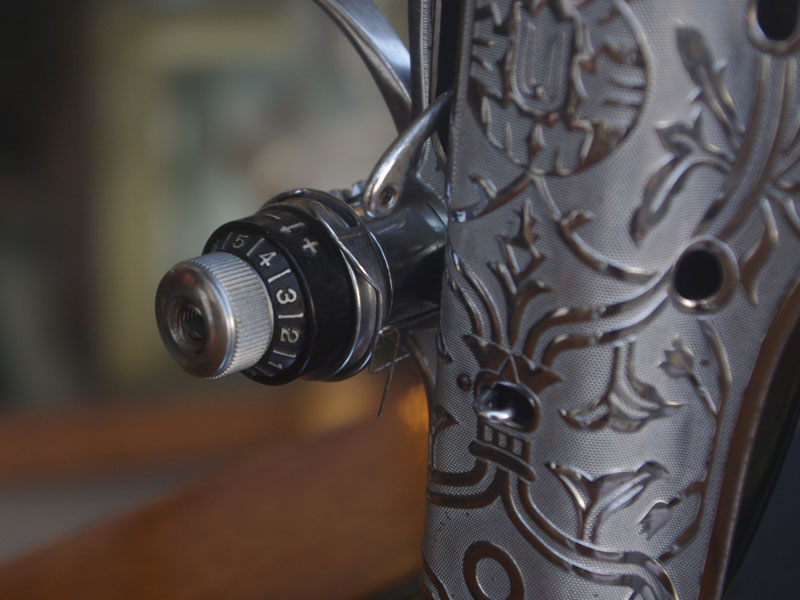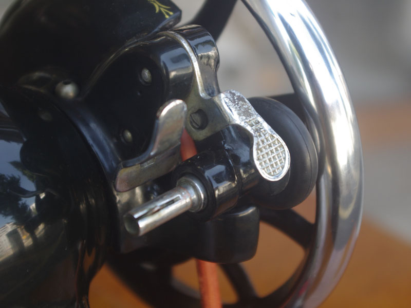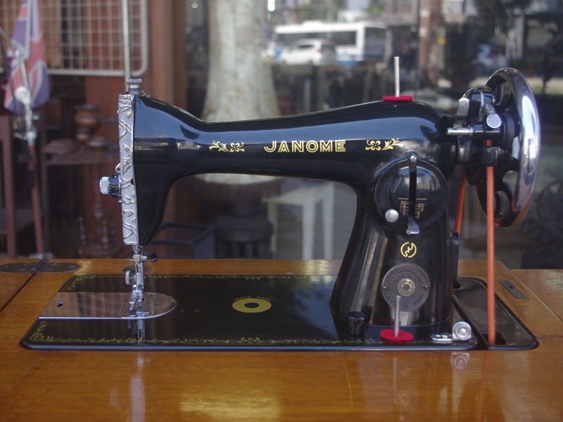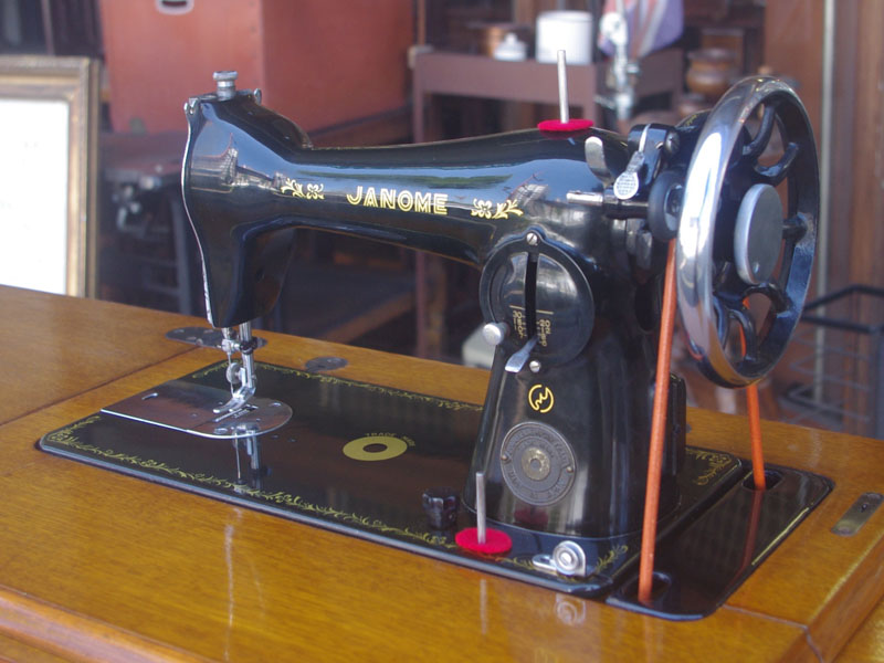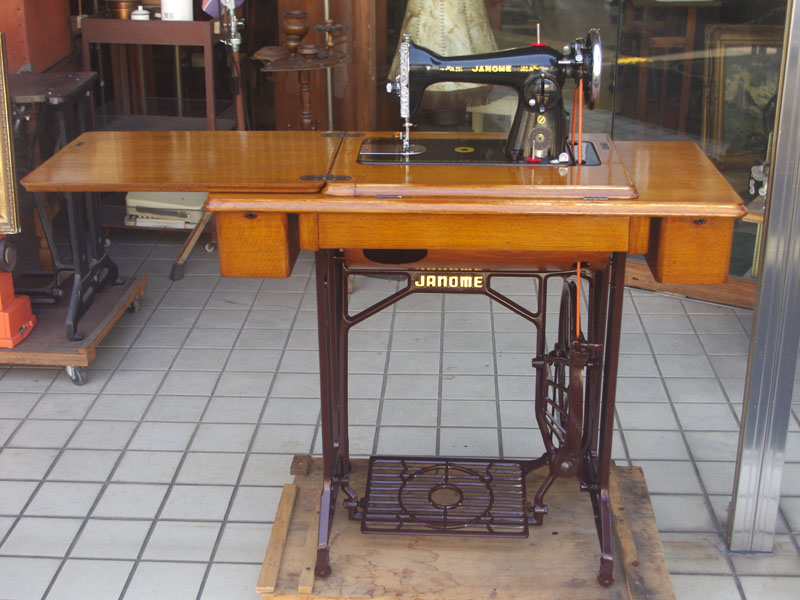 日本製のジャノメの足踏みミシンです。ジャノメは今でも日本を代表するミシンメーカーで歴史は100年を超えています。本機は戦後のミシンですが、メーカーとして技術が円熟してきた時期だと思われます。というのも戦前のジャノメのミシンに比べると圧倒的に機械の精度や品質が上がっていて、また同じ時代の他のメーカーのミシンと比較しても非常に精度が高く工夫も凝らされている箇所が見られるのがこの頃のジャノメの特徴だからです。本機も動作は安定して、音も静か、縫い目もきれいで言うことがありません。絵柄や黒い塗装もしっかりと残っており、レトロでありながら非常に美しい状態を保っている、そんなミシンです。