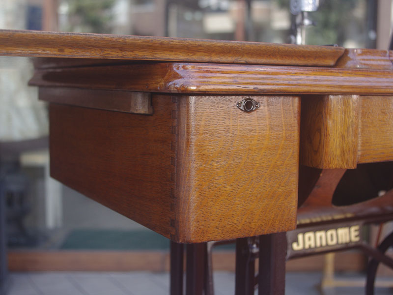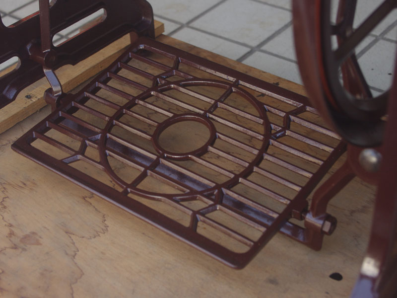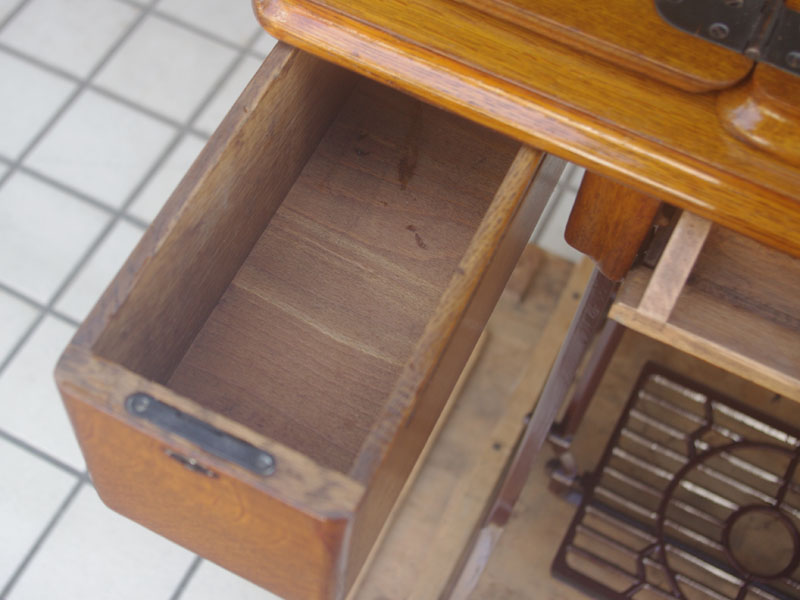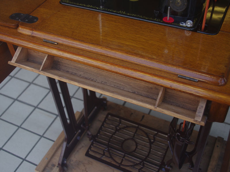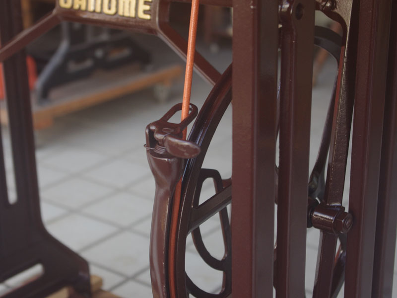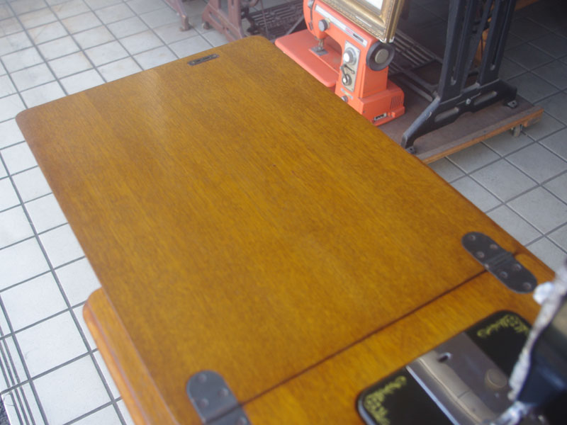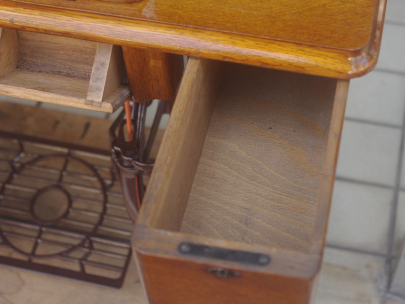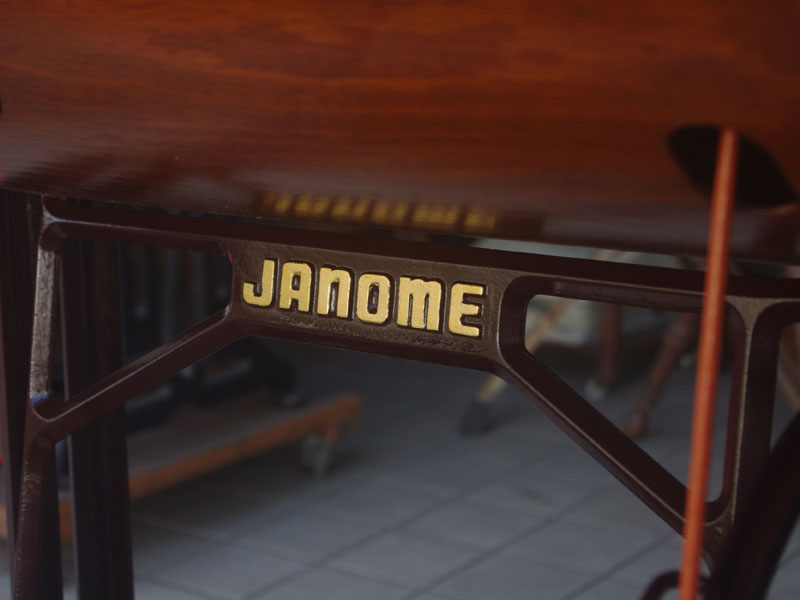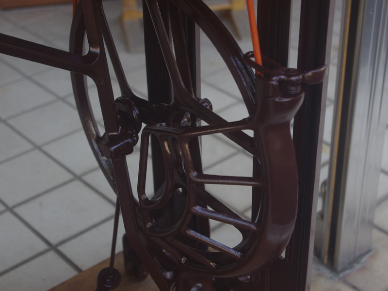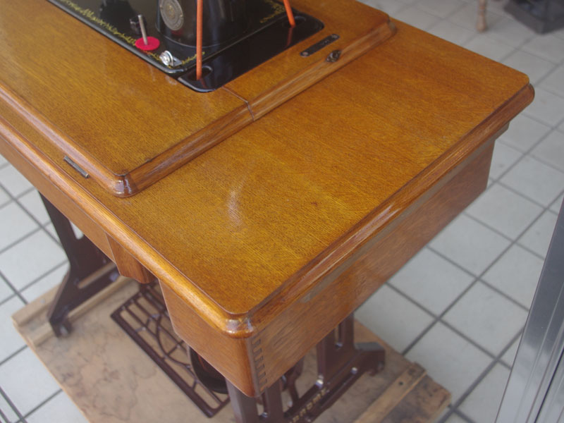 木製の台も弱っている箇所を補修し、古い塗装を落として再塗装いたしました。塗料には天然樹脂シェラックニスおよび摩耗に強いウレタンを使用しました。熱いカップやアルコール、多少の水気は問題ありませんが花瓶の水などには注意して下さい。脚は分解クリーニングをおこない再塗装をいたしました。最後に調整とグリースアップ、ミシン本体とベルトで繋げて動きを確認しております。